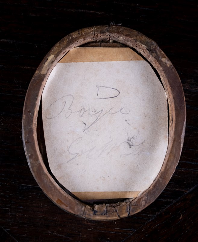 The work is well done with fine gilded details to the hair and earring. Some browning to the paper and wear to the frame but displays well overall.
