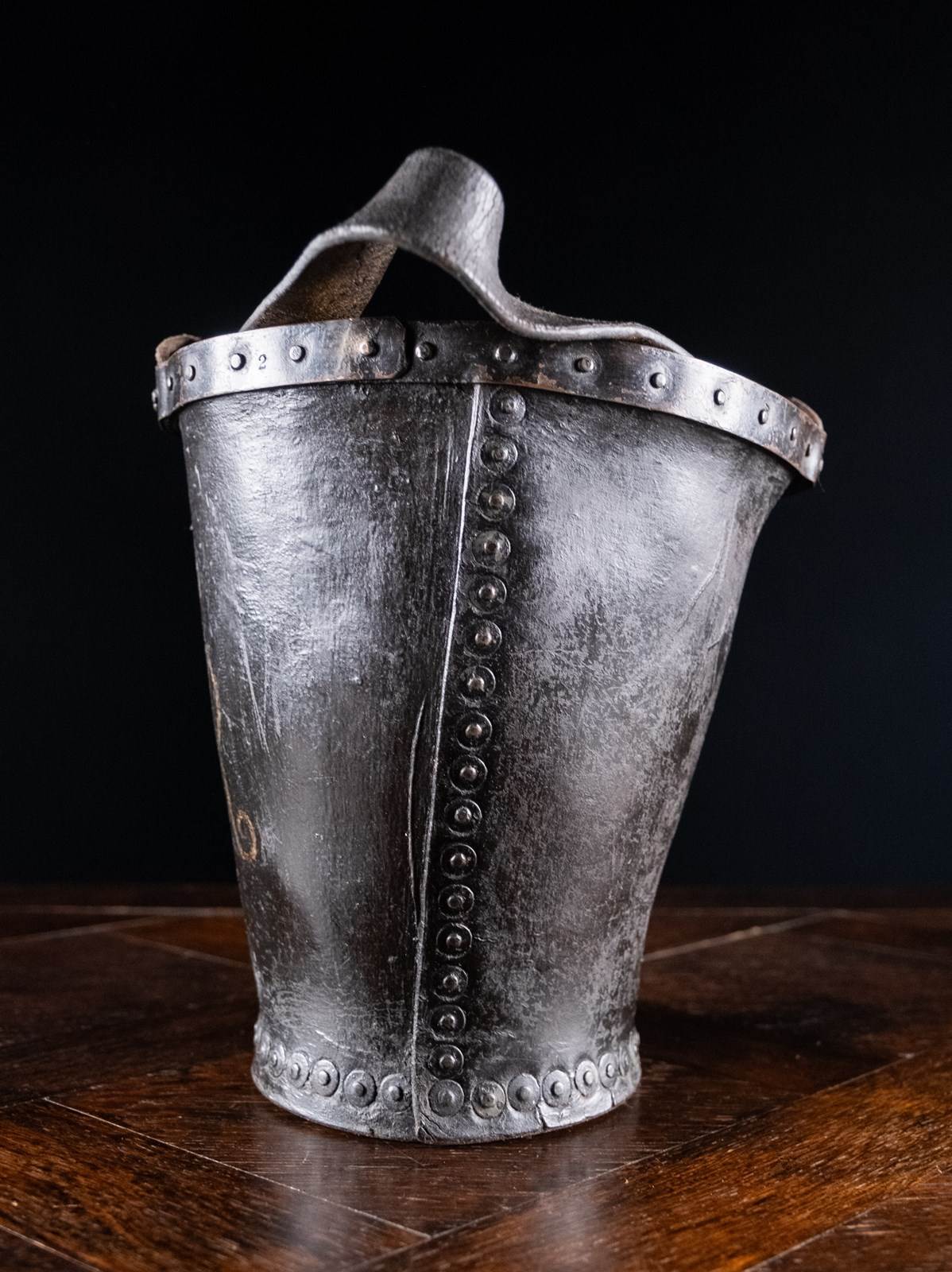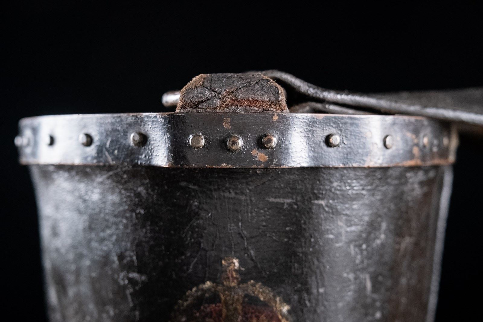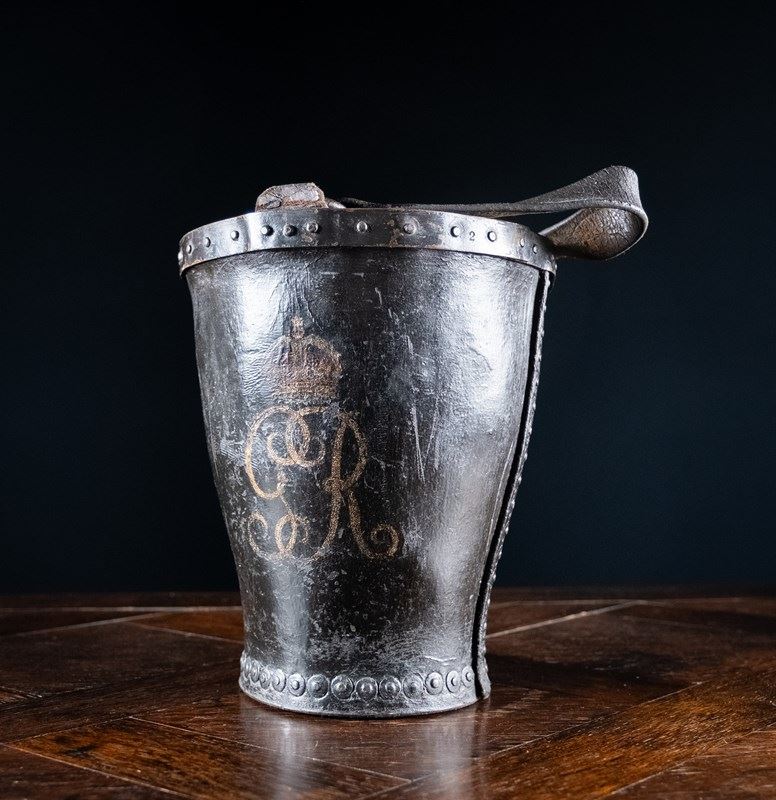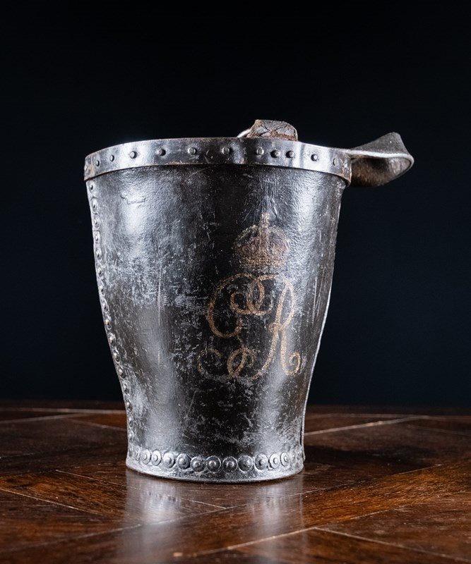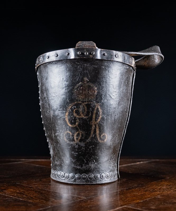 The bucket is of a wonderful form and colour throughout with the George V cypher painted in gilt and red to the front. The whole remains strong and sturdy with its original leather handle.
