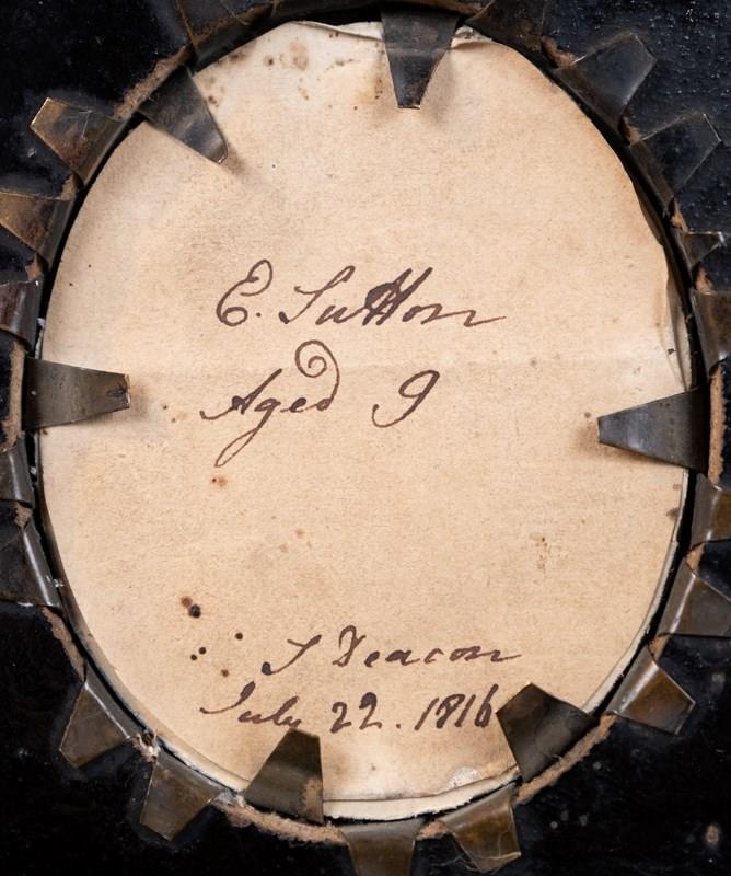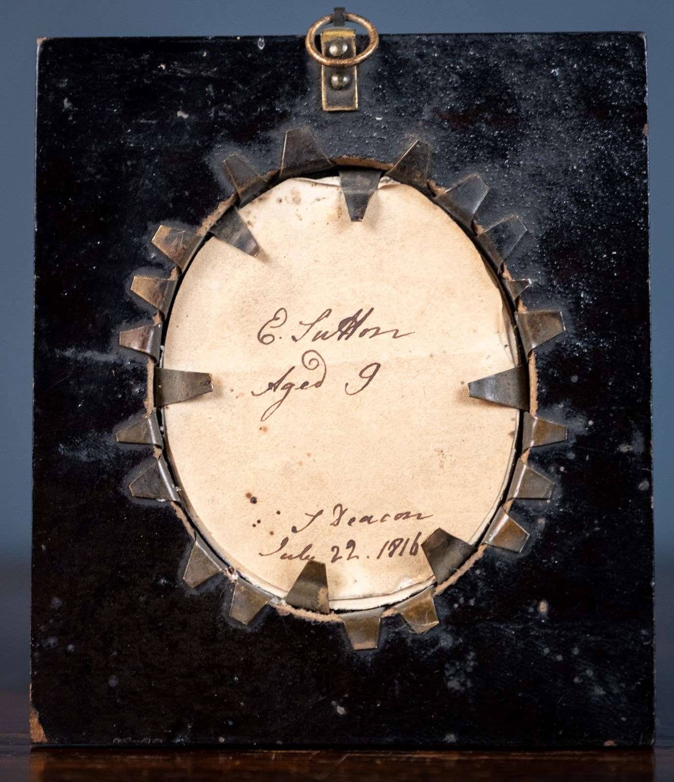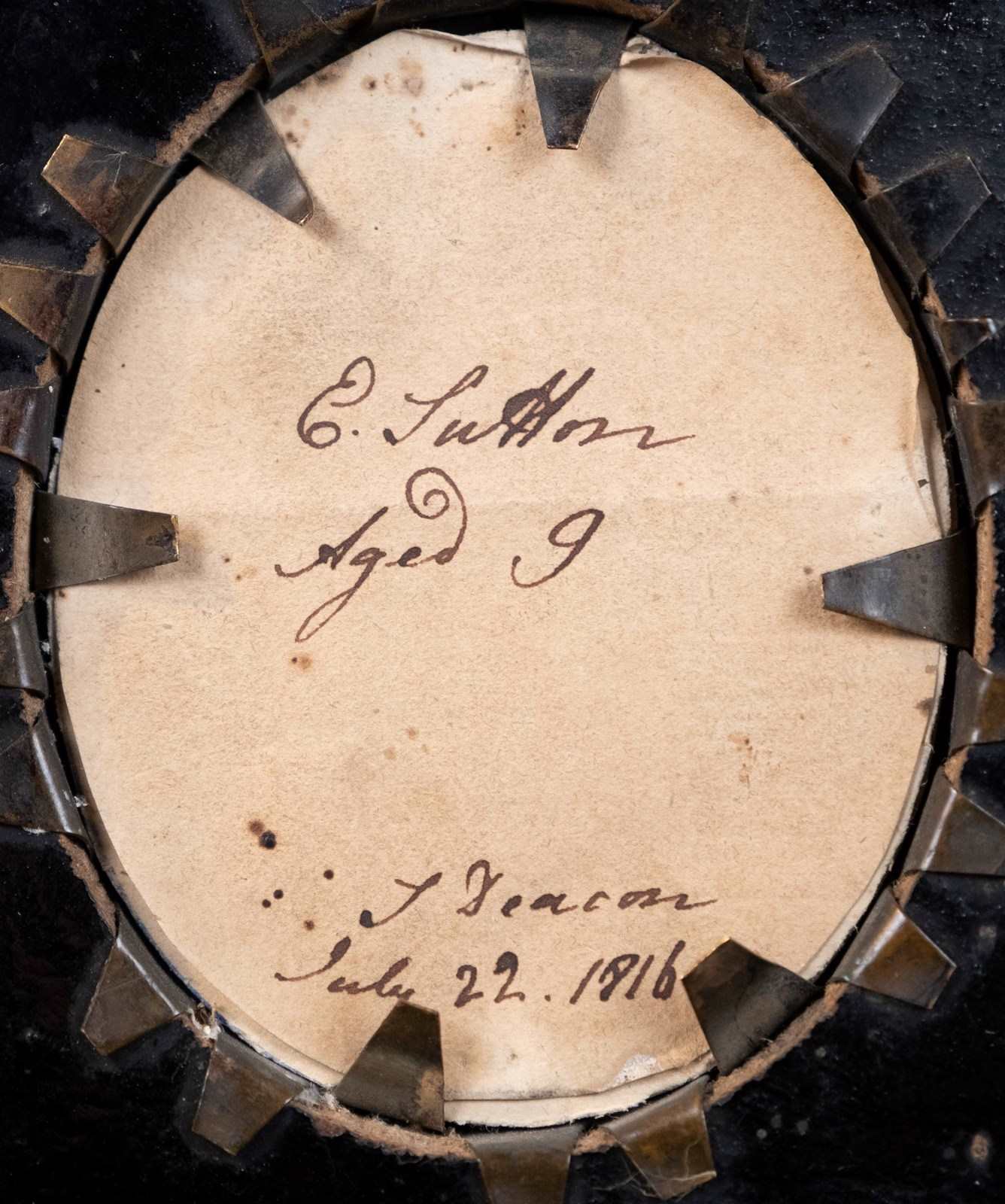 A charming Regency period bronzed silhouette portrait, identified verso as 'E Sutton, Aged 9' and signed 'J Deacon, July 22 1816'.