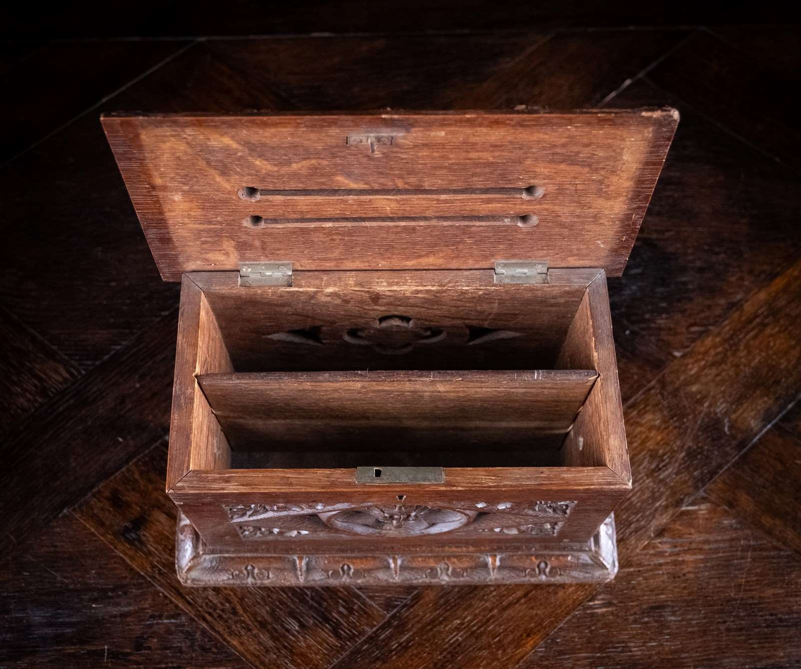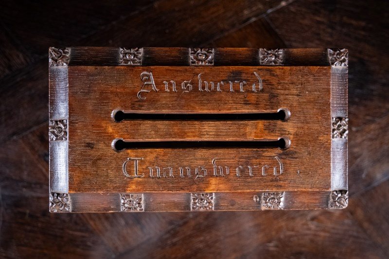 The box boasts finely carved tracery to all sides with two slot openings to the top for 'Answered' and 'Unanswered' letters. The hinged lid opens with a key to reveal a divided interior; a compartment for each slot.