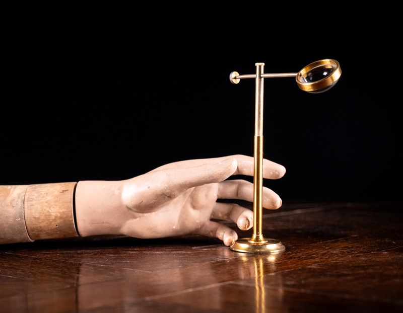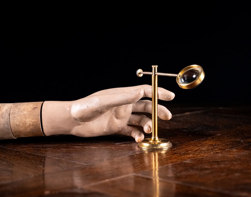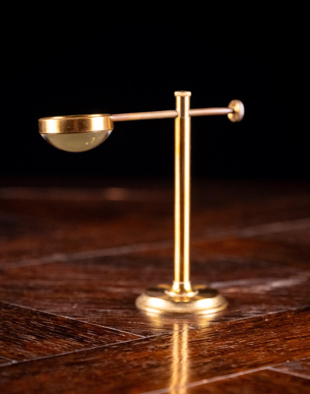 A lacquered brass bullseye condenser desk magnifying glass, c.1910. This instrument would have originally been used to direct light from a candle or lamp on to a specimen for observation, particularly when using a microscope.