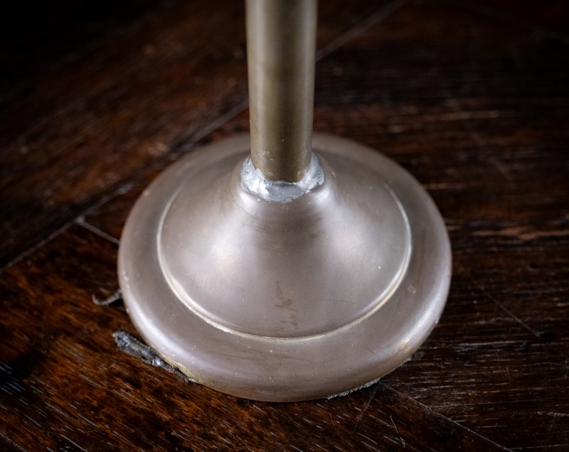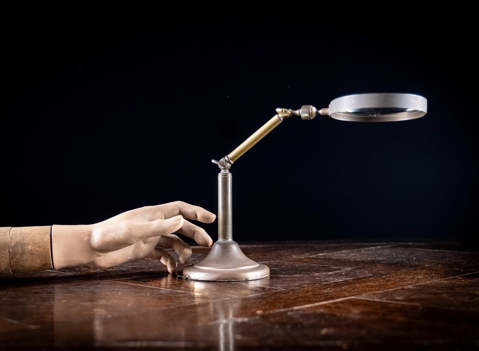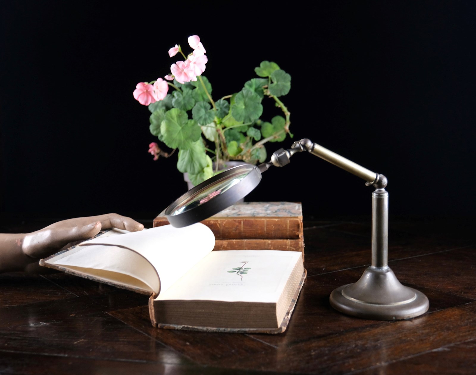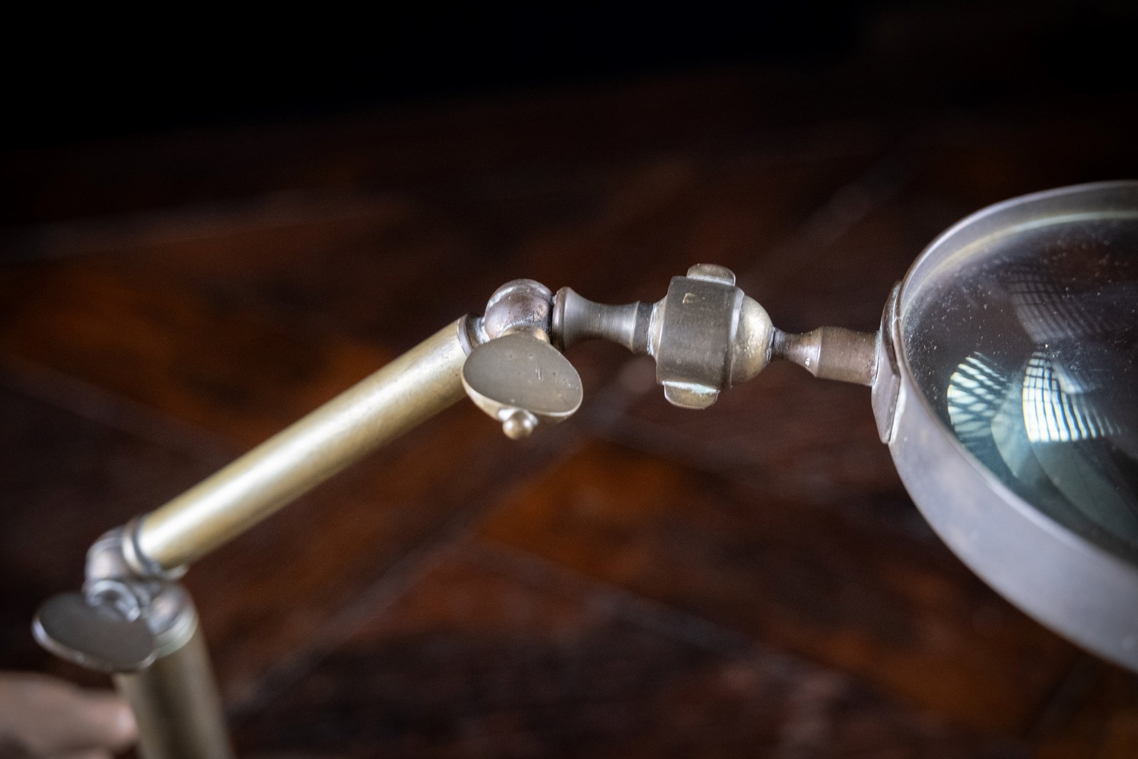 The weighted domed base supports two adjustable stems and terminates in a large brass rimmed magnifying lens.