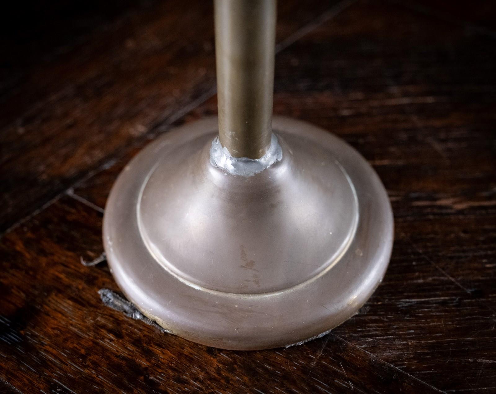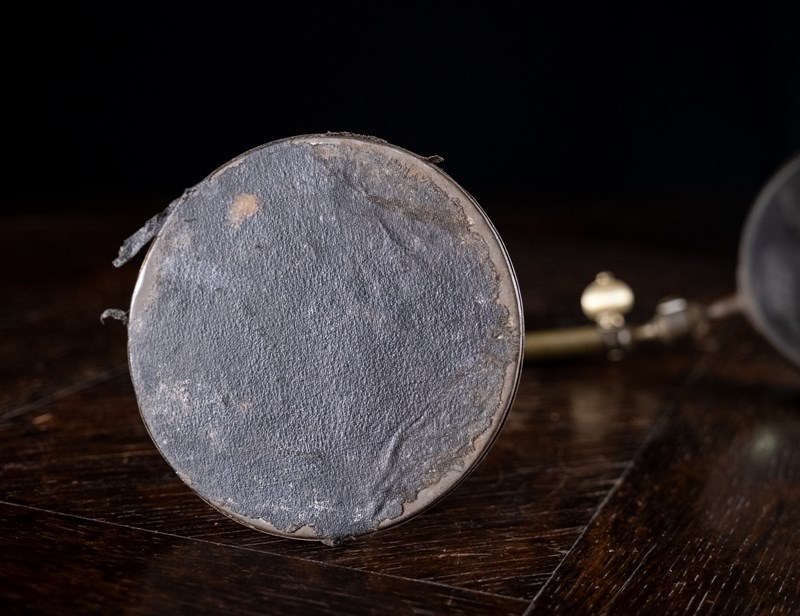 The angle-poise has various knocks and repairs from its years of use. The stem has been historically re-soldered to the base and the leather underside of the base is fraying to the extremities. The magnifier lens ball joint is seized. The adjustable stem and keys work as they should. The lens itself remains in a very good condition.