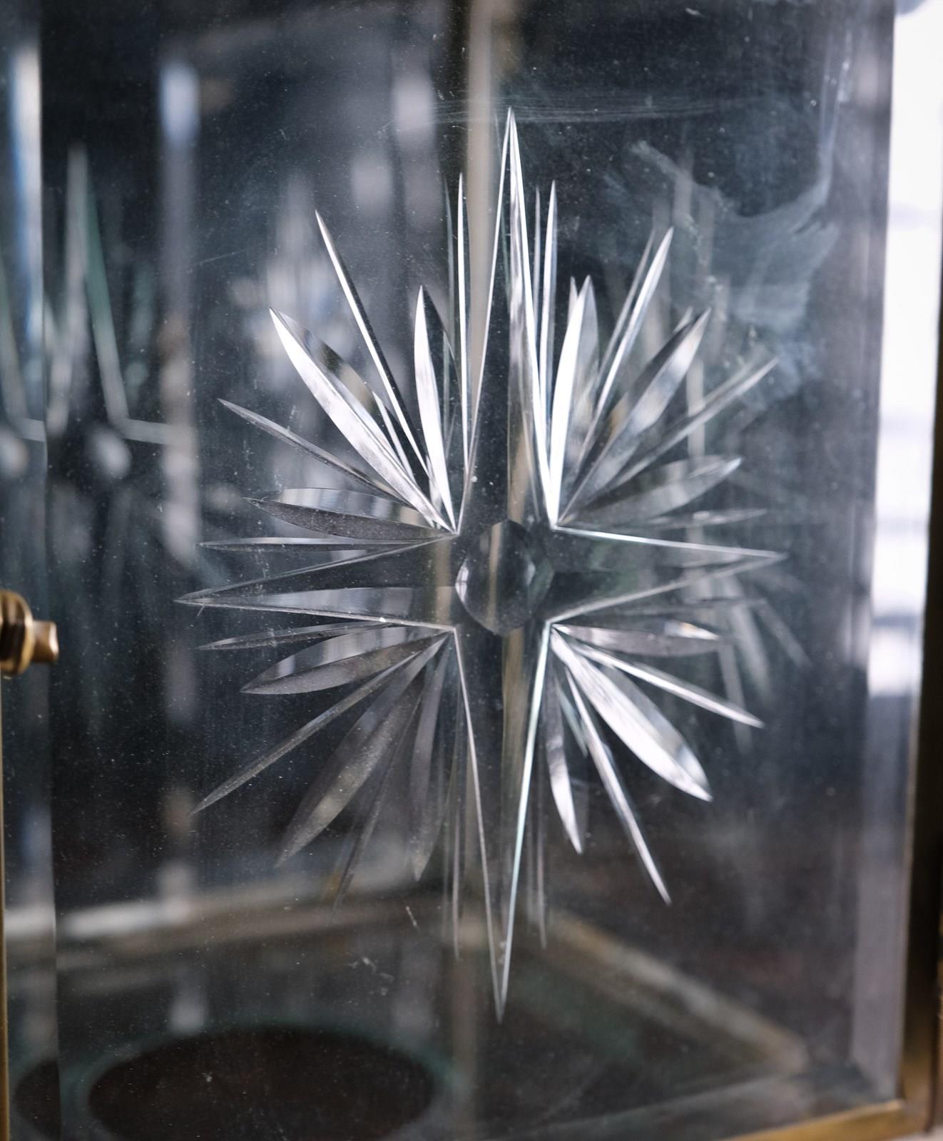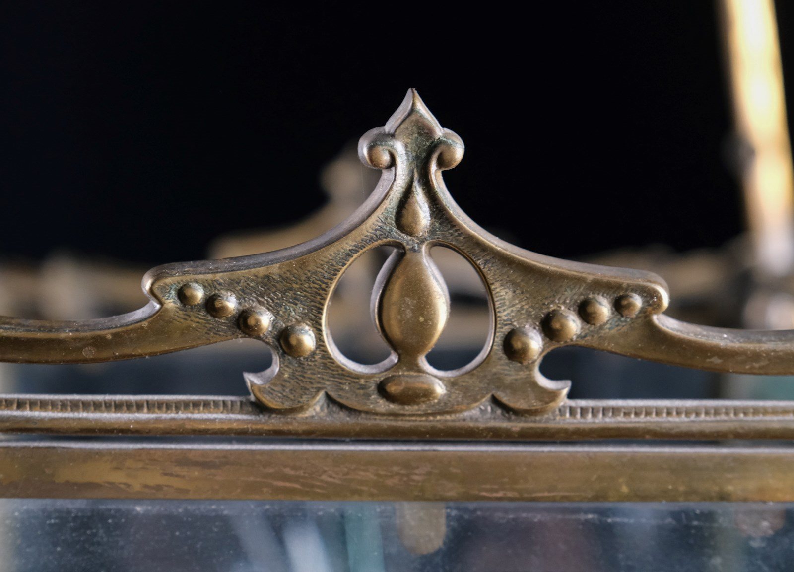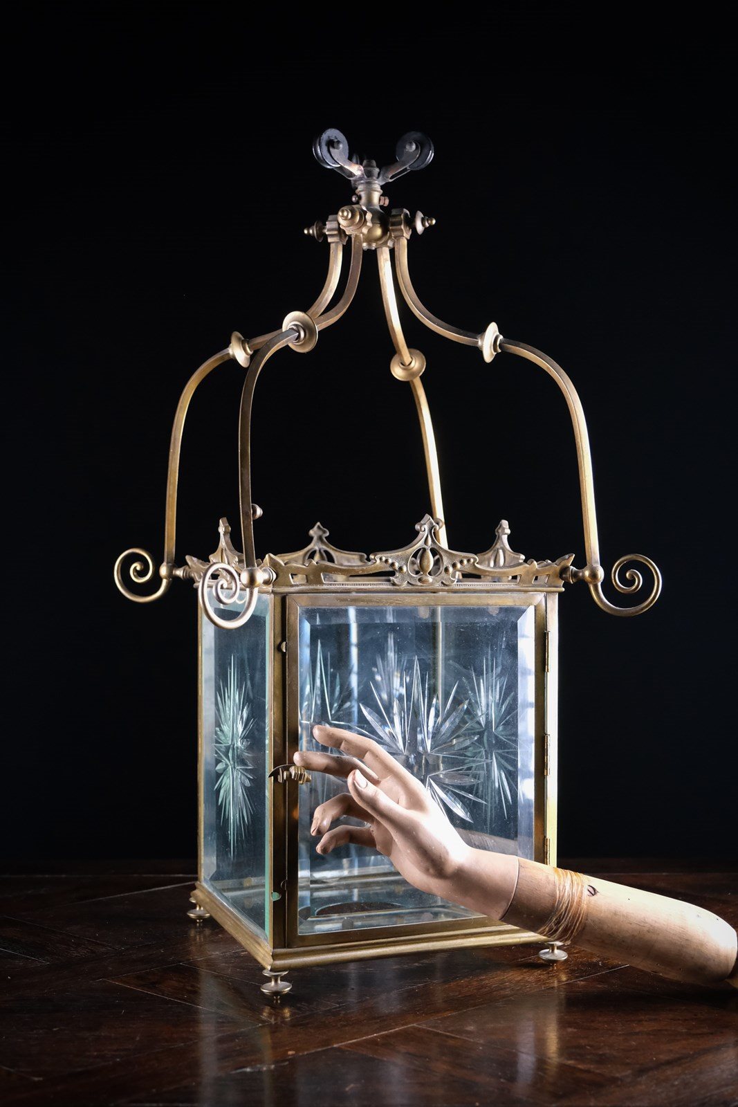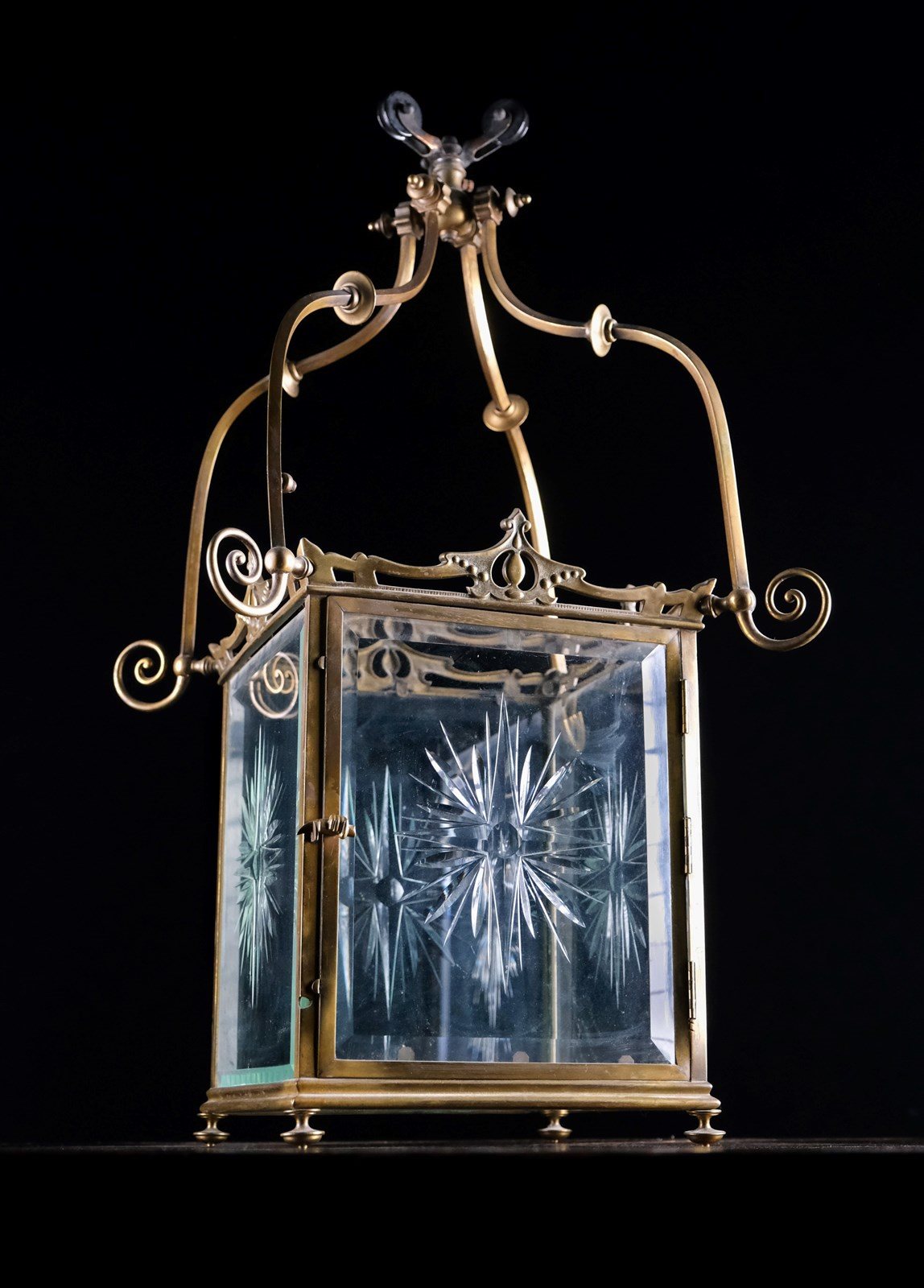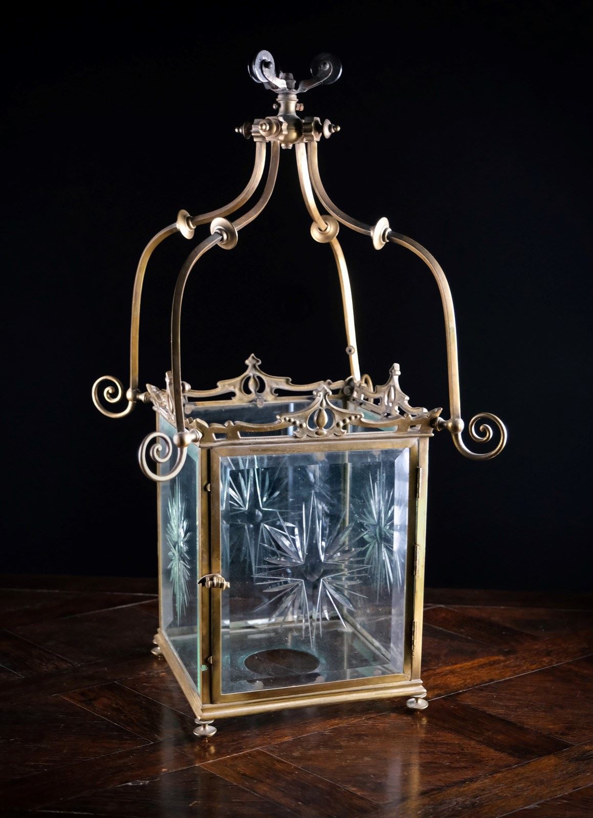 The swept arms terminate in fine spirals above a brass lantern frame with an intricate art-nouveau design to the top edge. The thick bevelled glass panels each boast finely cut stars which glisten when illuminated. The panel door is opened with a classical 'scroll in hand' finial