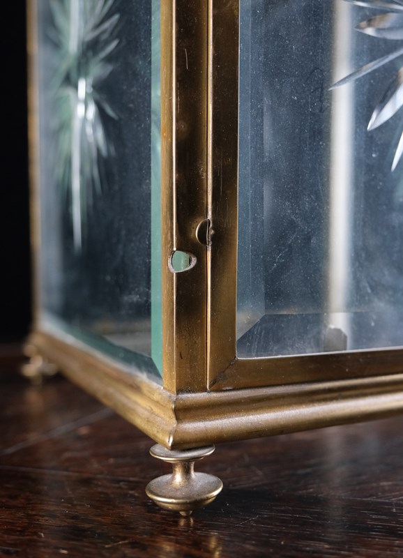 There is some light wear commensurate with age as is to be expected, namely some light scratches to the glass in areas and a very small nibble to the circular cut out edge in the bottom panel. There are two small cut outs in the brass lantern frame (please see photographs); these are uniform, in identical places in the frame and thus appear deliberate, likely to enable glass extraction.