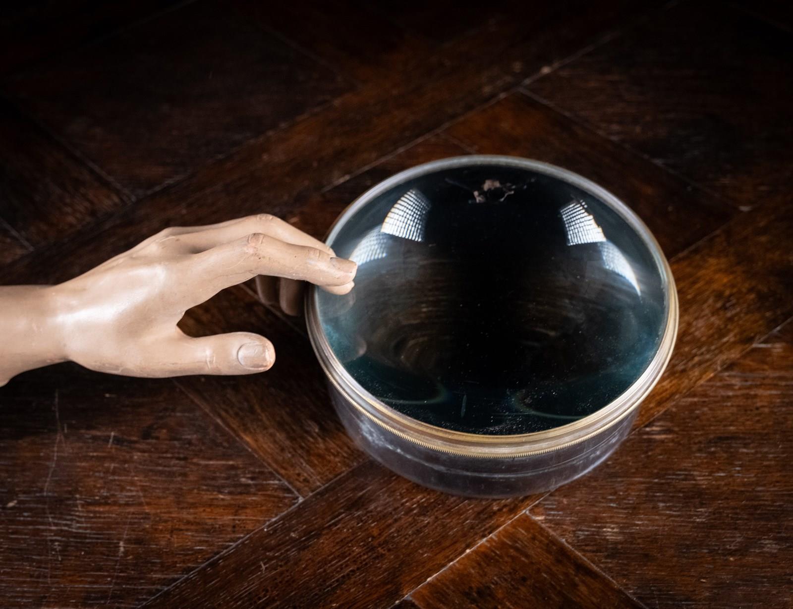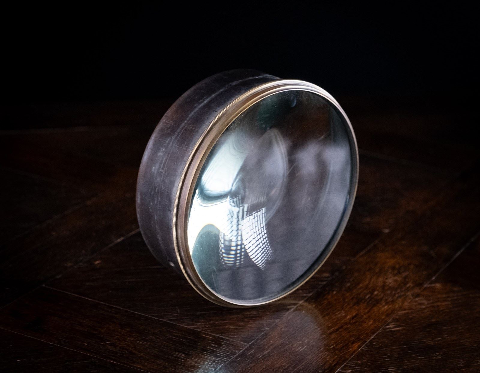 The large lens is mounted in a brass body with ribbed detailing to the outer edge. The brass surround has two holes to each time indicating the lens was mounted upon a support originally.