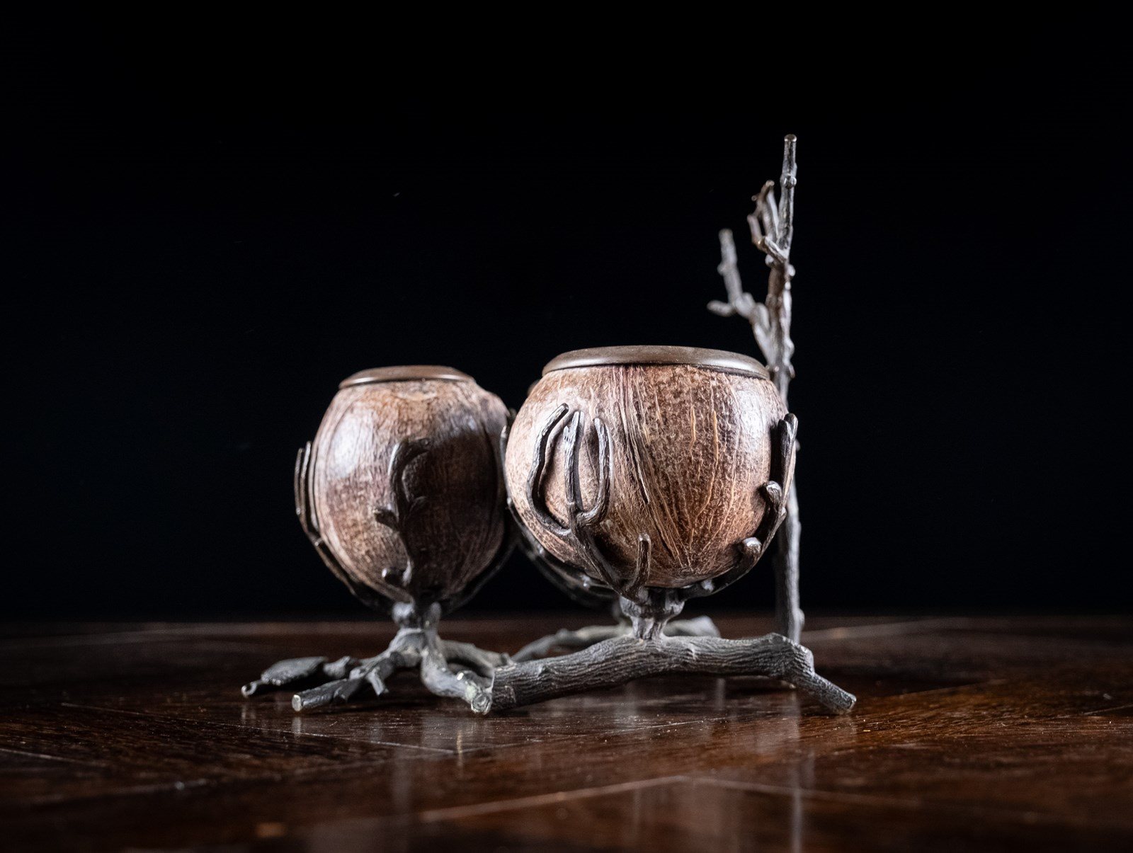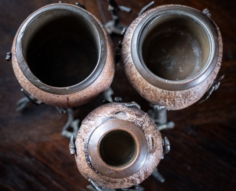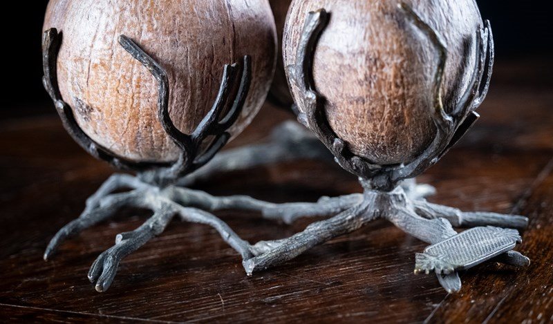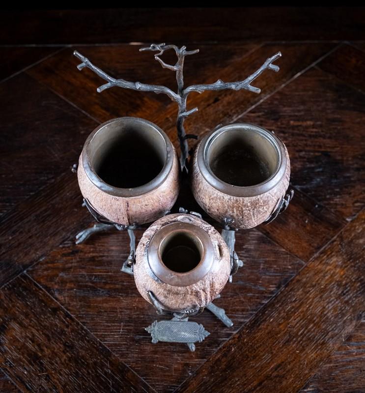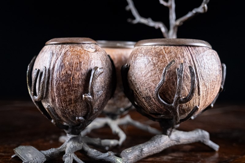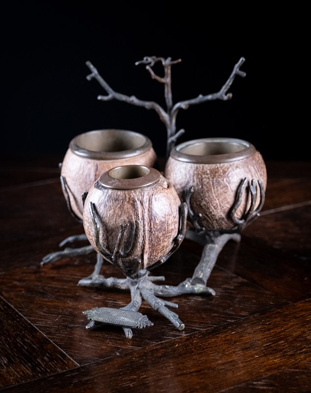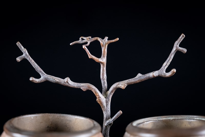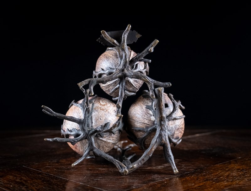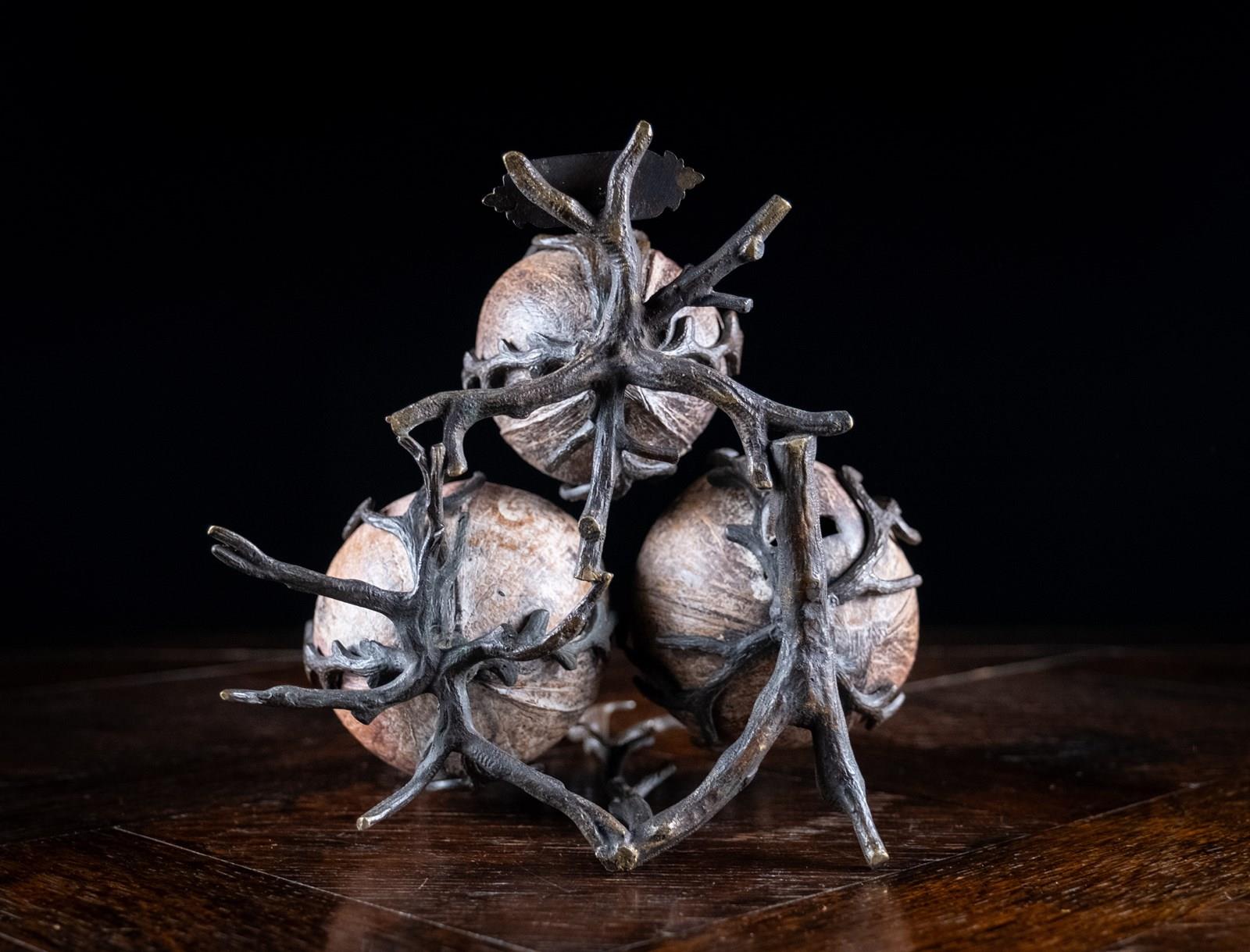 The tree form bronze branch top fans out above three hollowed out and lined coconuts nestled amongst bronze branches, all of which descend into thicker root-like structures with a bronze match striker to the fore.