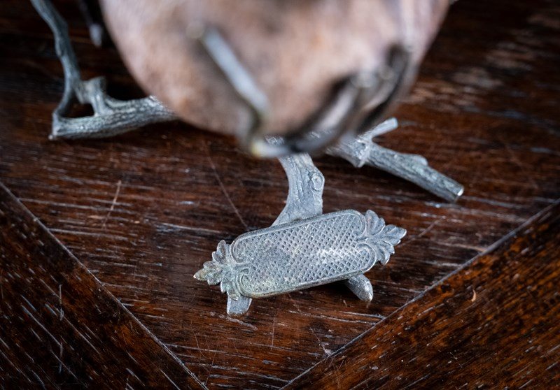 A highly unusual late 19th century bronze and coconut table vesta of large proportions, c.1880. Originally likely a country house smoking companion but now fully functional as a table vesta for toothpicks, candle matches, small cutlery etc.