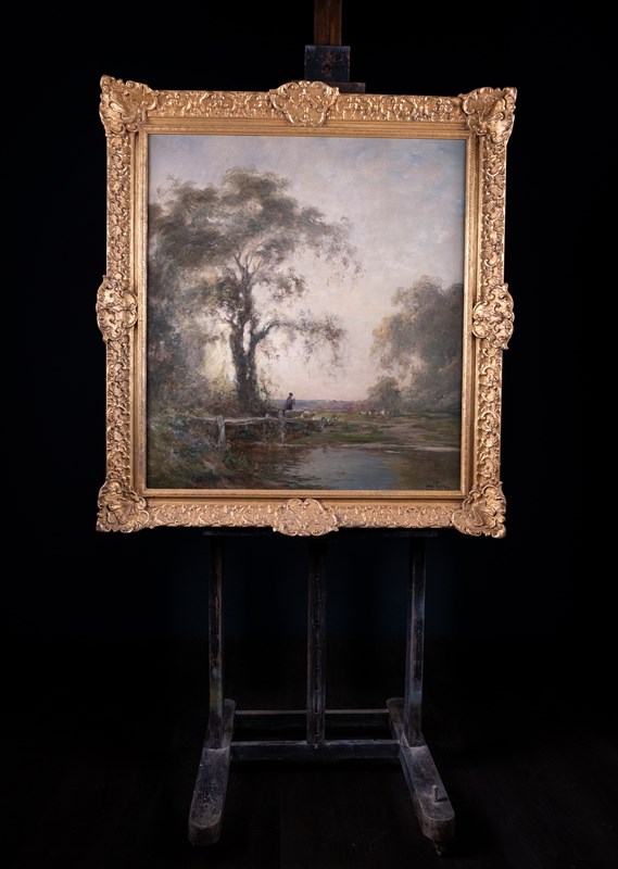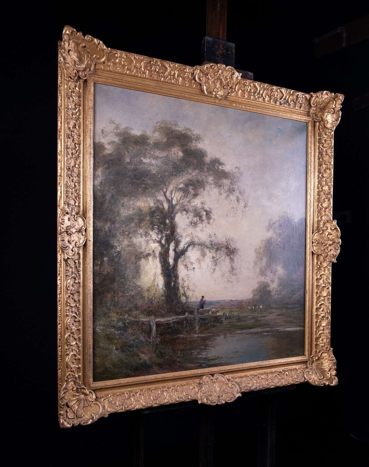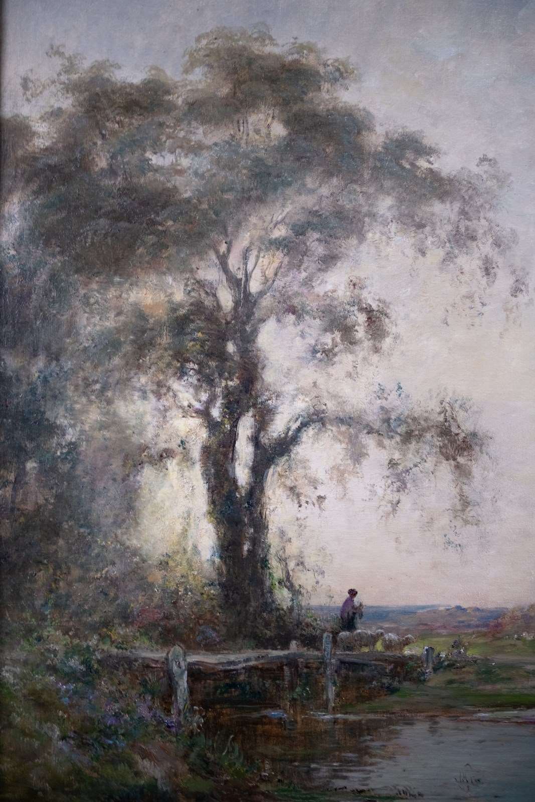 This striking landscape scene depicts a shepherdess and her sheep crossing a small footbridge with the landscape extending out into background. The dominant subject of the landscape is the tree which has been masterfully painted reaching up into the morning sky. The whole work has an almost dream like quality.