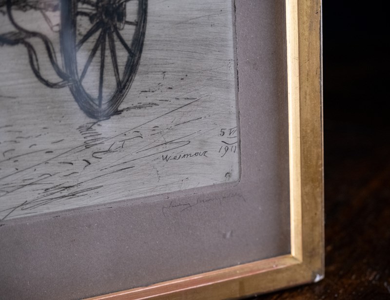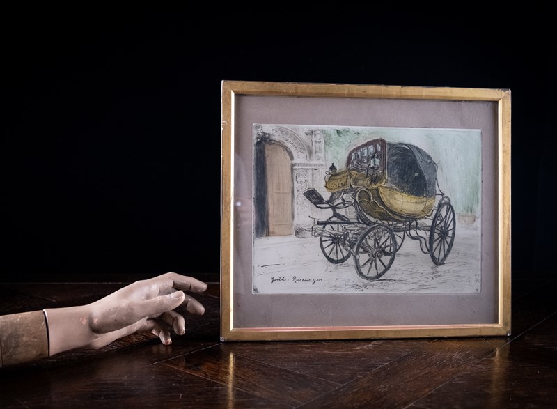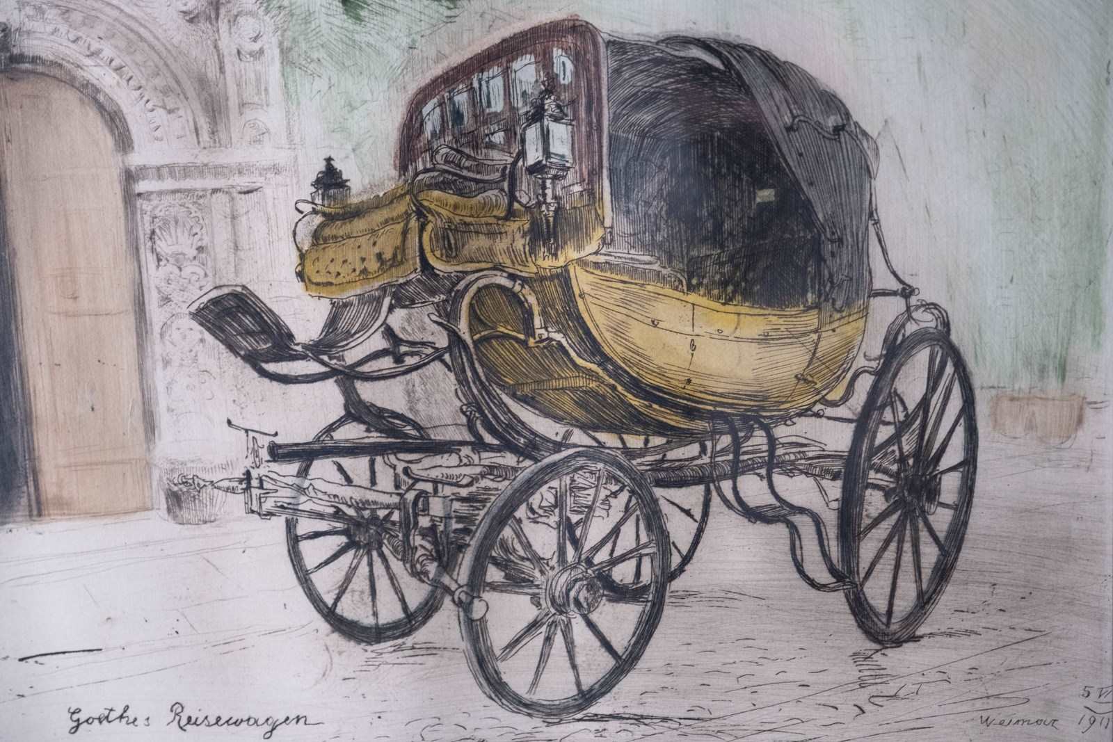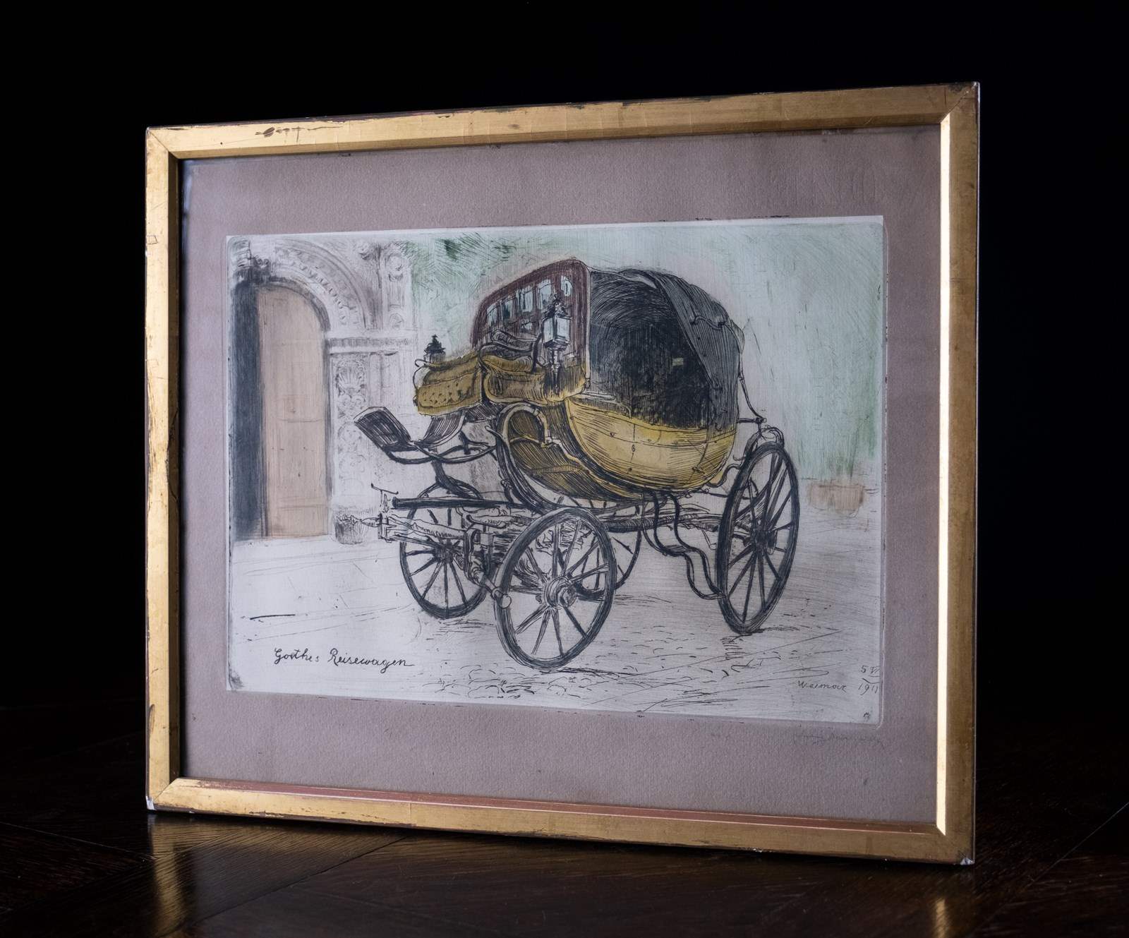 A hand-coloured etching of 'Goethe's Reisewagen' ('Goethe's Travelling Carriage'), dated 1911. Signed beneath the plate.