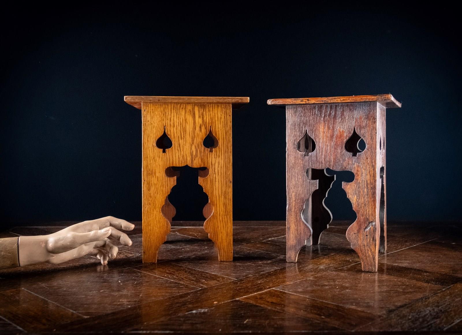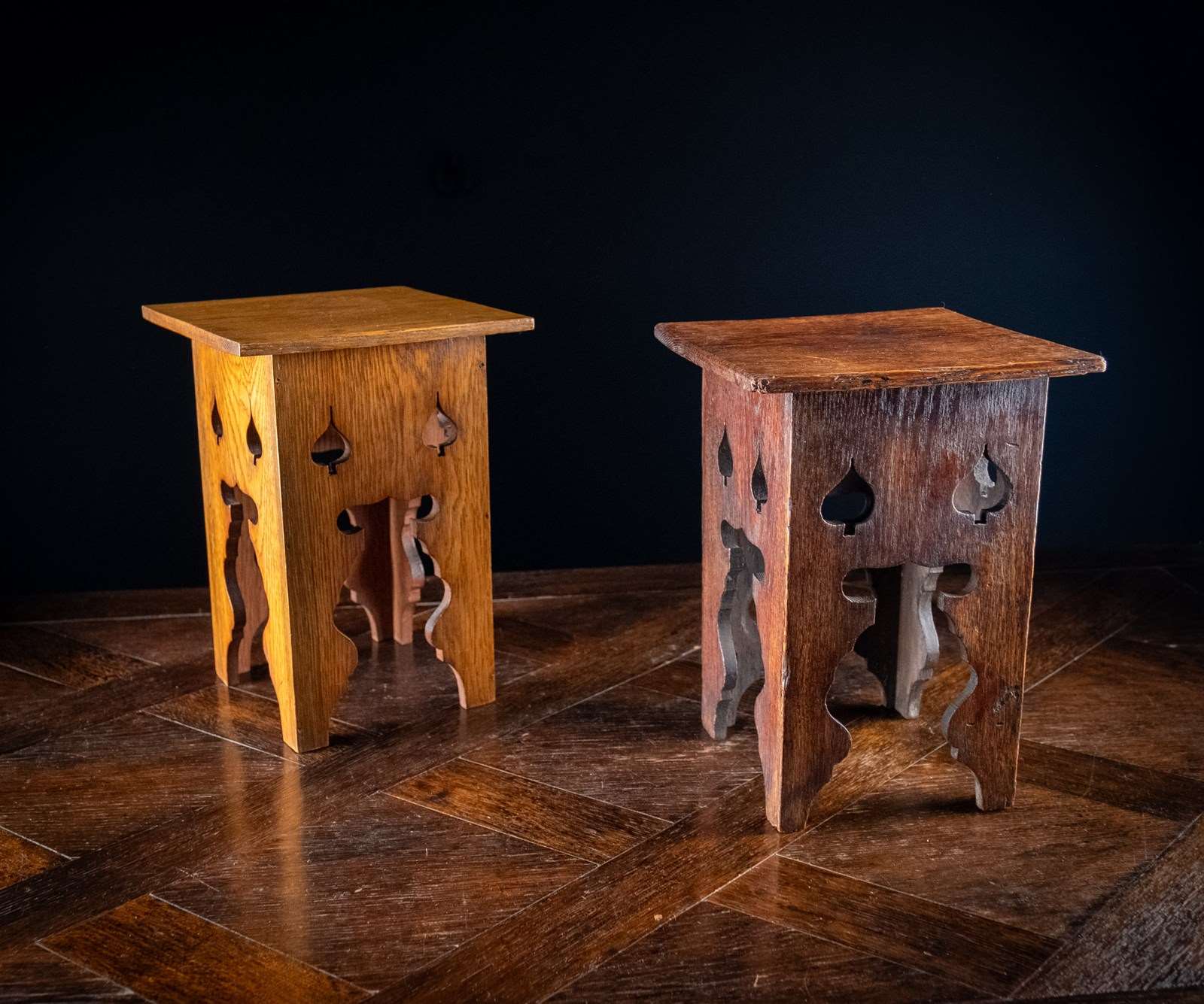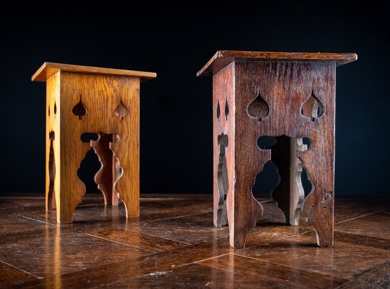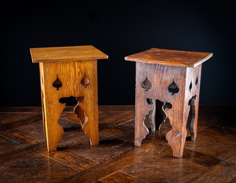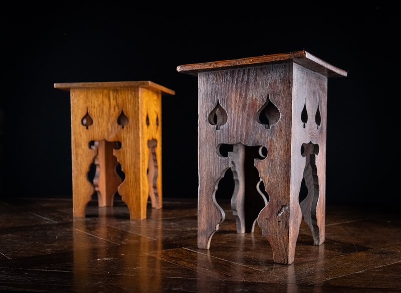 Both plinth stands are constructed of solid oak with a cut-out design typical of Liberty. Both show some lights of wear commensurate with age but generally remain in a good solid condition.