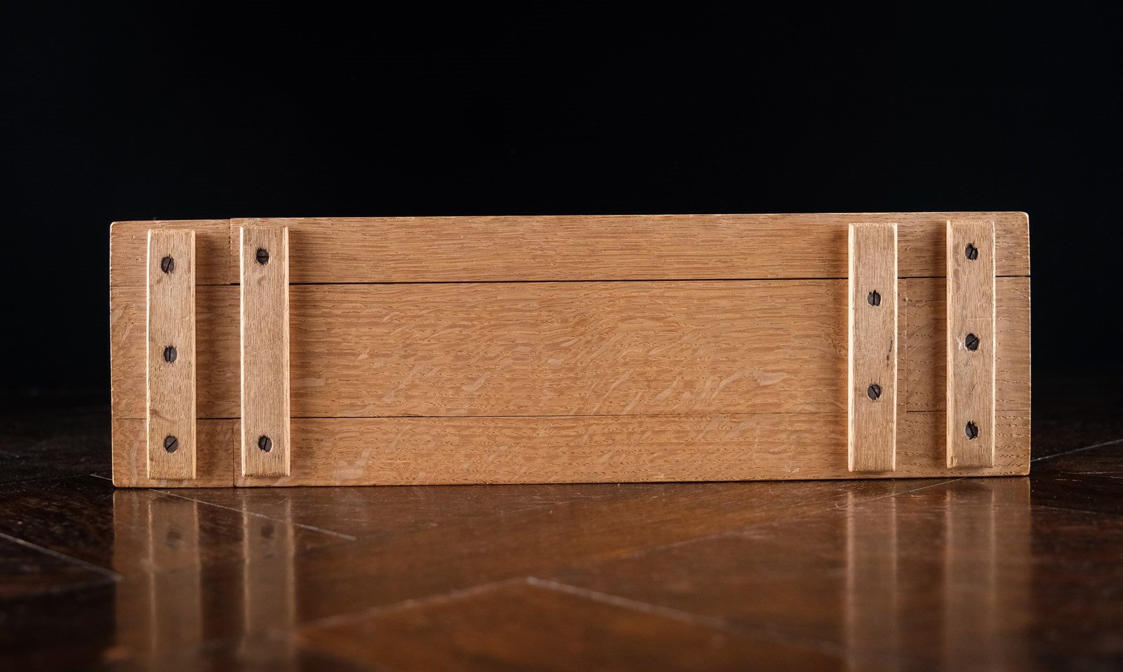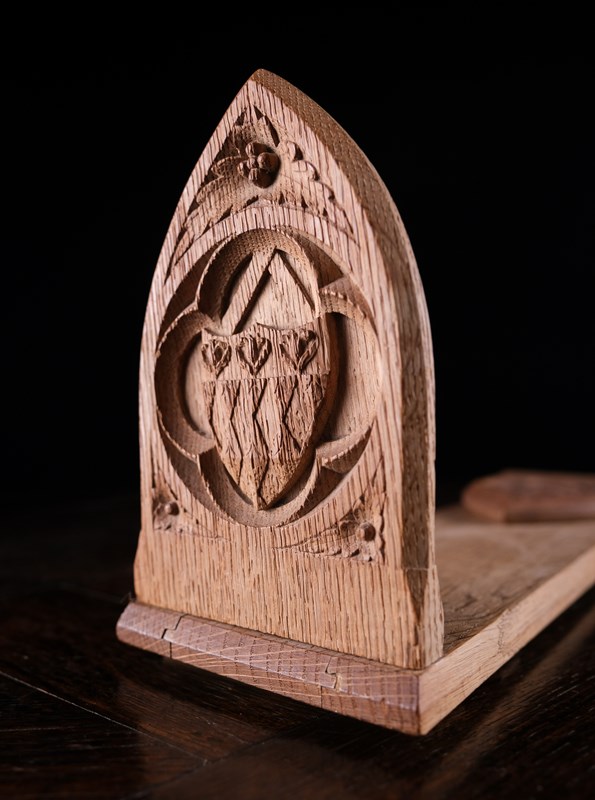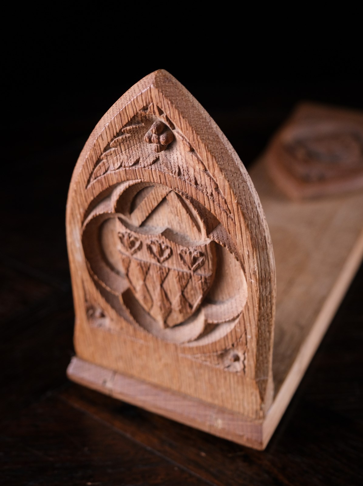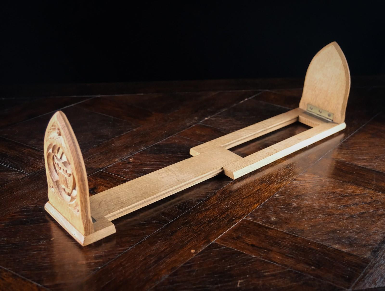 An early 20th century carved oak book slide in the gothic revival taste bearing the Oxford University coat of arms to one side, and an unidentified coat of arms to the other.