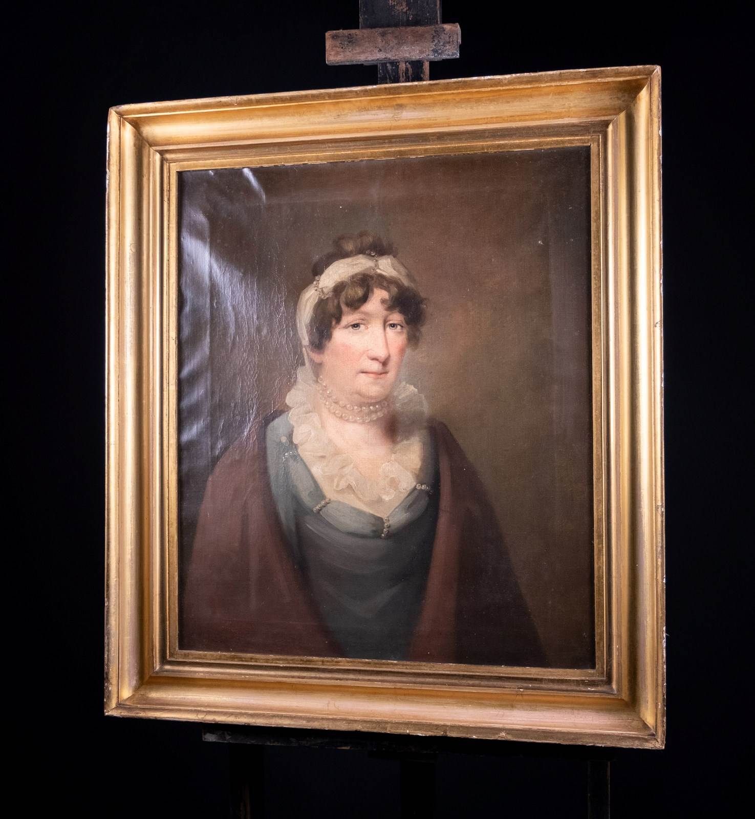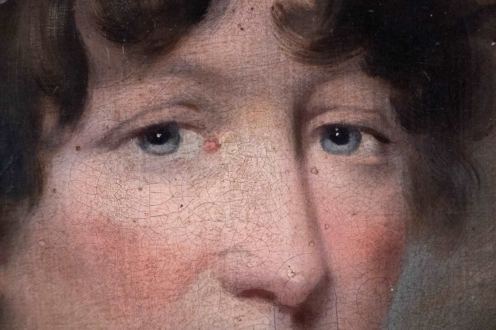 The work has been made a fit a smaller frame historically with those crease lines still evident. There is some slackness to the canvas where the work has been brought back to its full size (again apparently some time ago when one looks verso) which will require re-stretching to remedy. The work has craquelure throughout and the varnish would be benefit from a clean. Nonetheless, she displays wonderfully.