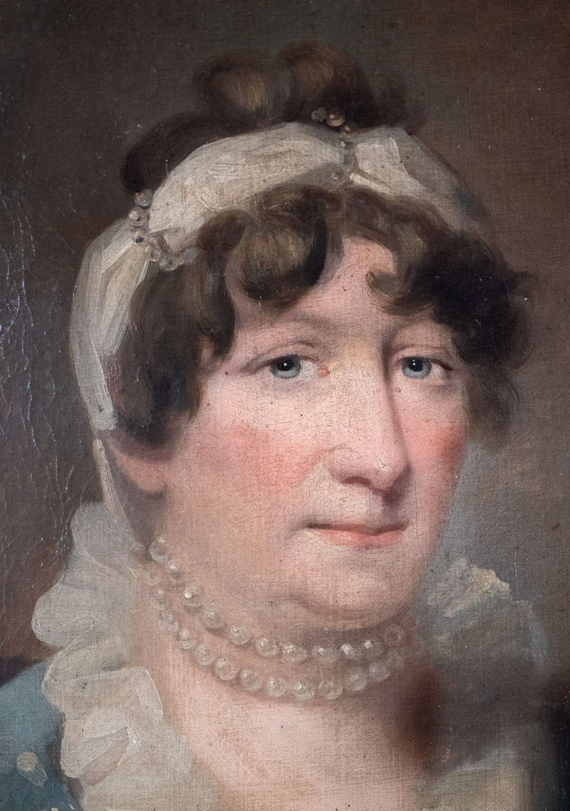 The sitter is to the left of the canvas wearing a blue dress adorned with pearls, a pearl necklace and a white scarf in her hair. She is rather modestly donning a pink shawl around her arms. The sitter's expression together with her placement in the canvas gives the whole work a melancholic air.