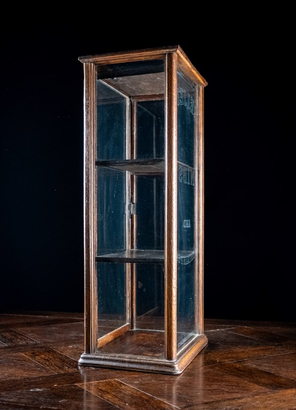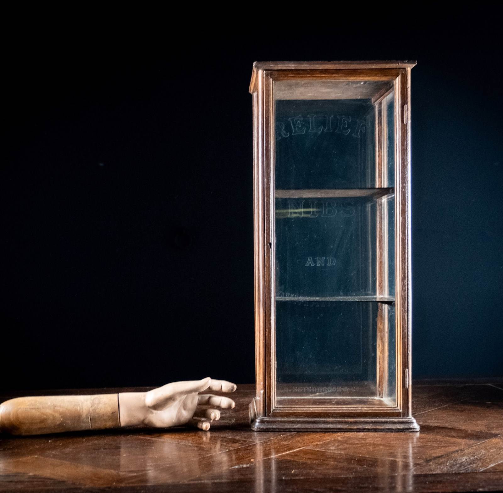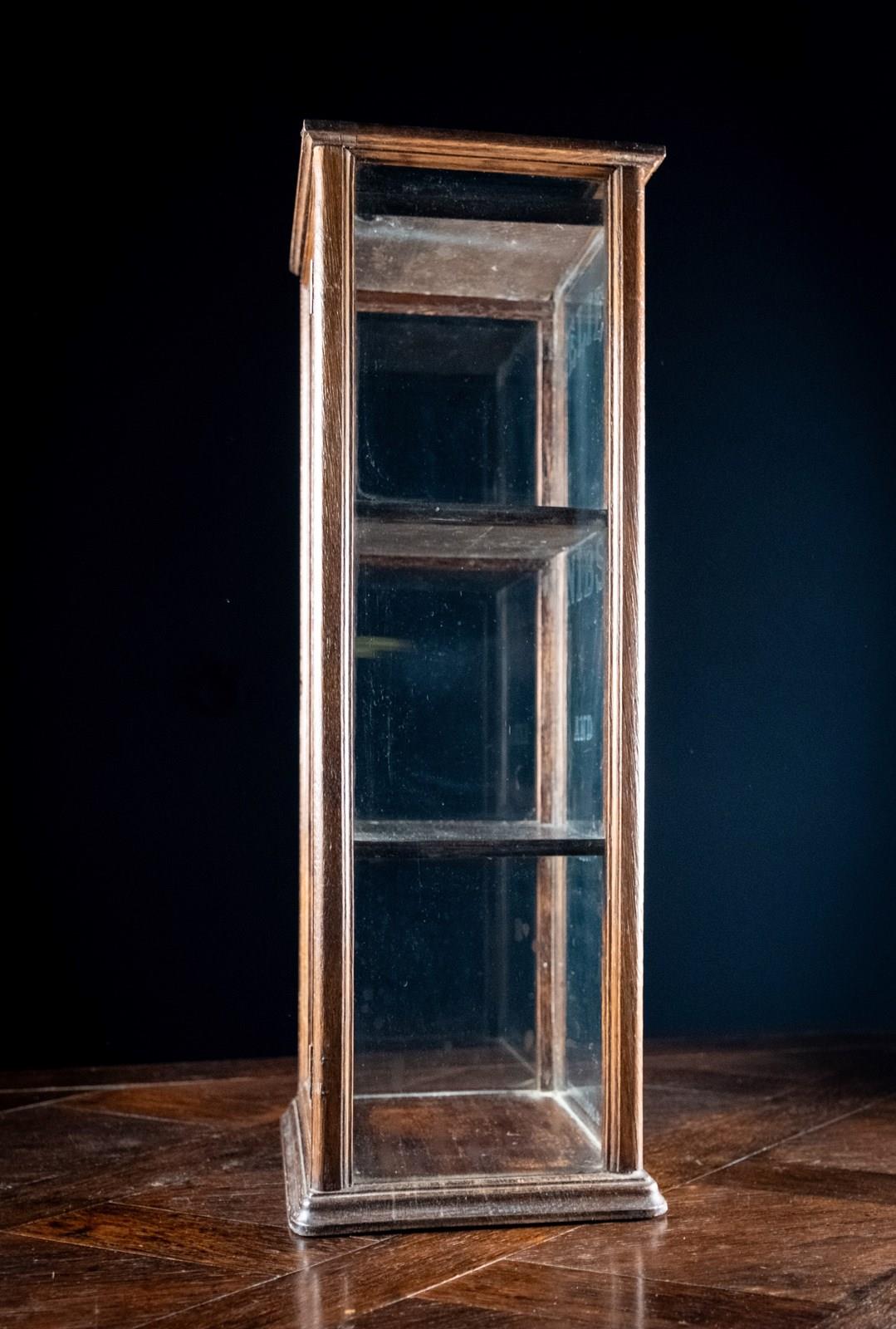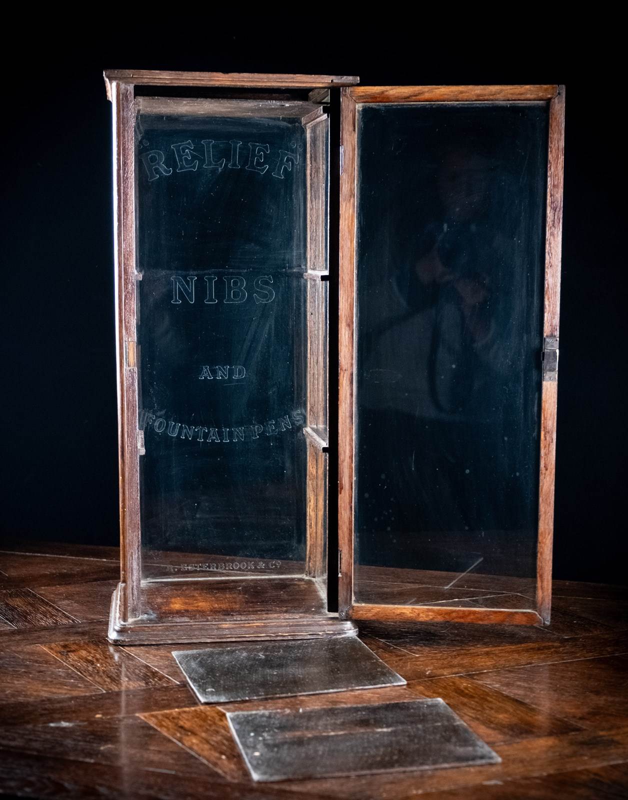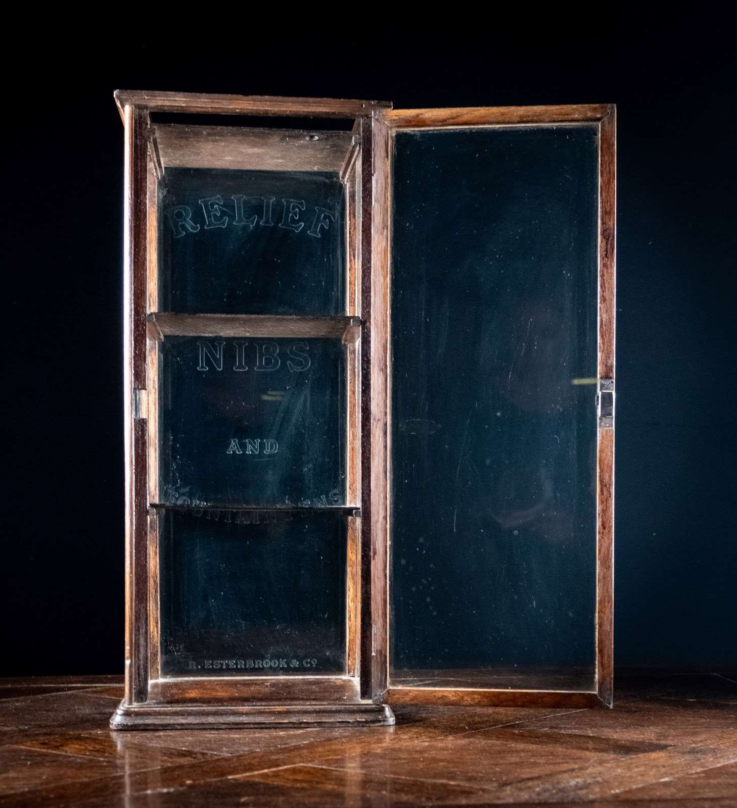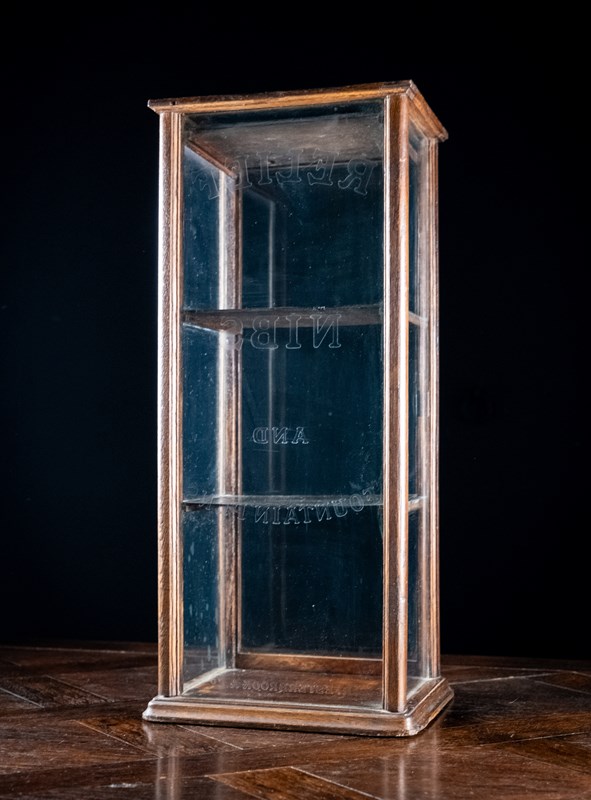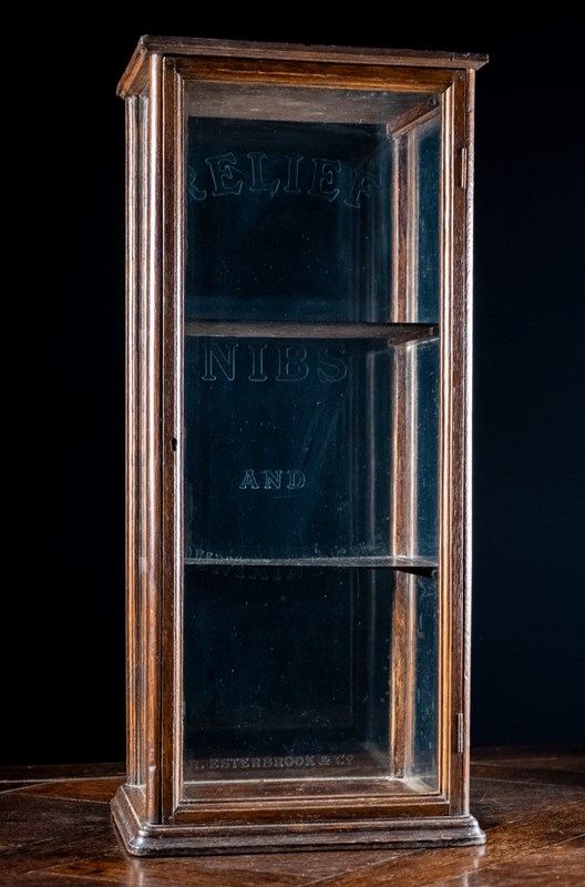 A diminutive glazed display cabinet with etched glass reading 'Relief Nibs & Fountain Pens, R. Esterbrook & Co'. R. Esterbrook & Co released the 'Relief' fountain pen c.1920-30, thus this cabinet can be accurately dated to that period.
