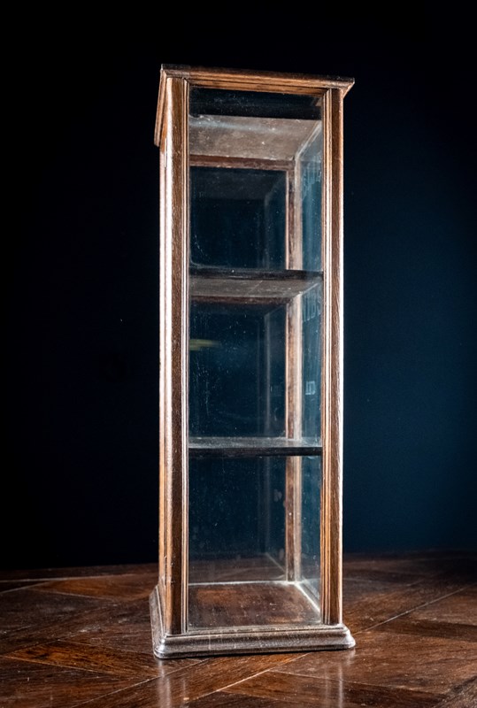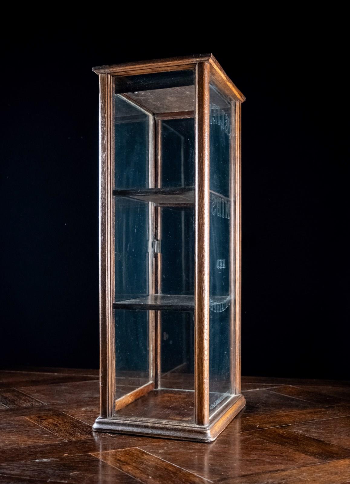The oak frame supports a glass door, back and sides, with two thin removable drawers to the interior. The cabinet remains in a wholly untouched original condition. There are some signs of wear commensurate with age throughout as one would expect such as some light marking and scratching to the glass in areas. Key absent.