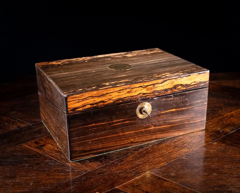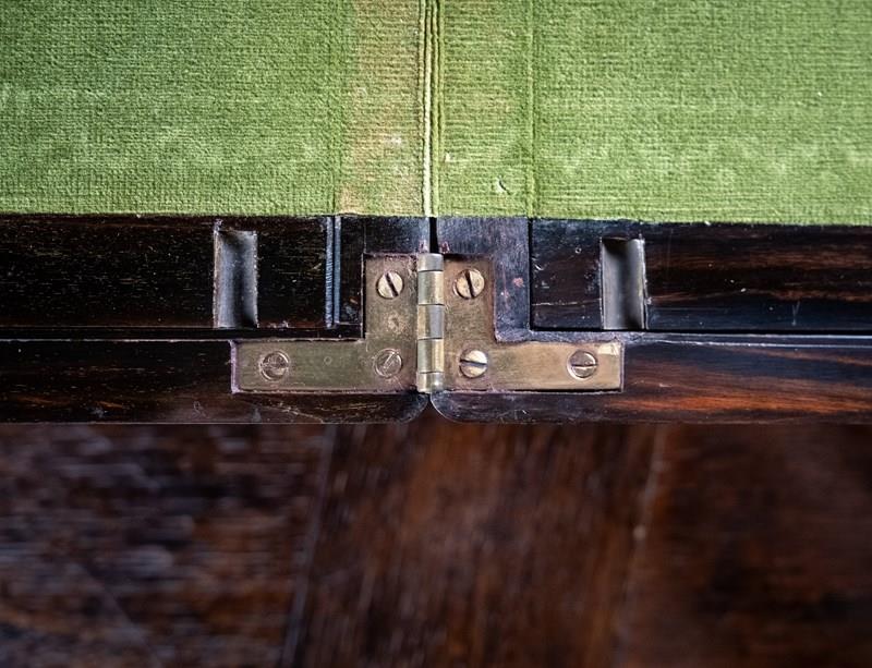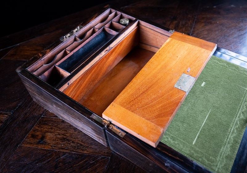 The coromandel has faded heavily in areas, most notably to the lid. The locks all work as they should and the interior baize lining remains clean.