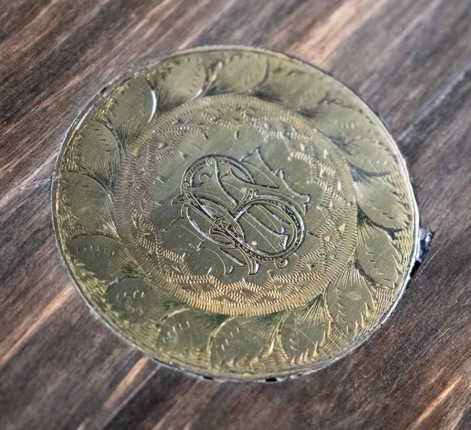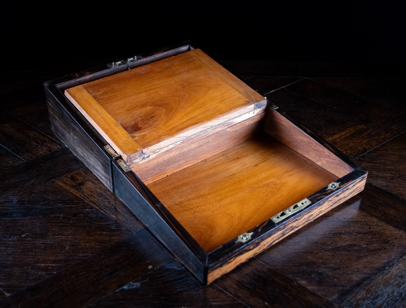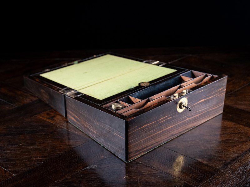 The coromandel box has a monogrammed circular brass inlay to the lid. The hinged lid opens to reveal a green baize lined writing slope with a lockable inner compartment. Baize lined base.