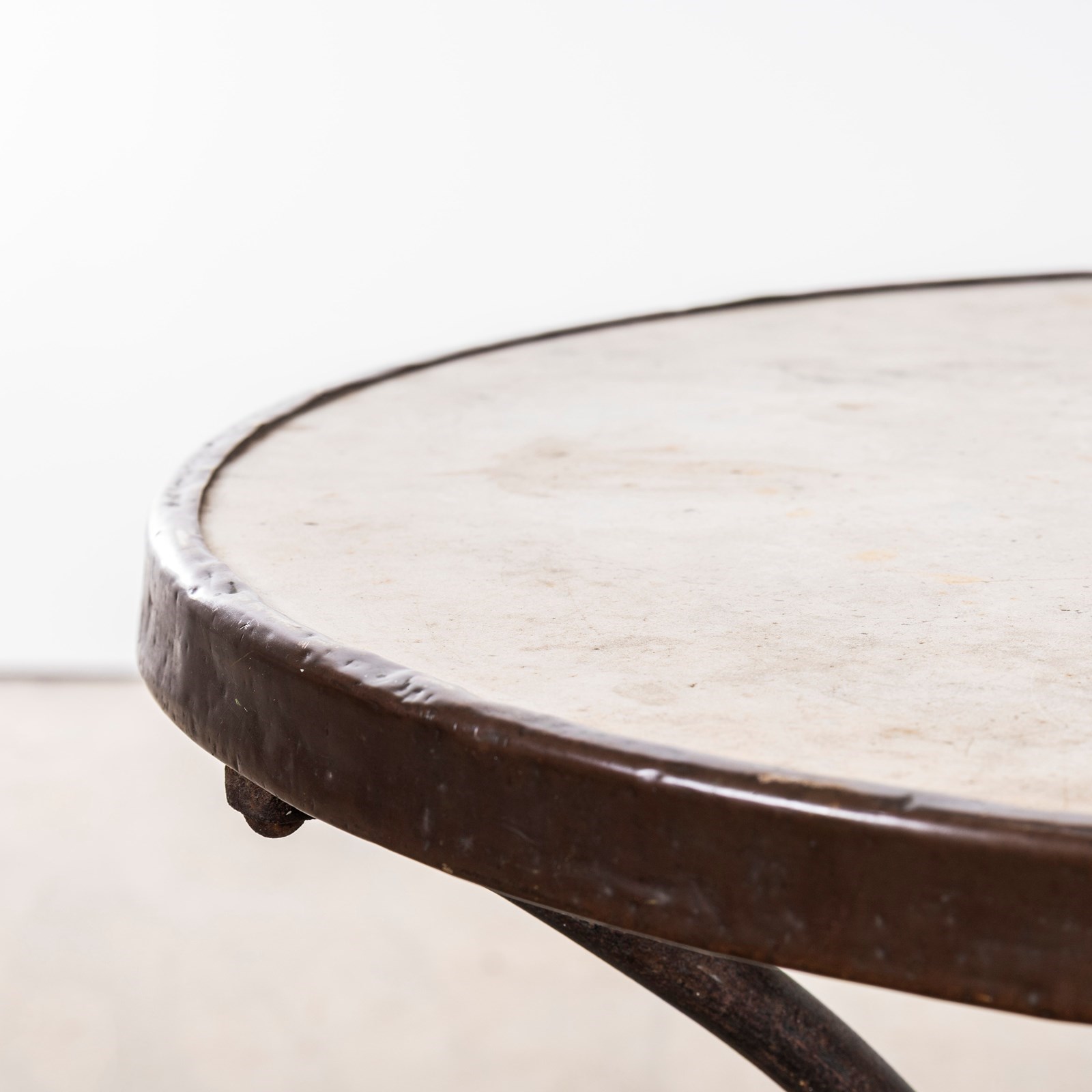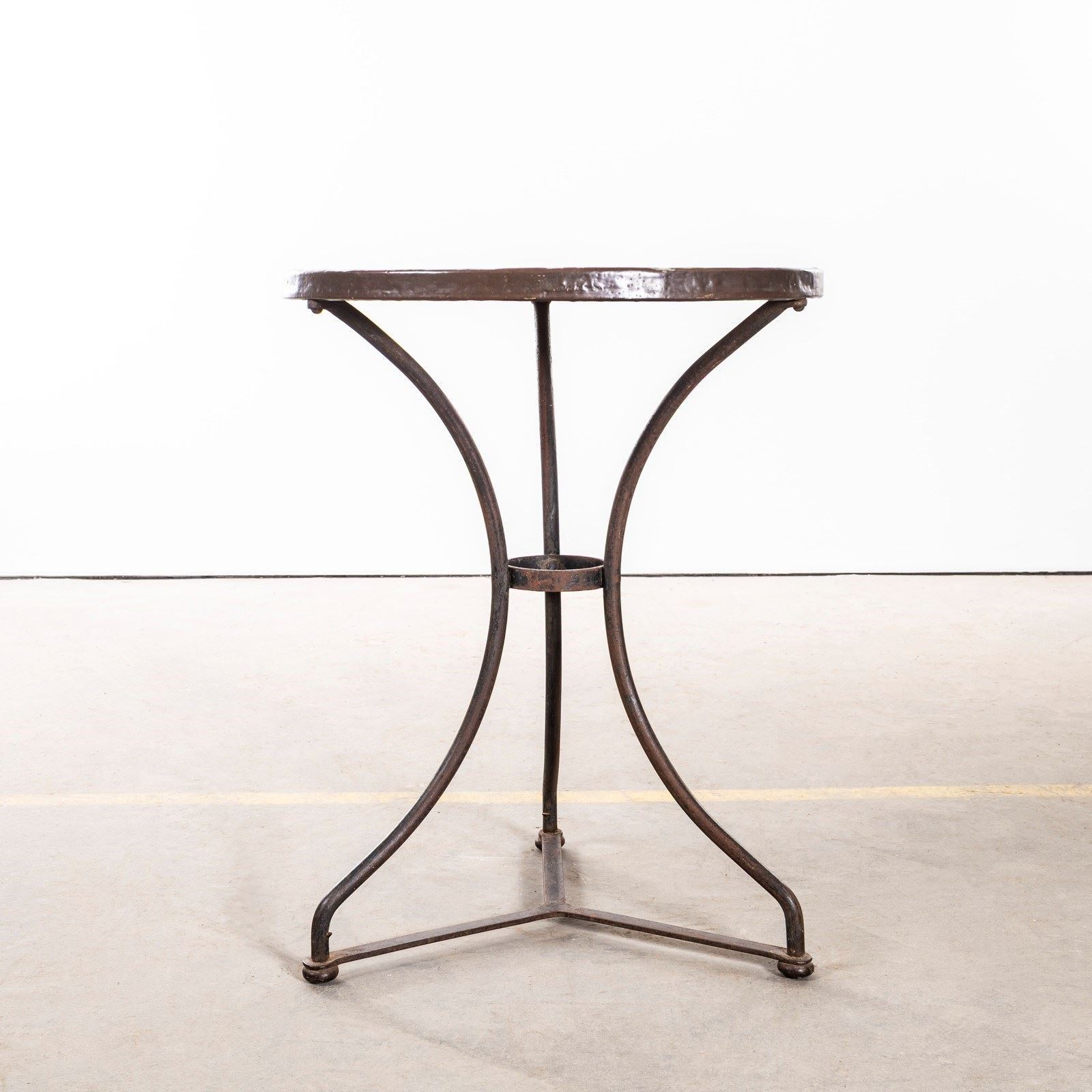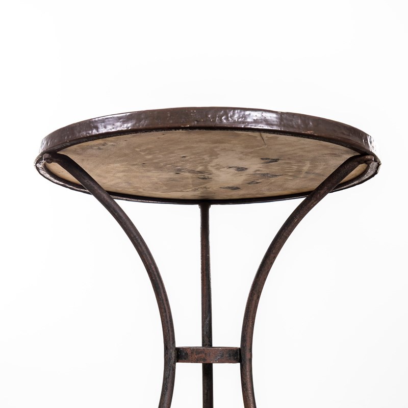 Classic 1950’s French Gueridon table with three solid bar hand shaped legs with a central riveted support ring and delicate curved feet on a tripod base. Original paint gently restored by our workshop.