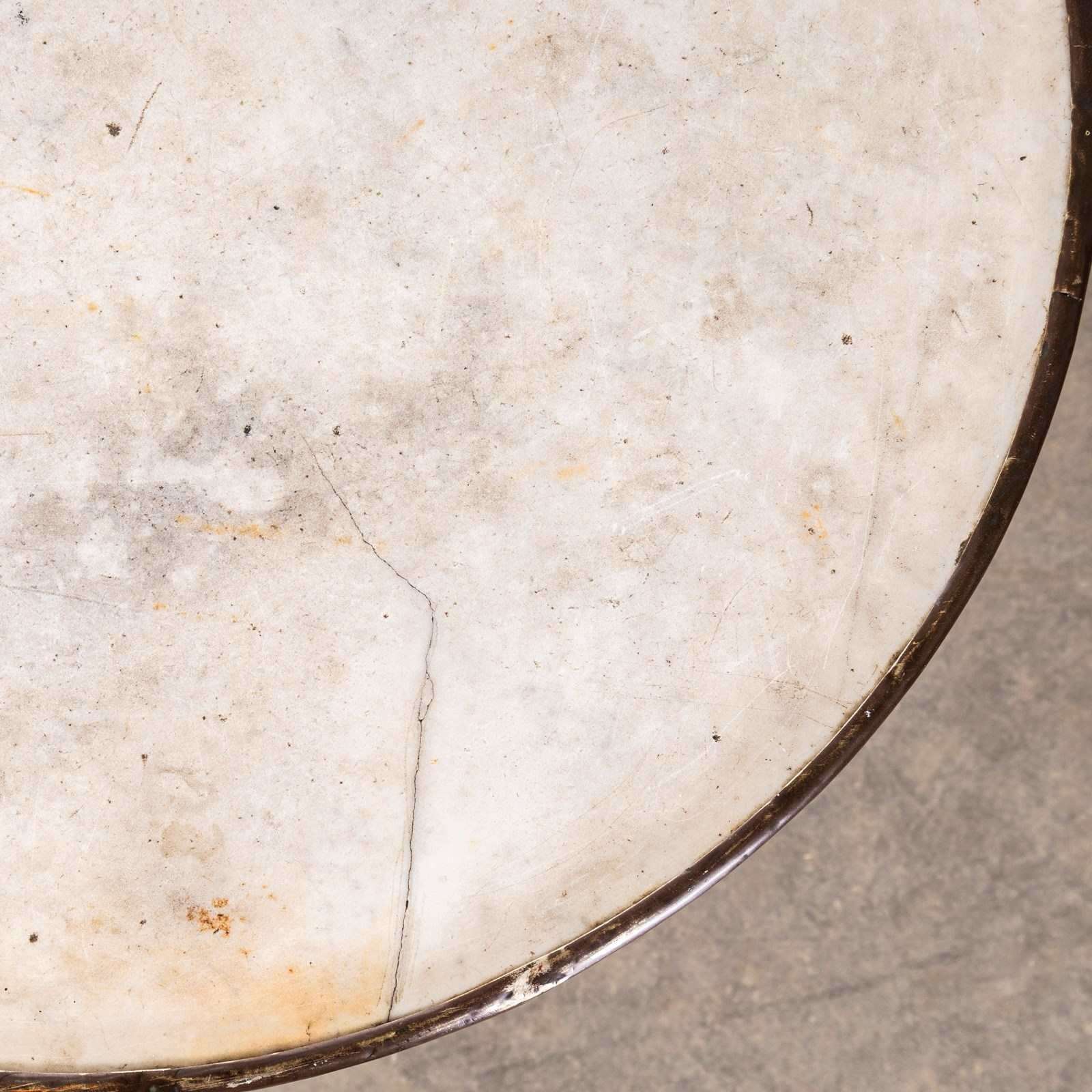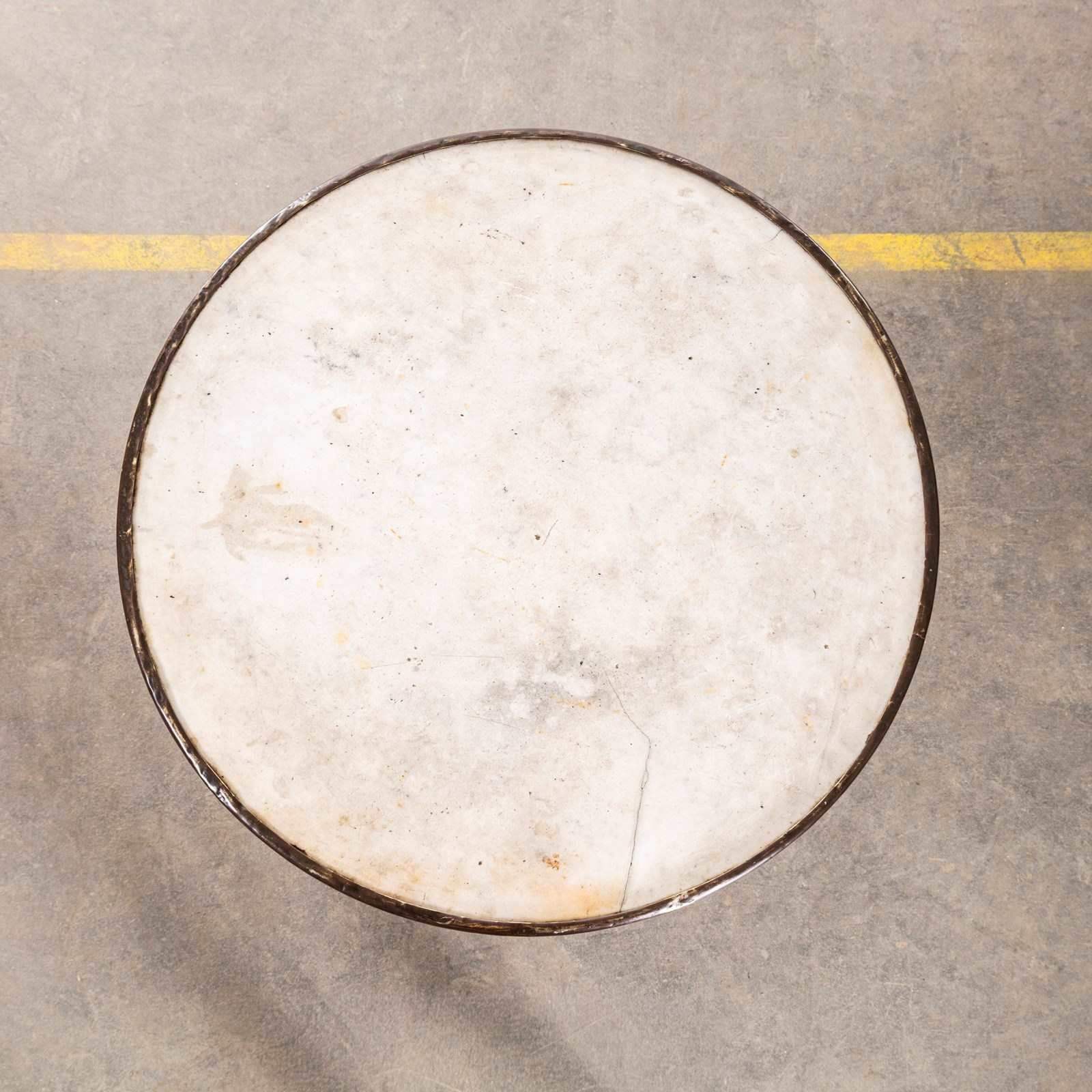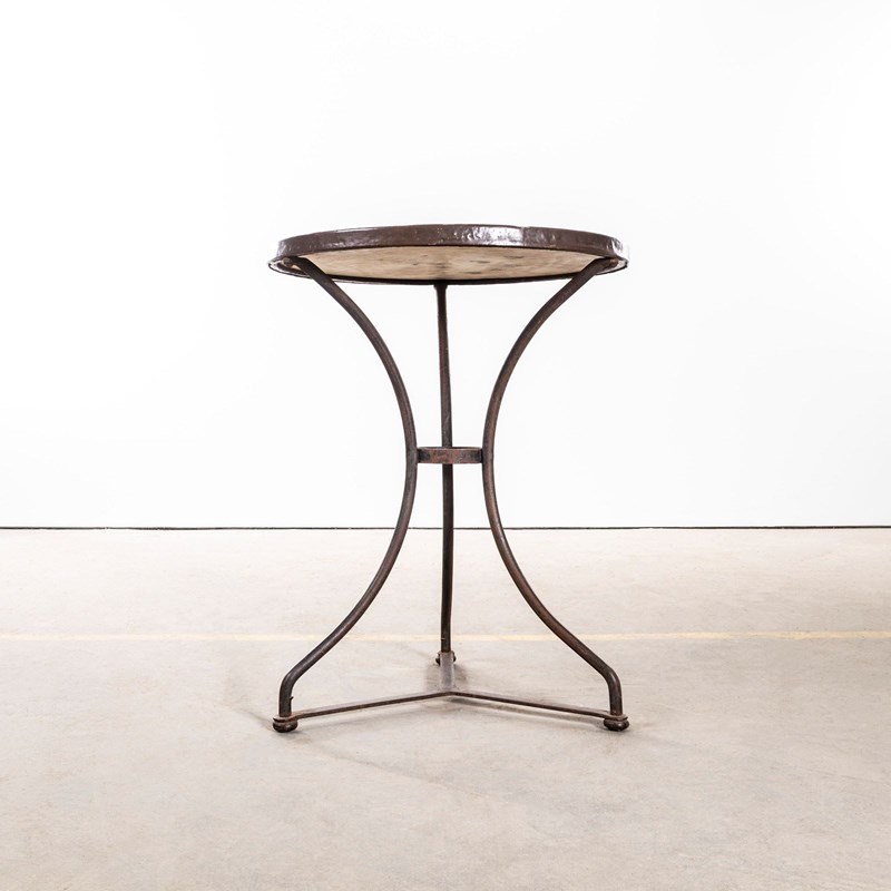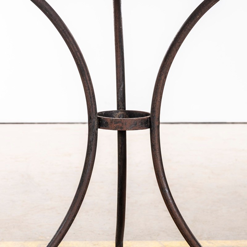 Classic 1950’s French Gueridon table with three solid bar hand shaped legs with a central riveted support ring and delicate curved feet on a tripod base. Original paint gently restored by our workshop.