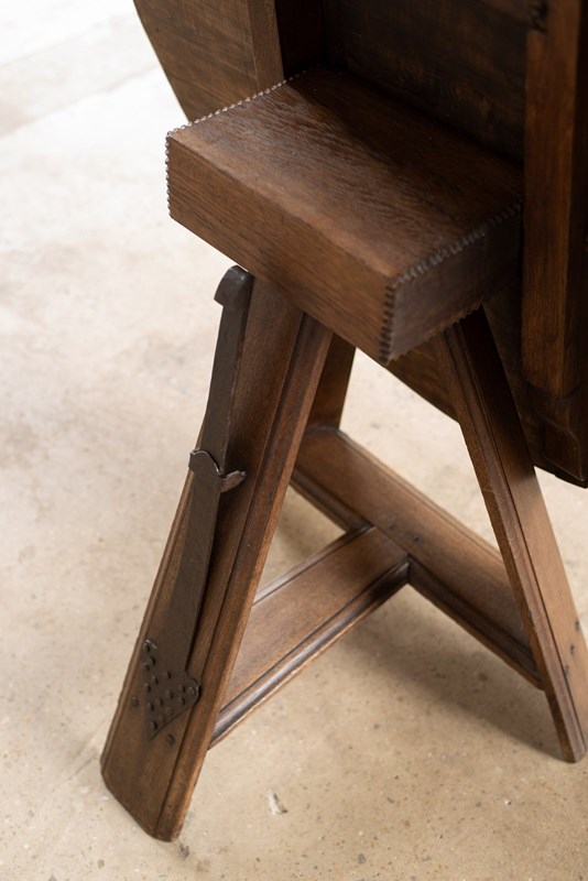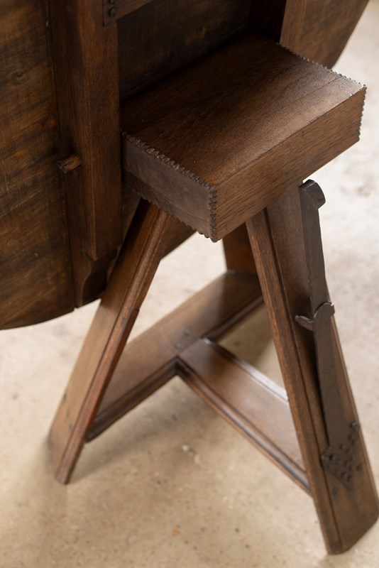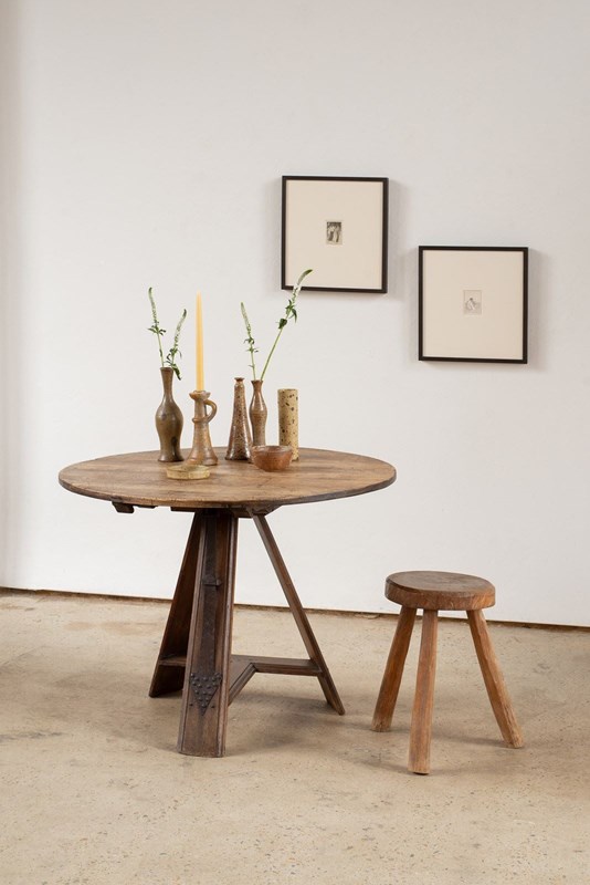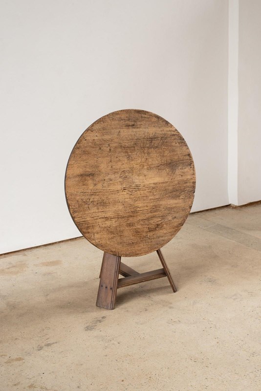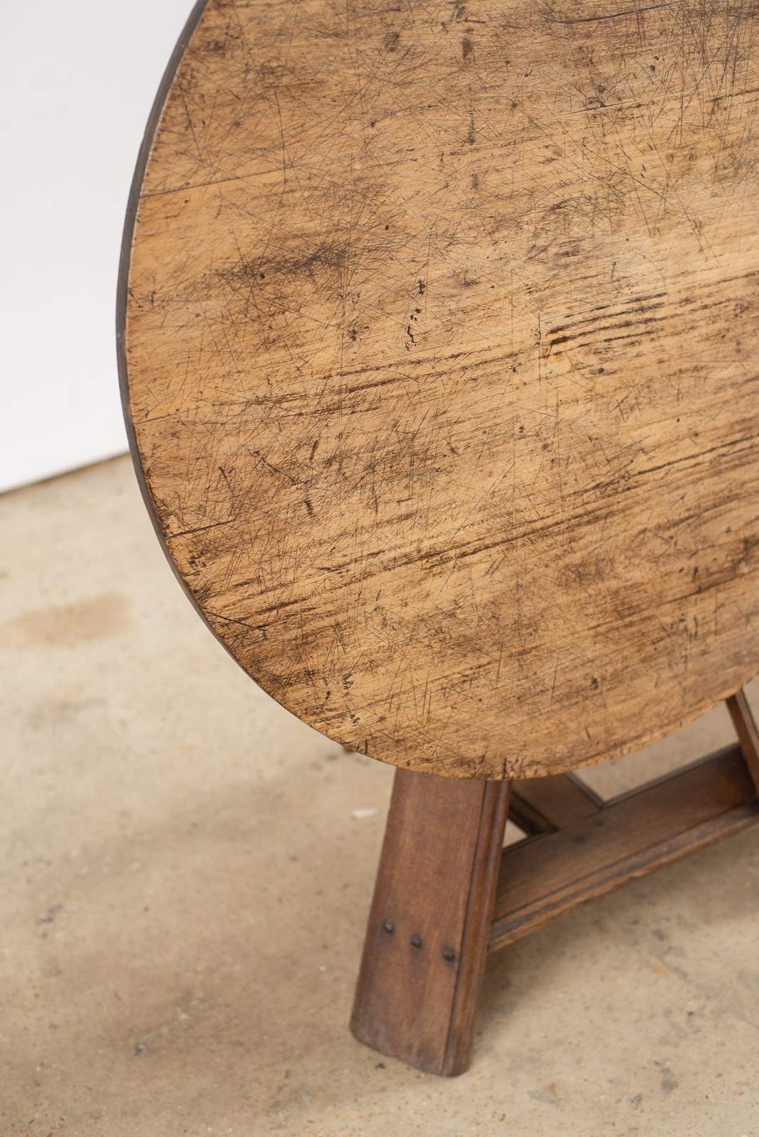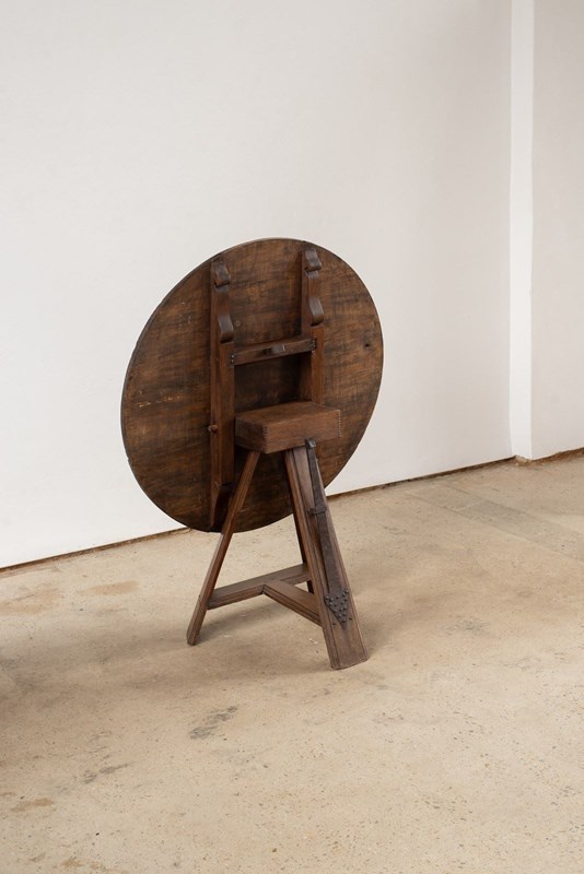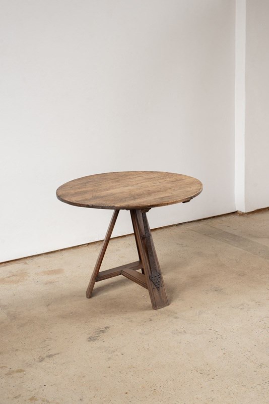 A circular 19th-century tilt-top table from Friesland, The Netherlands. Beautifully crafted with an elm top and oak legs, with a hand-forged iron mechanism to the table.