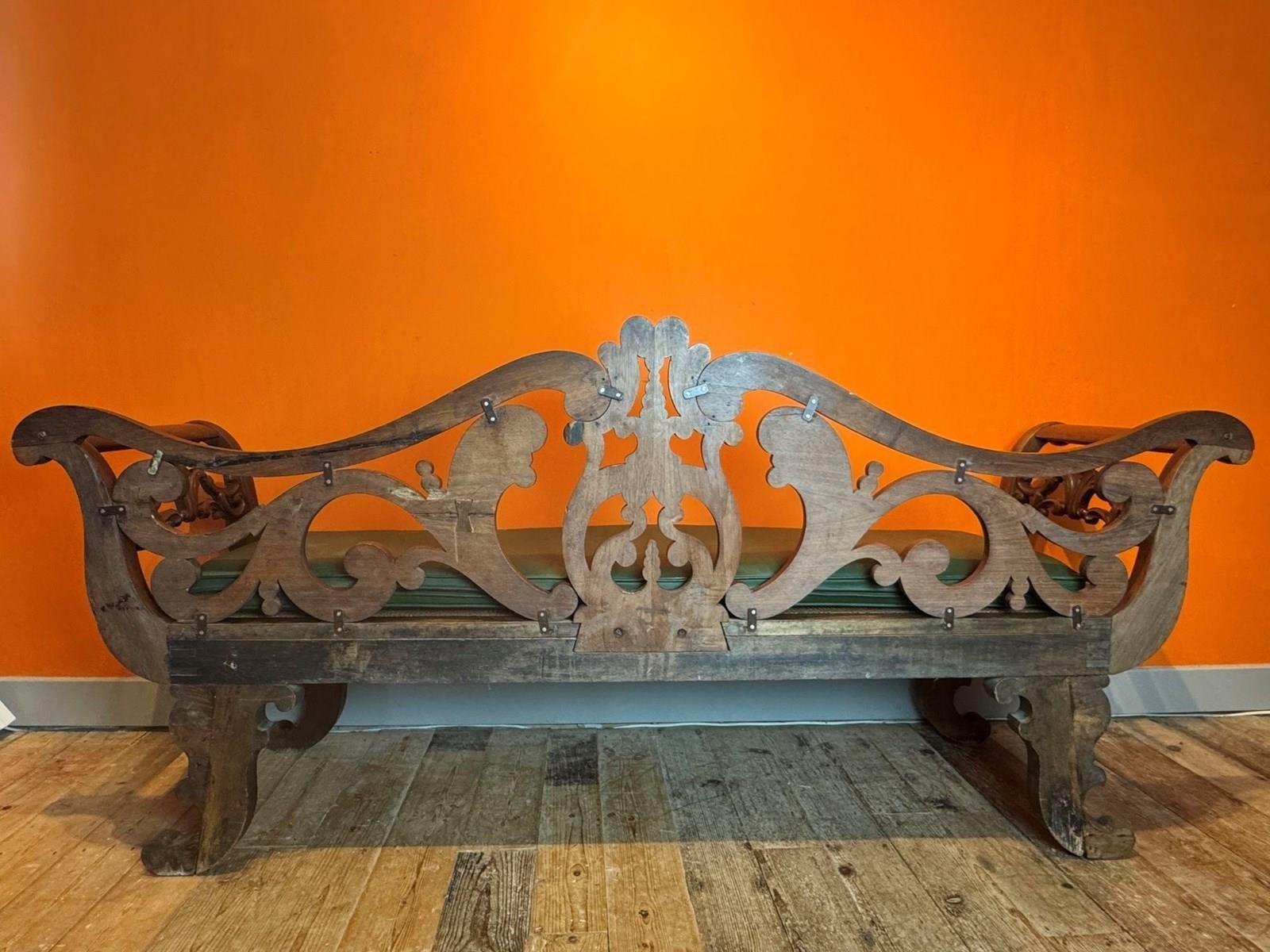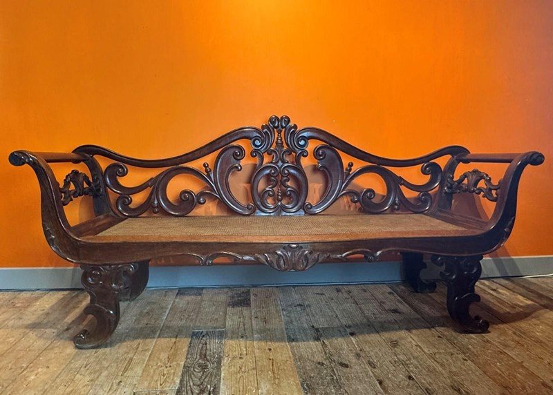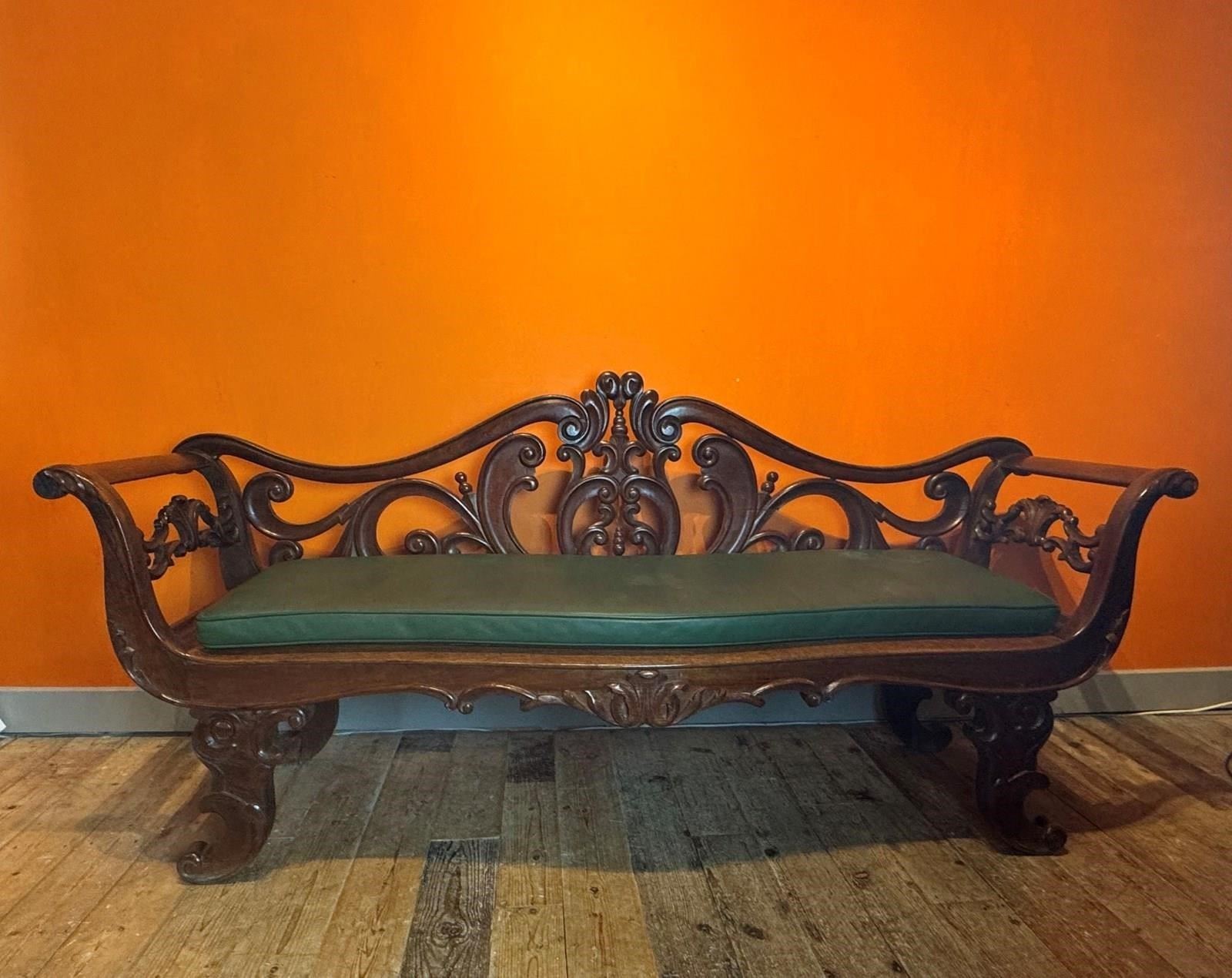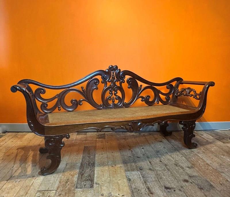 A very handsome Anglo-Indian rosewood hall bench, circa 1840, with foliate scroll back and out-scrolling arms, the serpentine front caned seat over a scroll apron and raised on scroll supports. With a green faux-leather seat cushion.