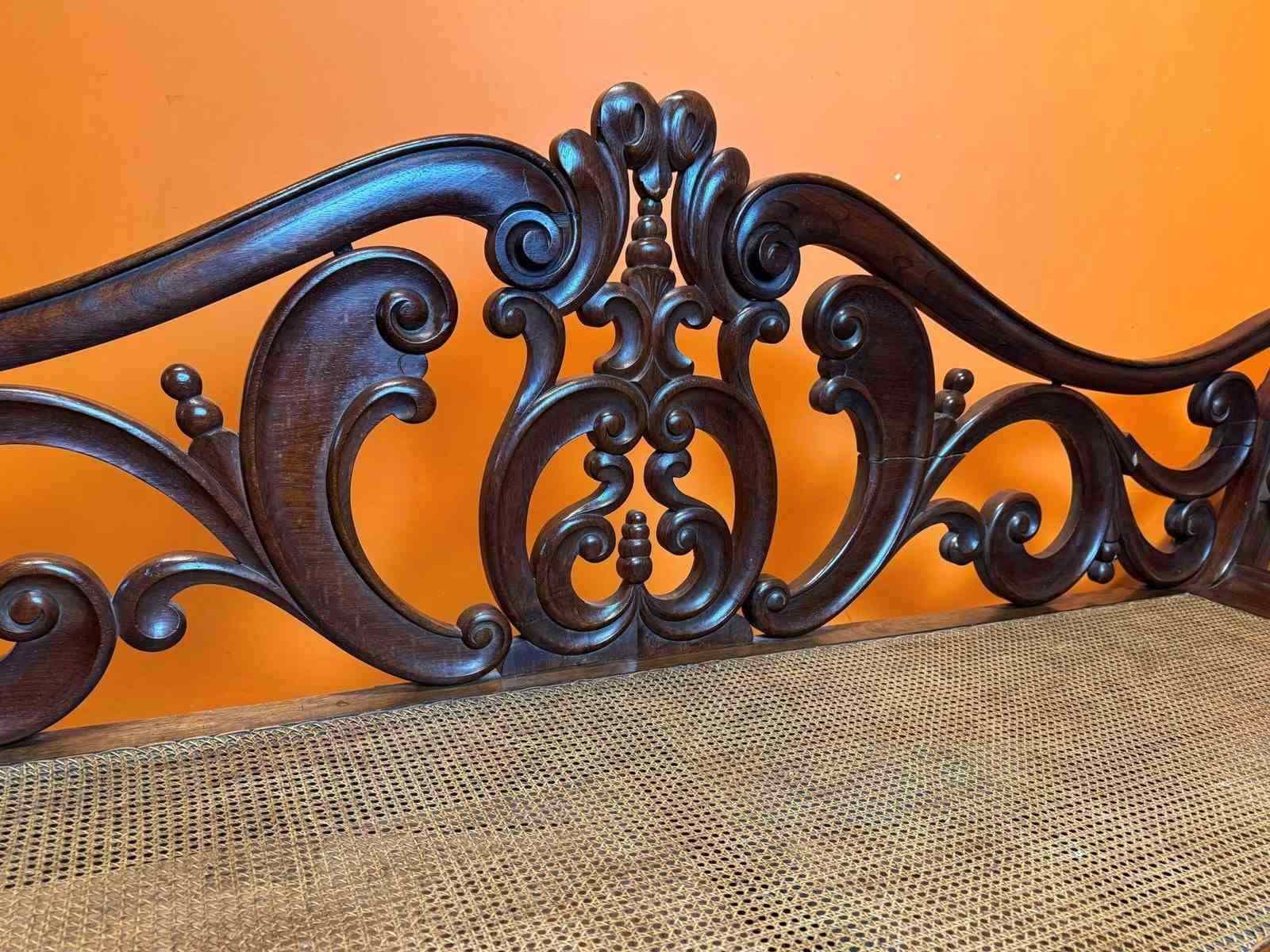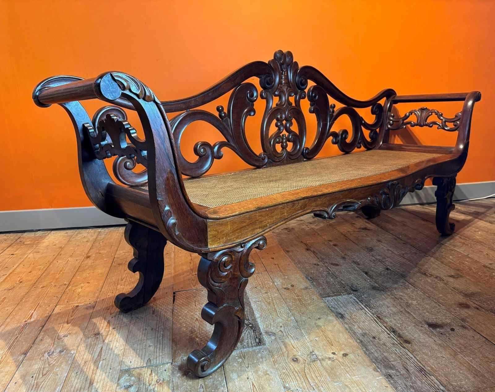 A lovely bench of good colour. Lacking one section of moulding to the edge of the right hand scroll arm. The back with some old repairs but overall in vey good condition, including the caned seat.
