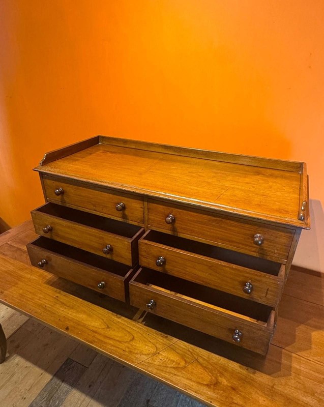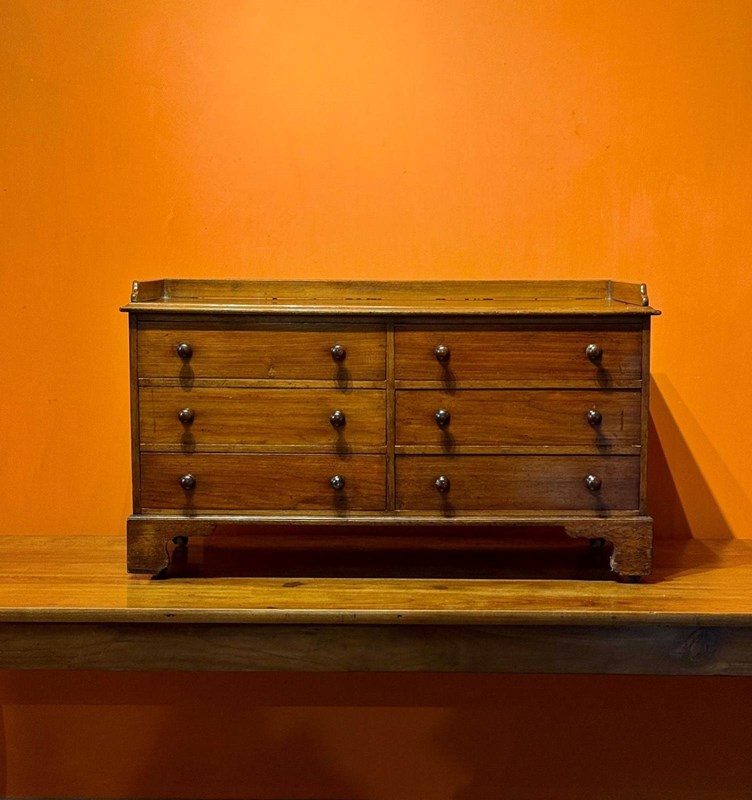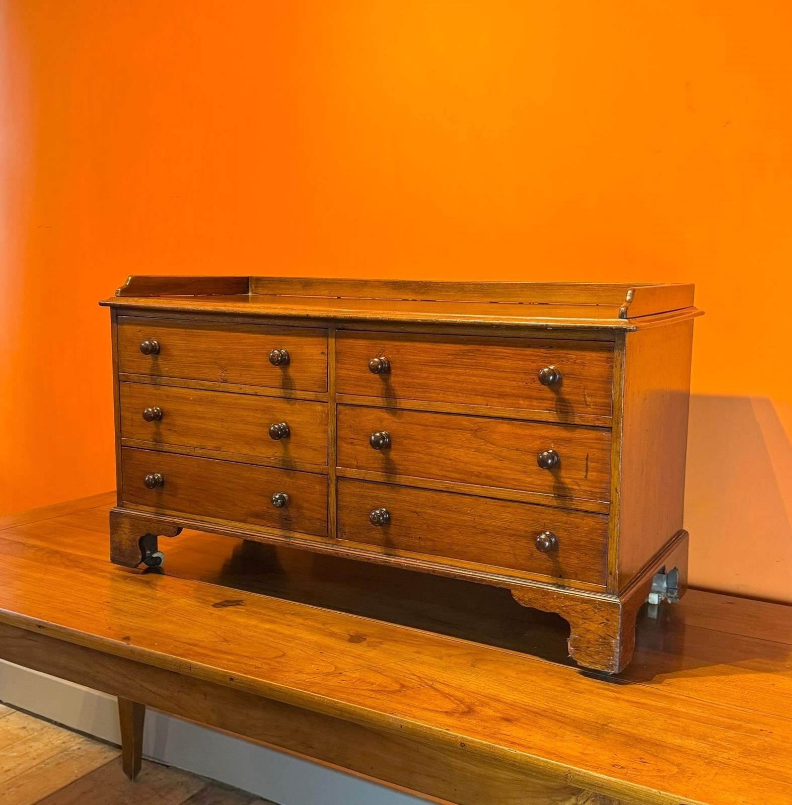 An early 19th Century chest of drawers of small proportions, the tray top with a moulded edge over two banks of three drawers and raised on bracket feet wth concealled casters.