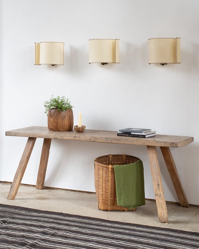 We have three mid-century brass and velum wall lights. They are generously sized and beautifully finished with a whip-stitched edge surrounding the wave shape of the shade. Each is mounted on a brass lamp holder, which is to be wired into the wall.