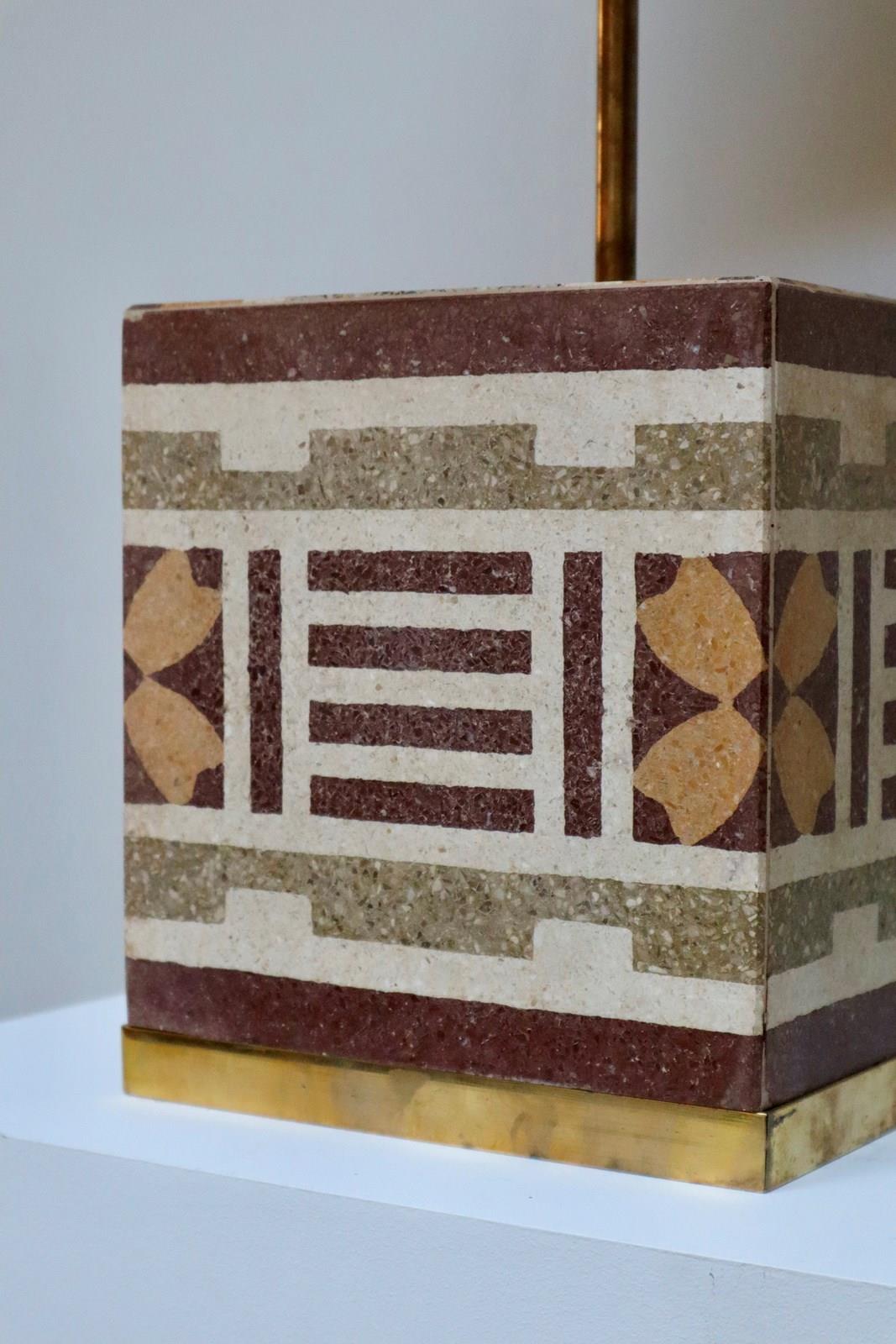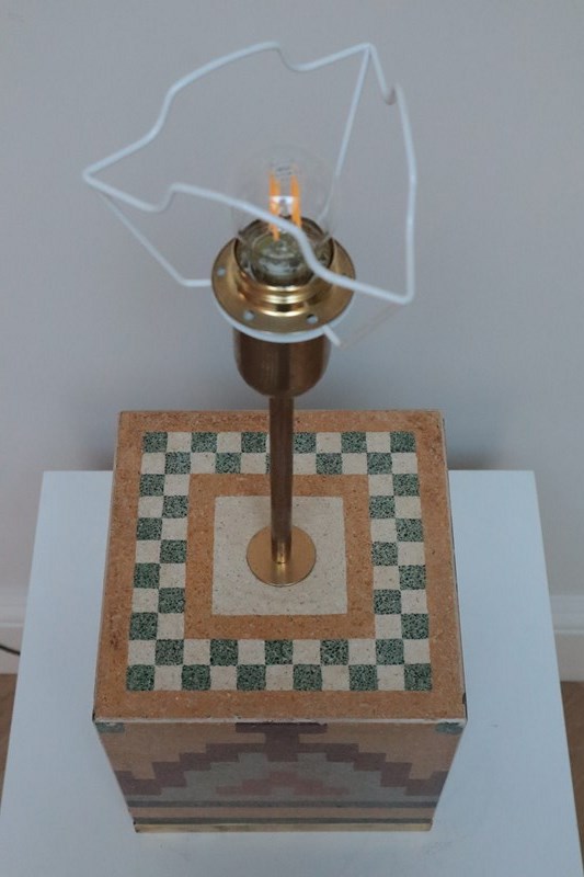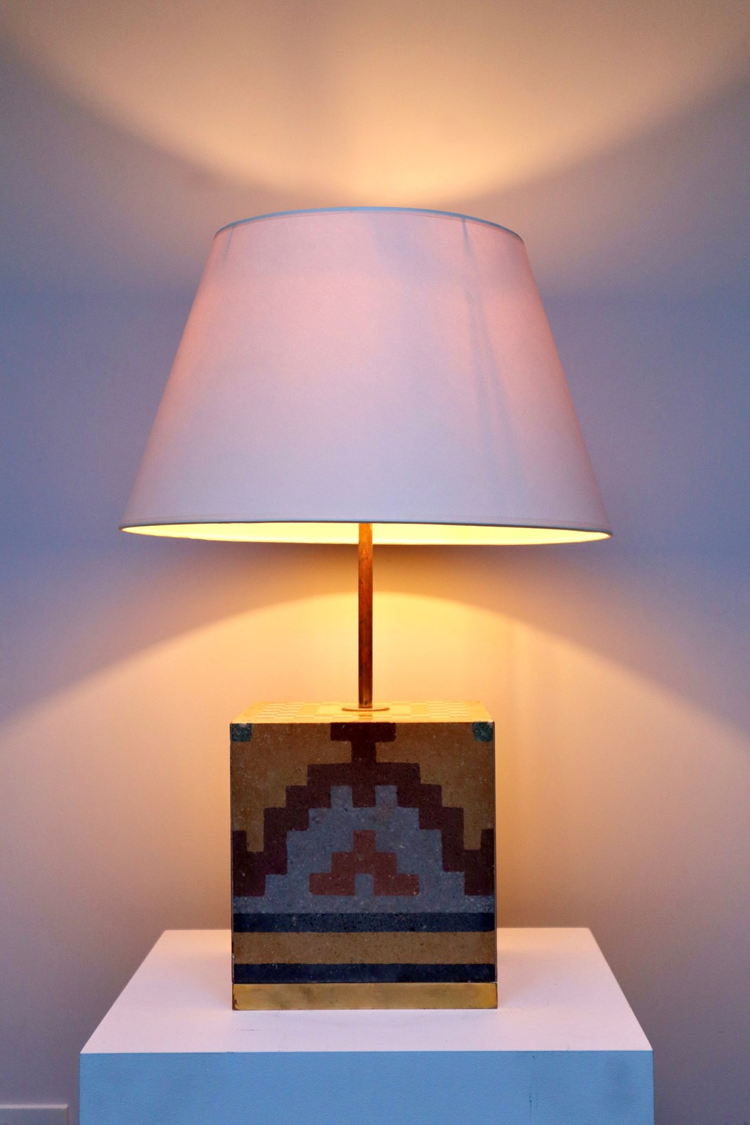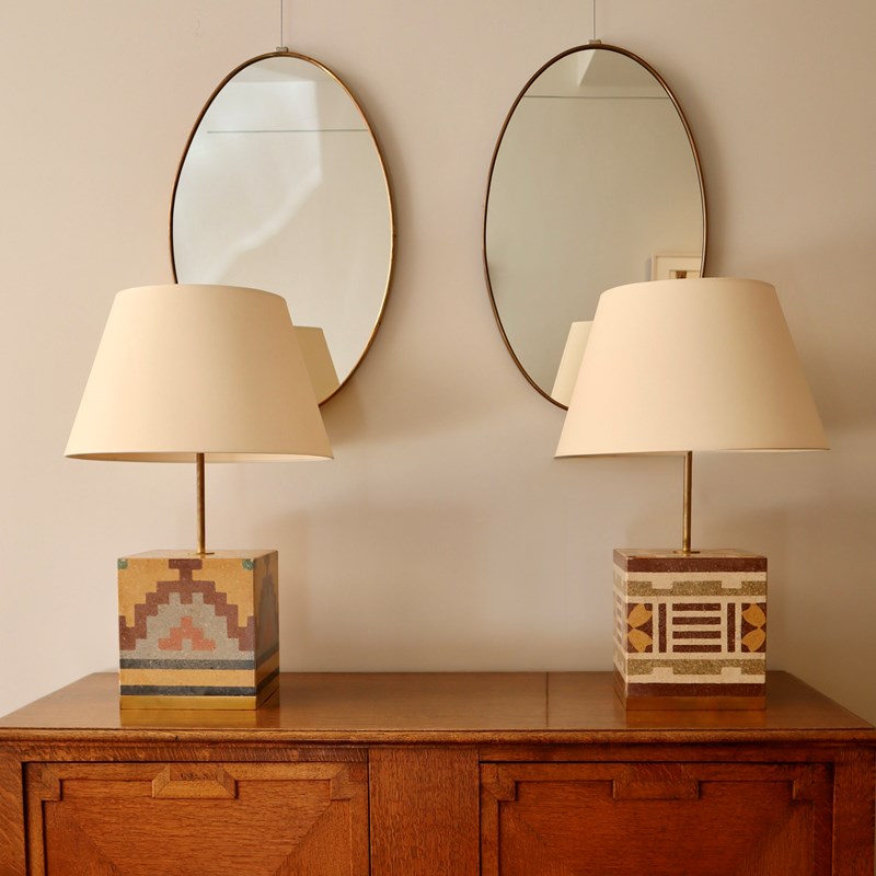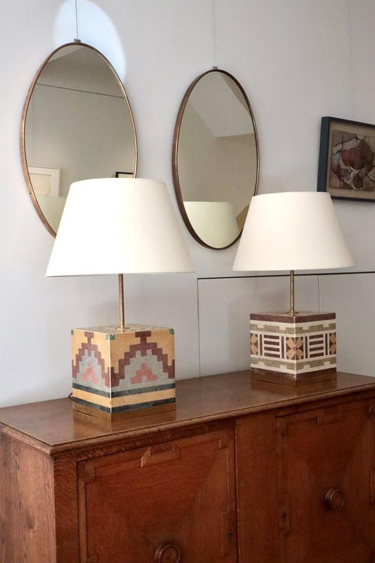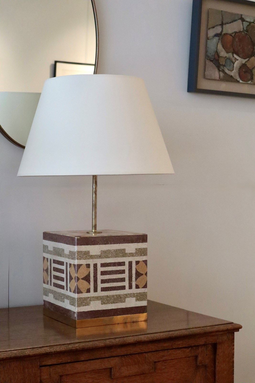A pair of heavy cementite table lamps with brass surrounds to each base and with complementary geometric patterns.