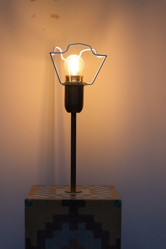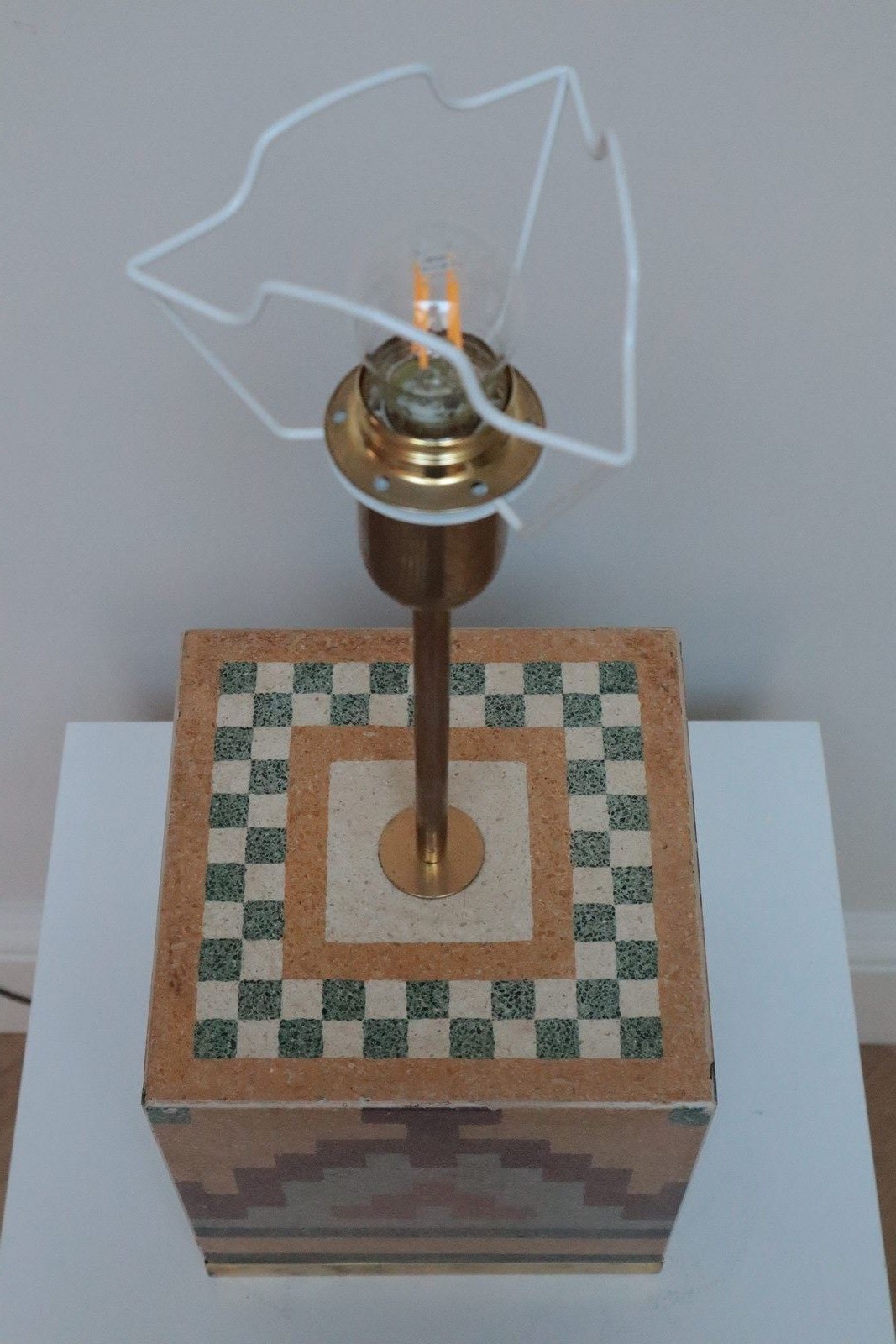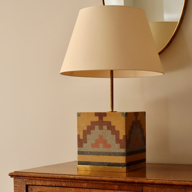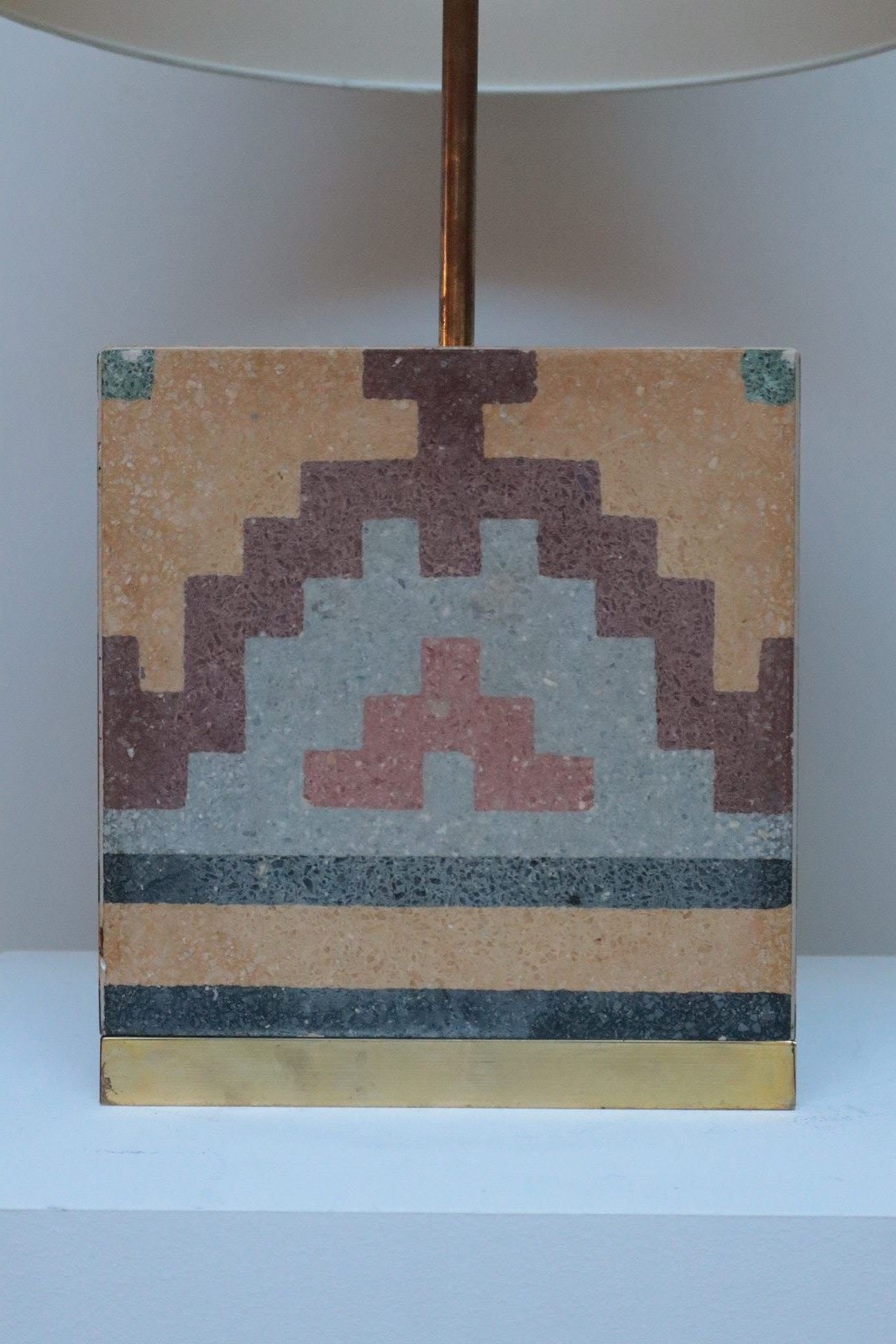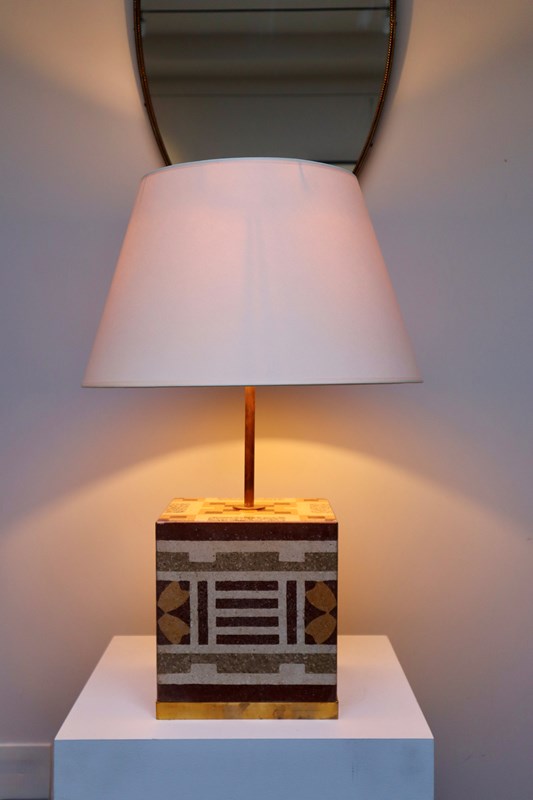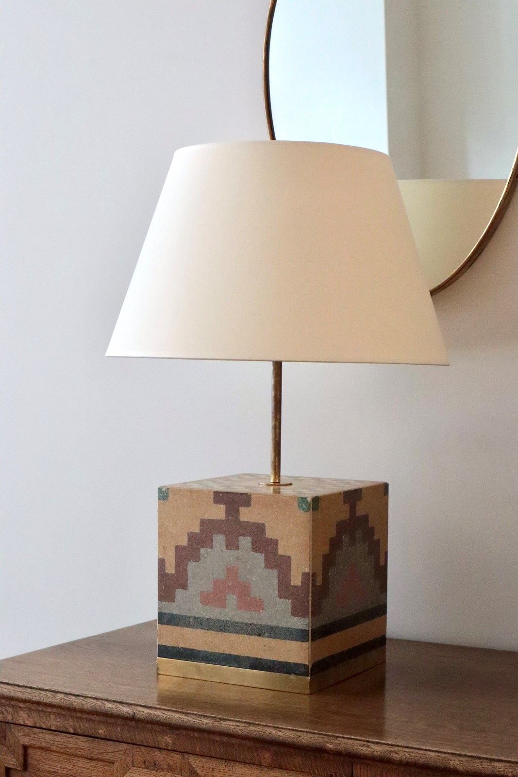 A pair of heavy cementite table lamps with brass surrounds to each base and with complementary geometric patterns.