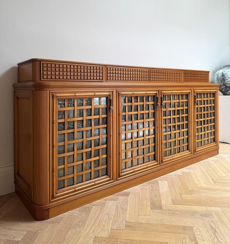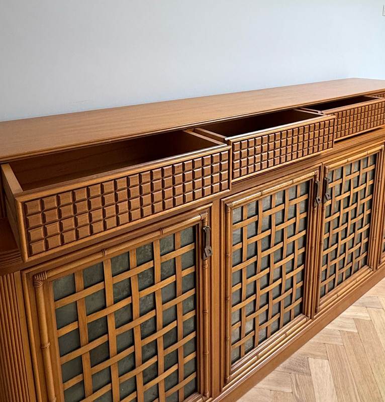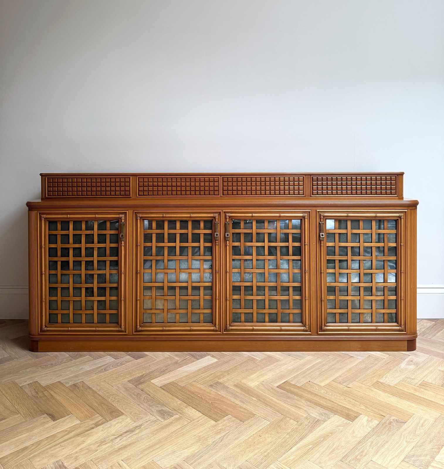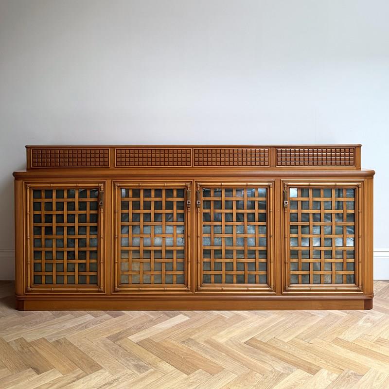 A versatile sideboard produced by the Italian design house in about 1970. There are four doors, internal shelves and original brass pull handles . The upper section (which is detachable) is recessed and contains four press open drawers.