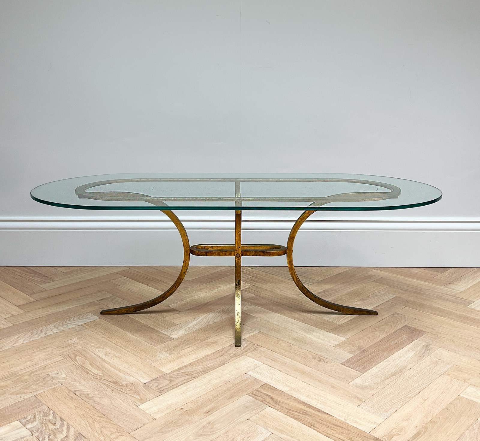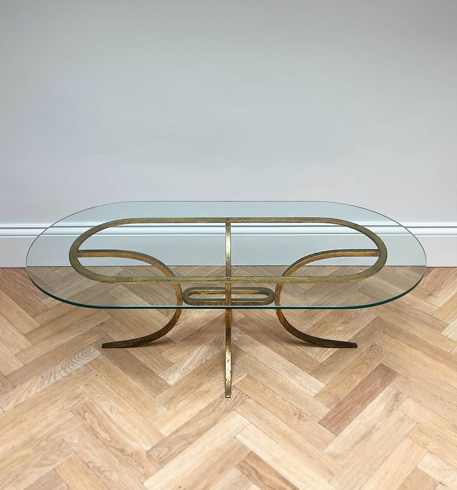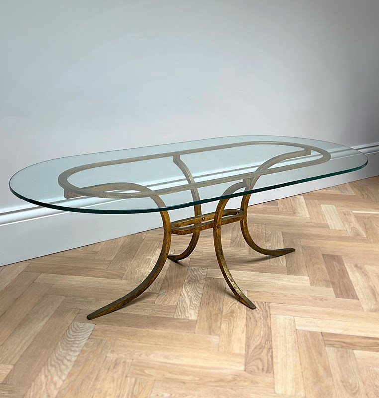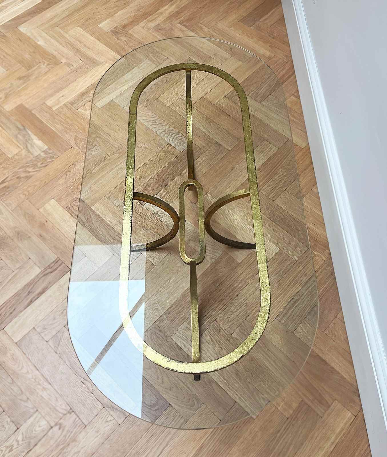 Beautifully elegant oval glass table with gilded metal legs