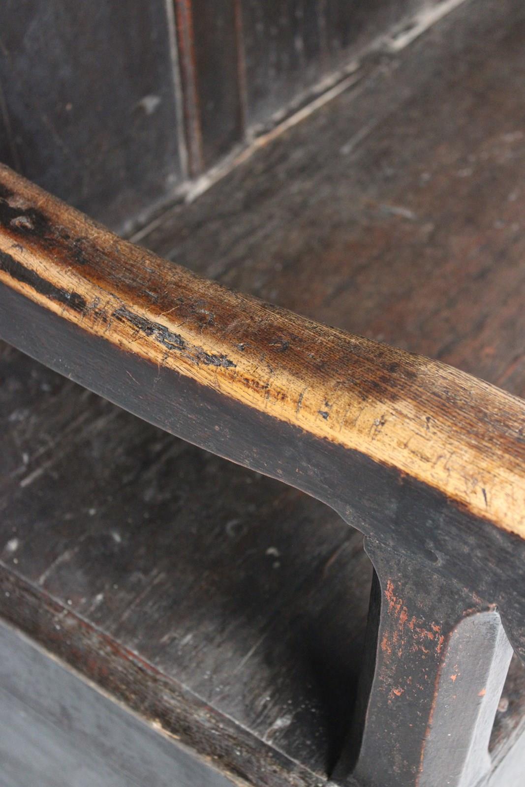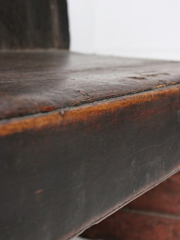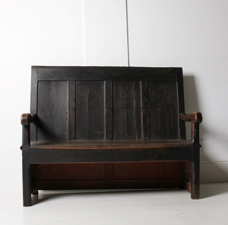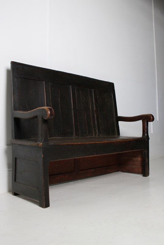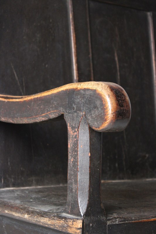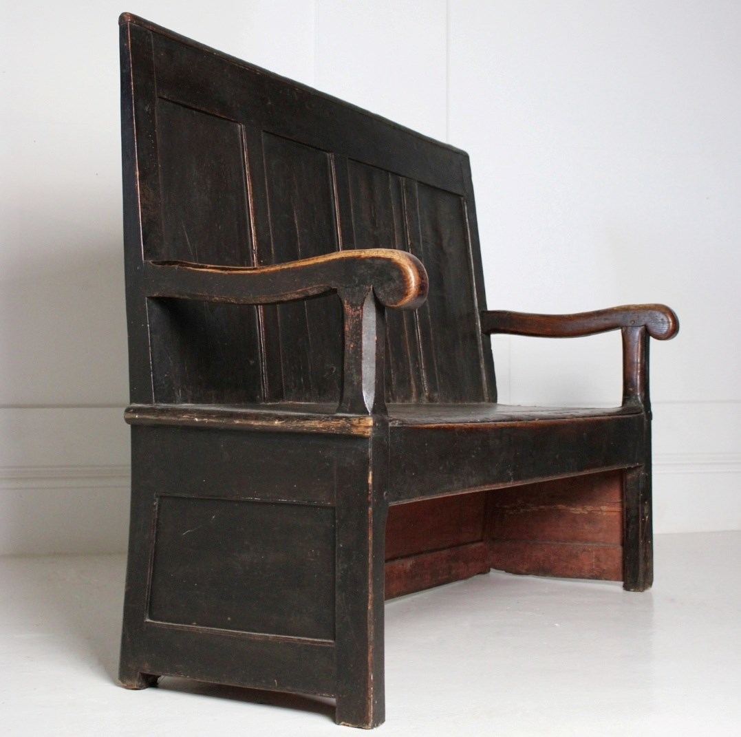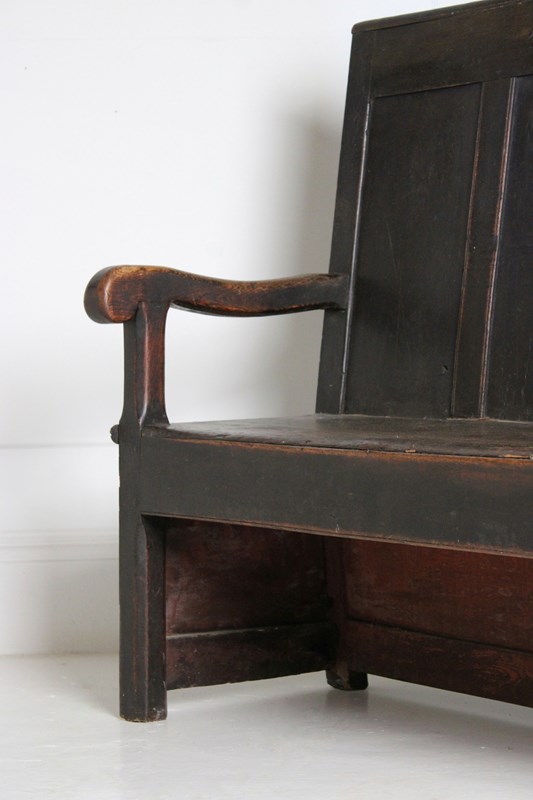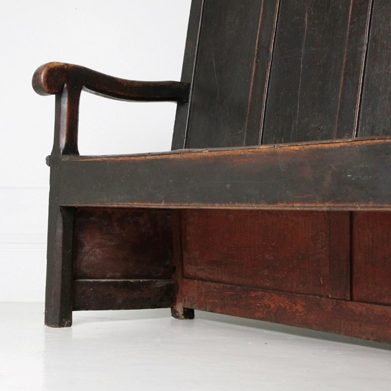 An untouched 18th century country settle in Oak, retaining its original dry finish and boasting outstanding wear in all the right places. H:114cm W:138cm D:54cm