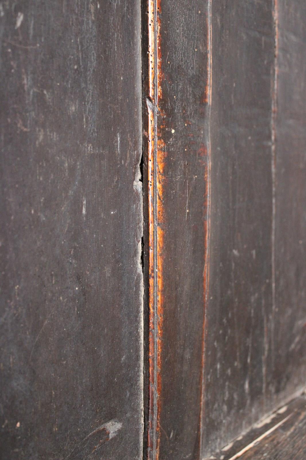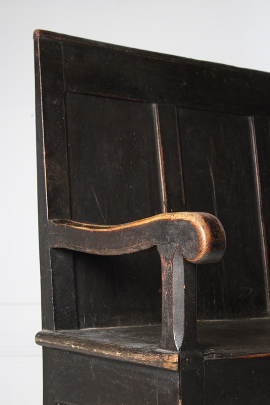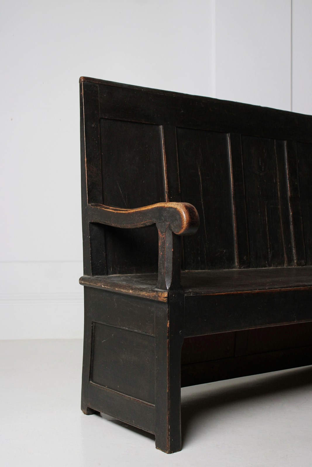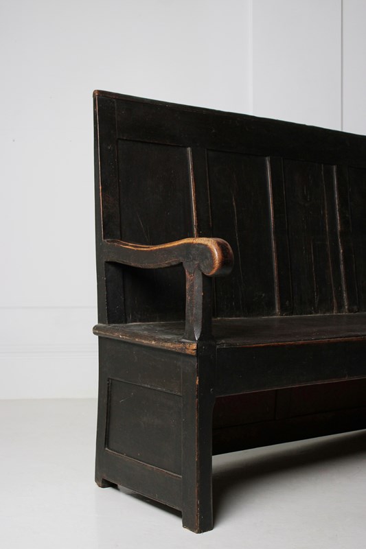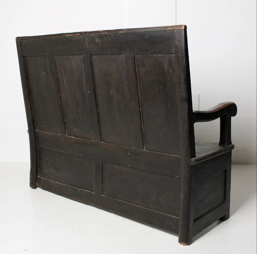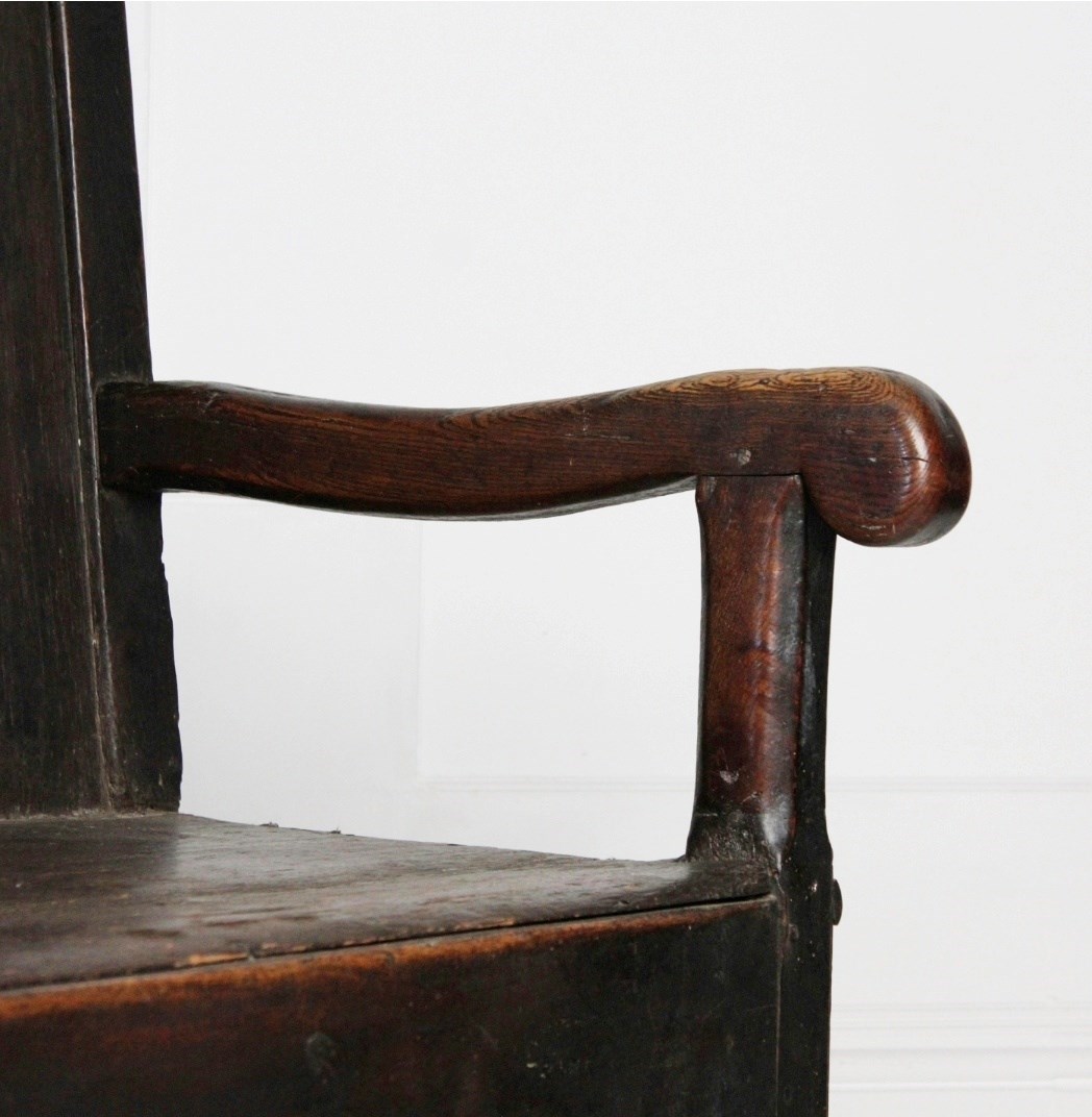 An untouched 18th century country settle in Oak, retaining its original dry finish and boasting outstanding wear in all the right places. H:114cm W:138cm D:54cm