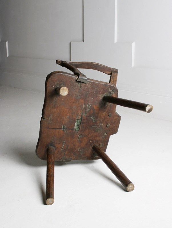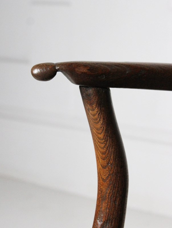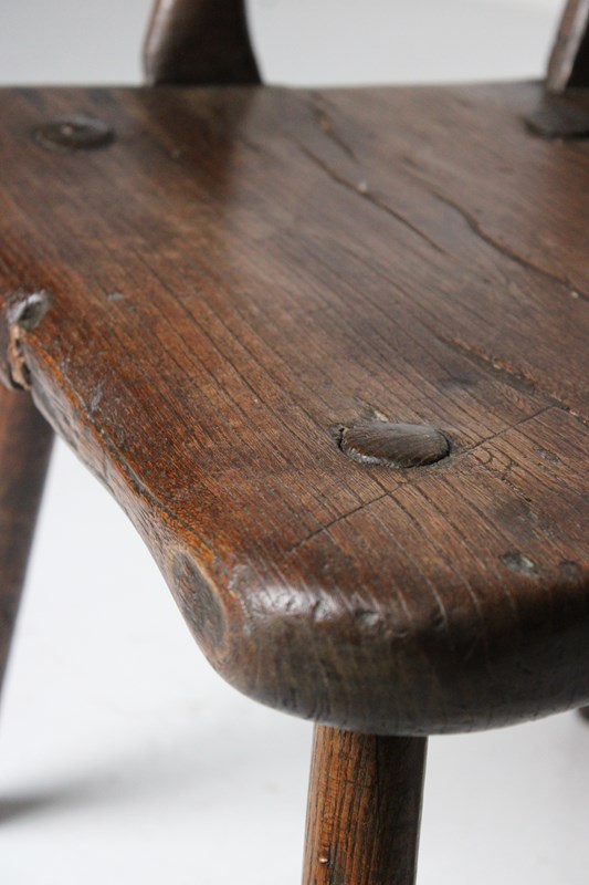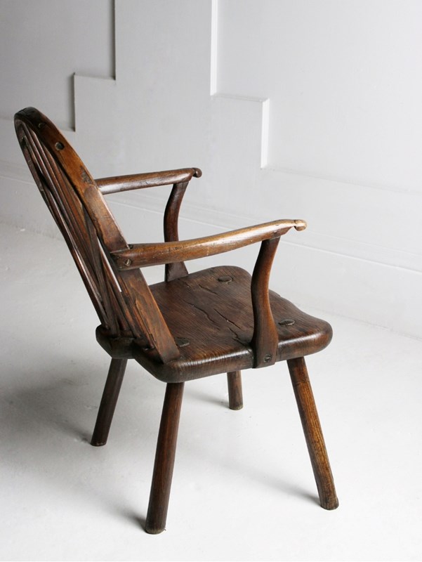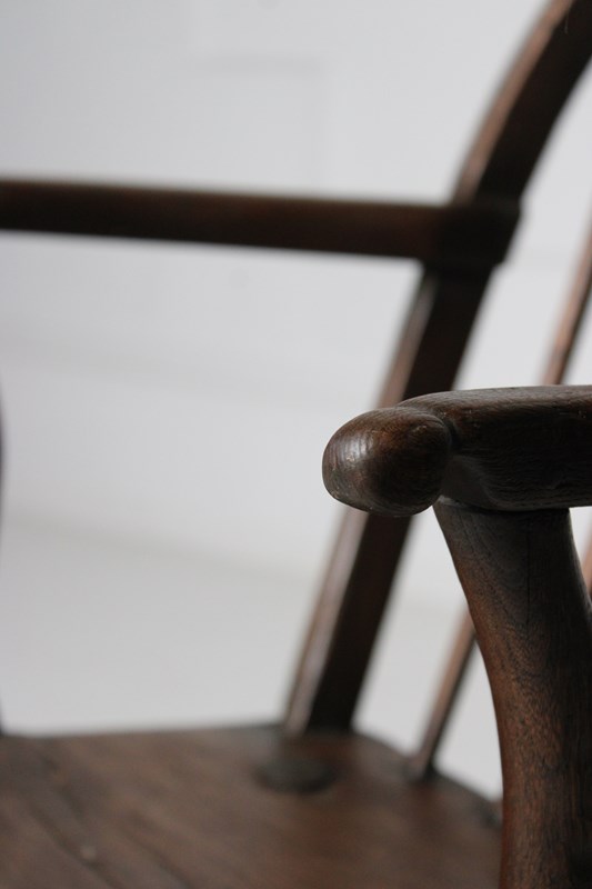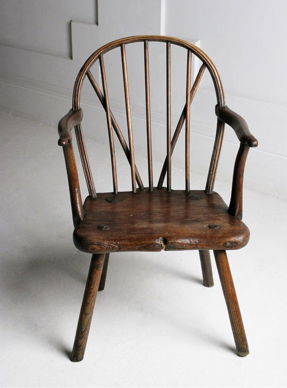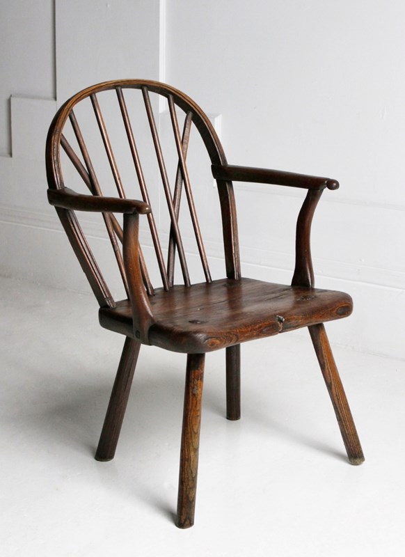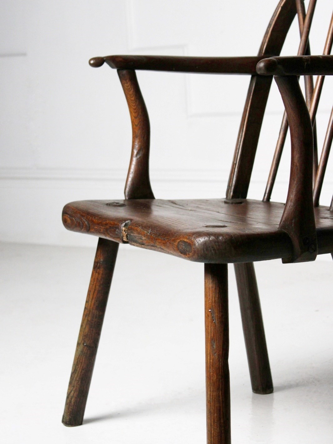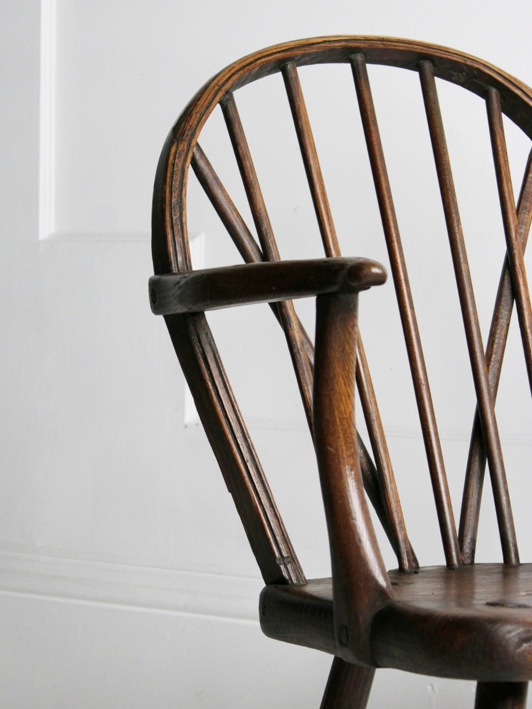 A remarkable 18th century vernacular hoop back forest chair in Ash & Elm, boasting a thick slab seat, soft warm patination, retaining traces of its original green paint to its underside.
