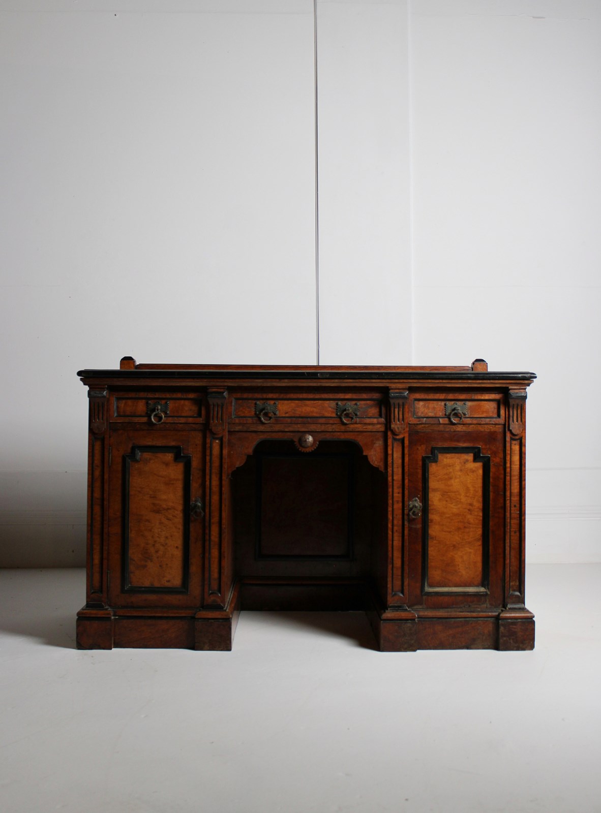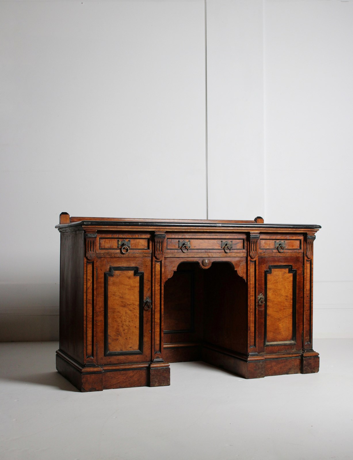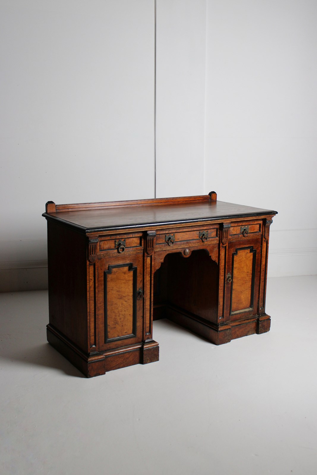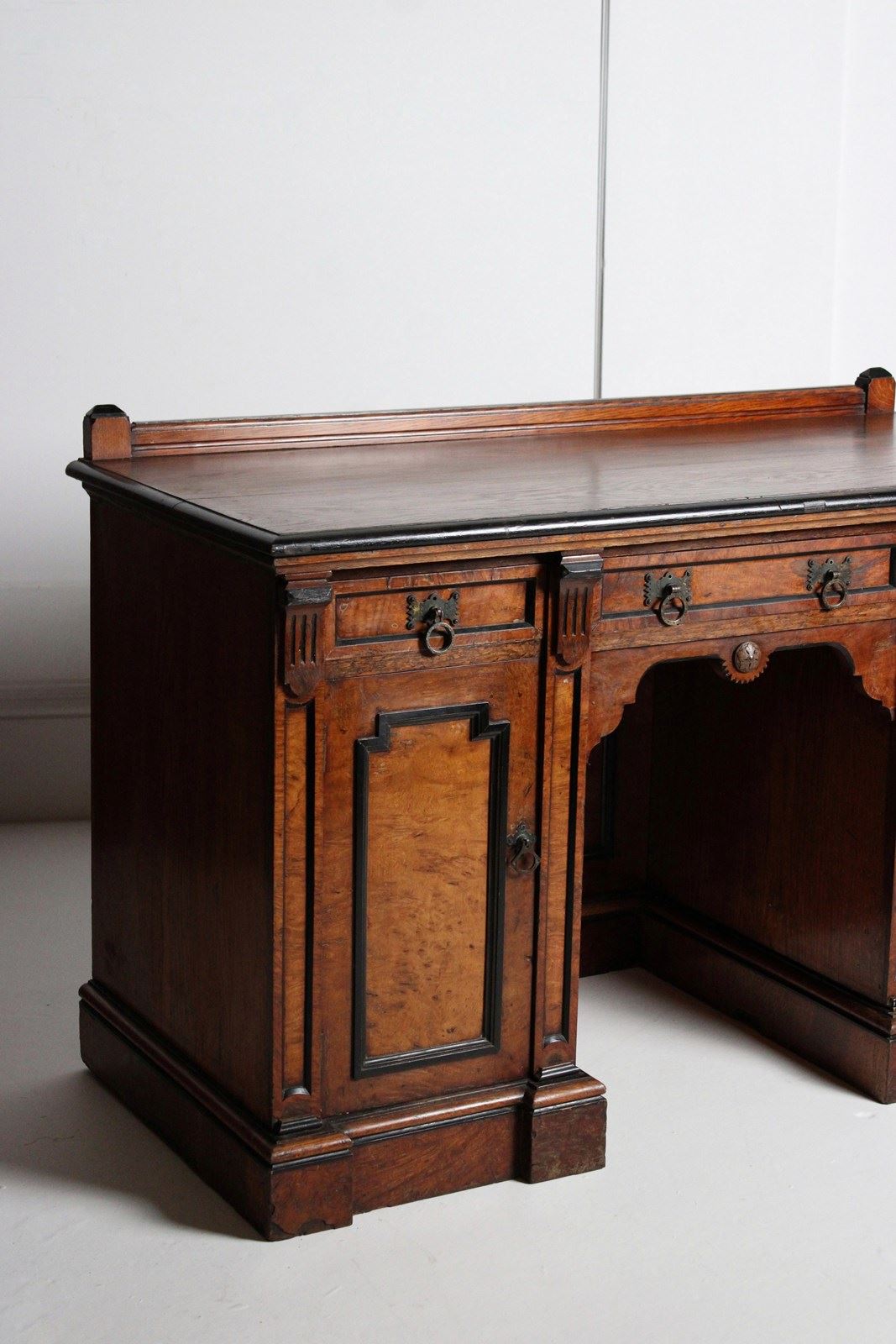A handsome 19th century aesthetic movement kneehole desk in Oak, with burr, satinwood and ebonised detail. Retaining its original brass hardware.