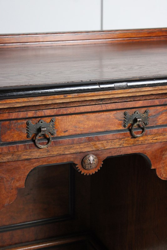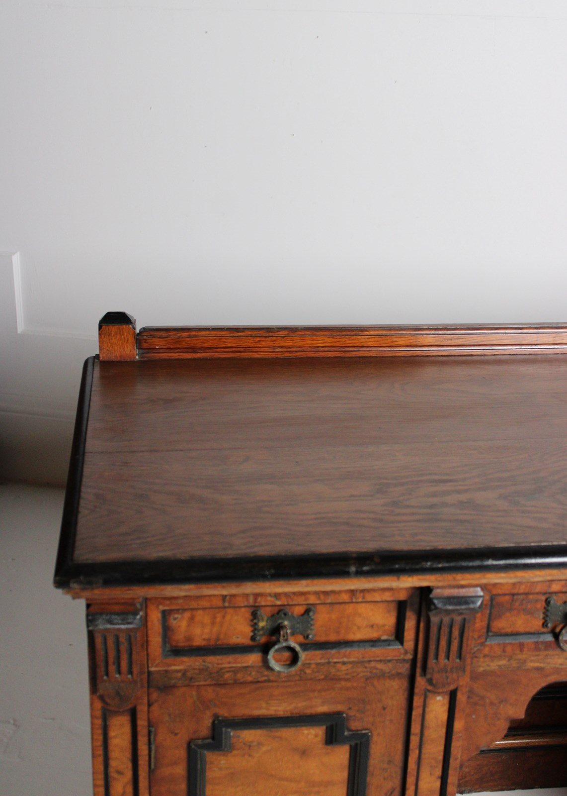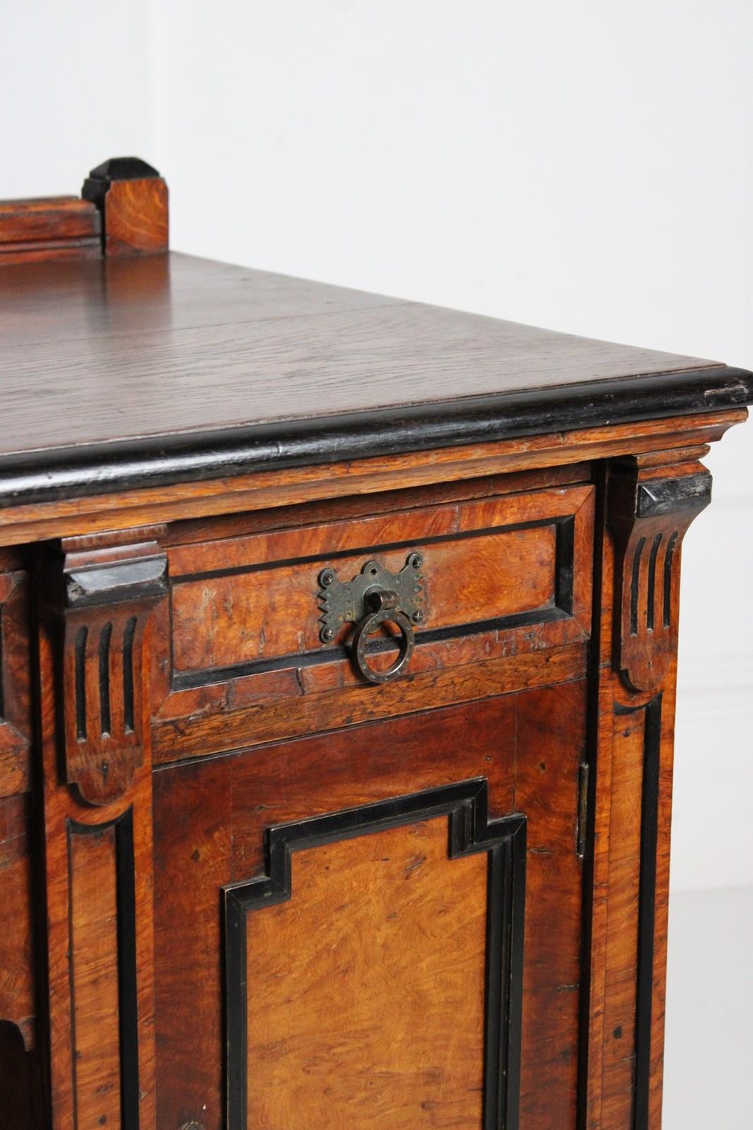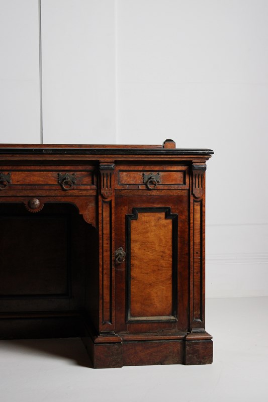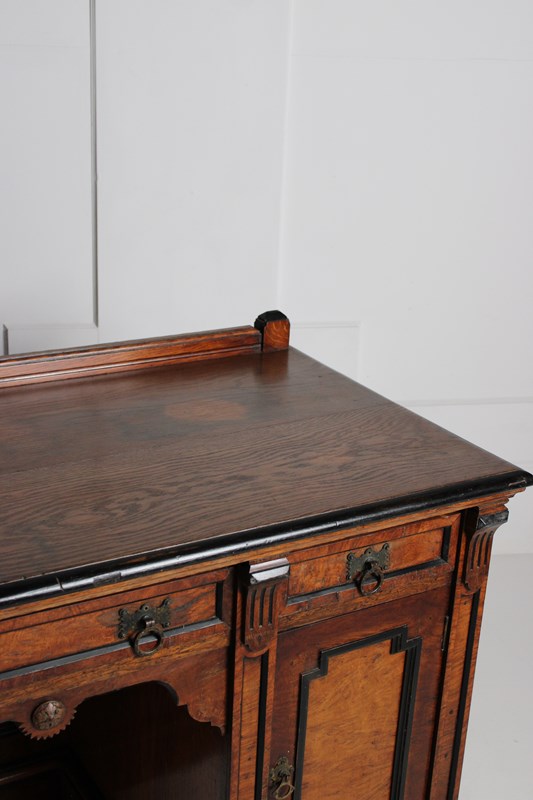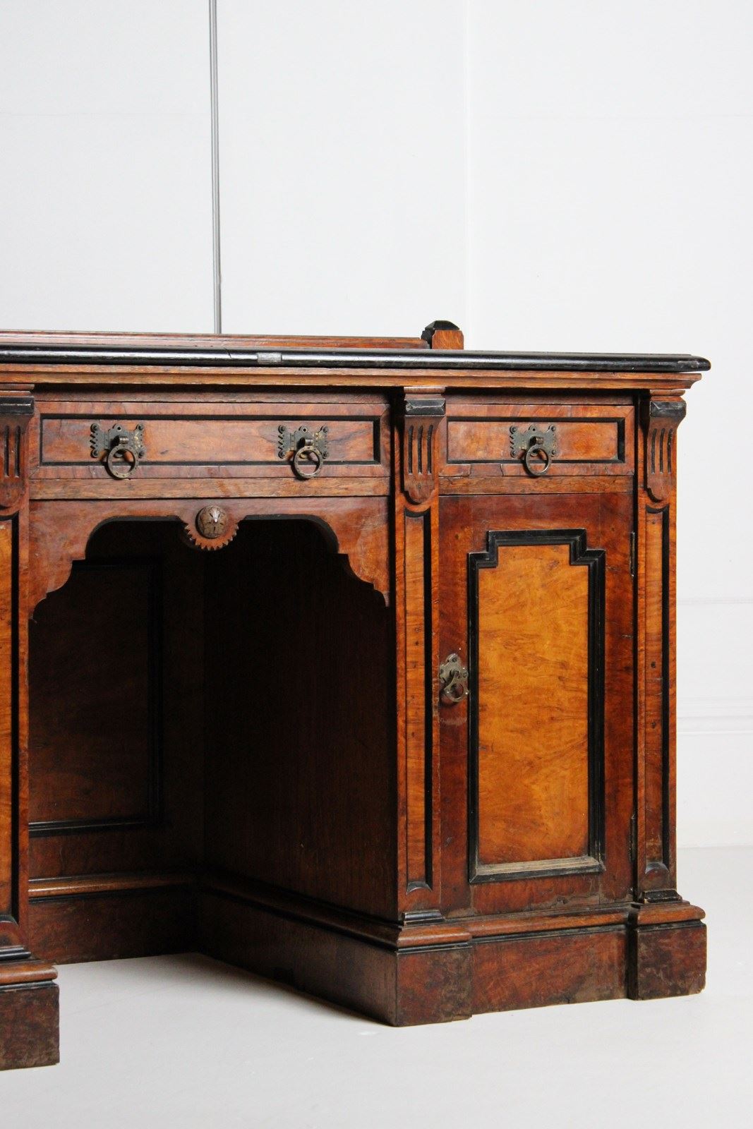 A handsome 19th century aesthetic movement kneehole desk in Oak, with burr, satinwood and ebonised detail. Retaining its original brass hardware.