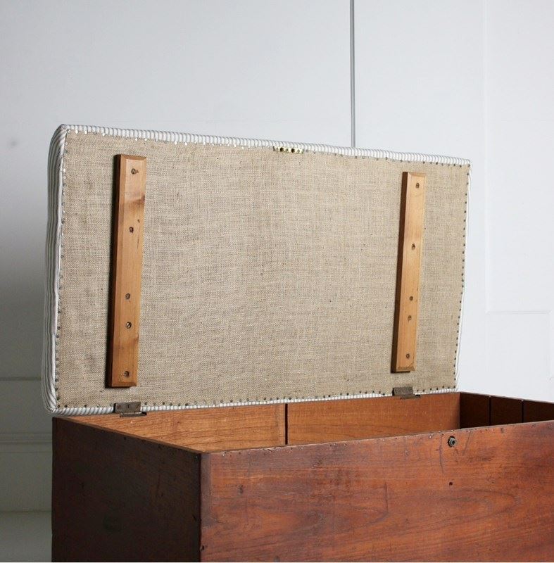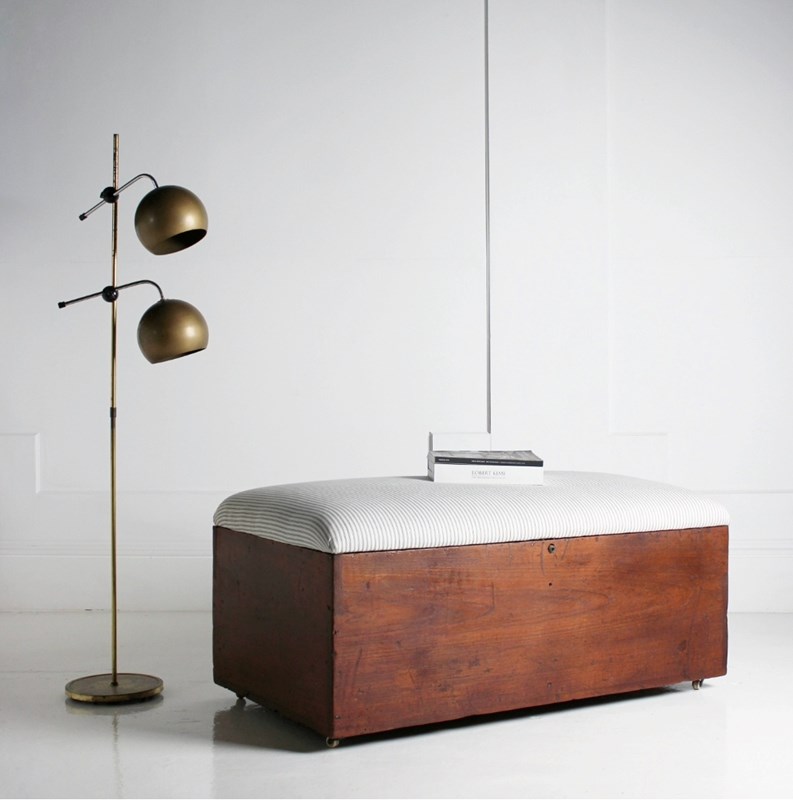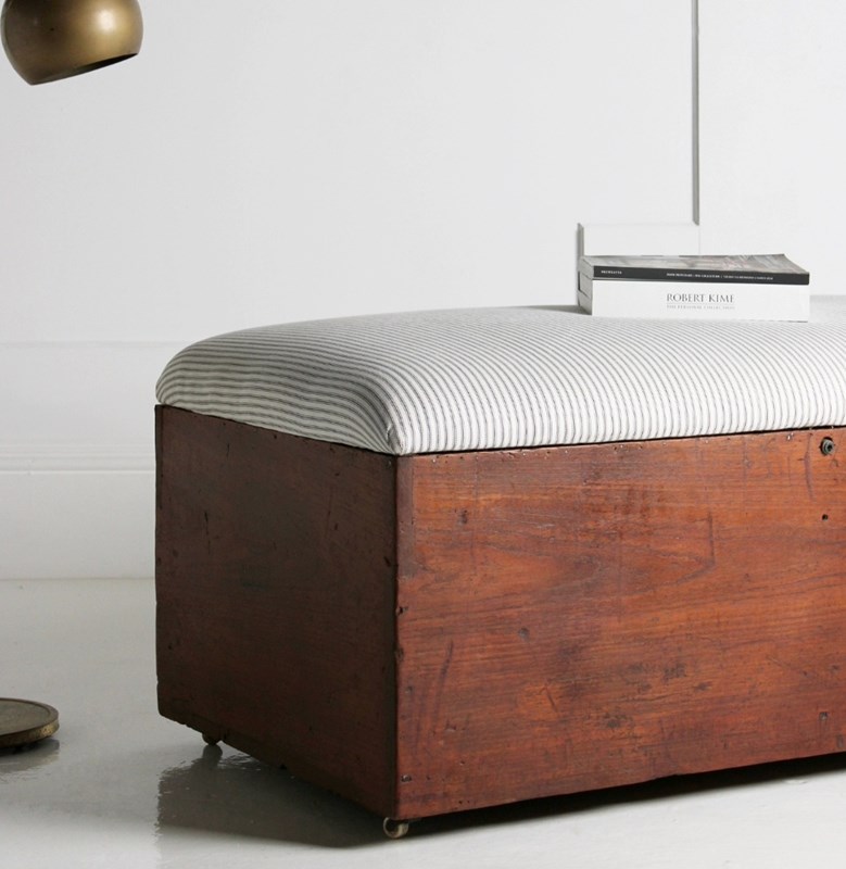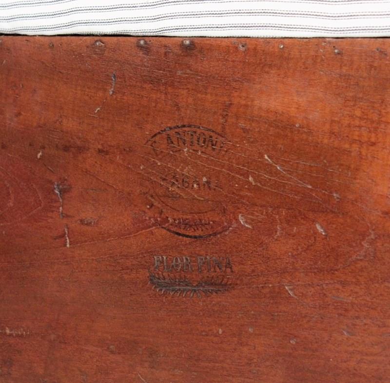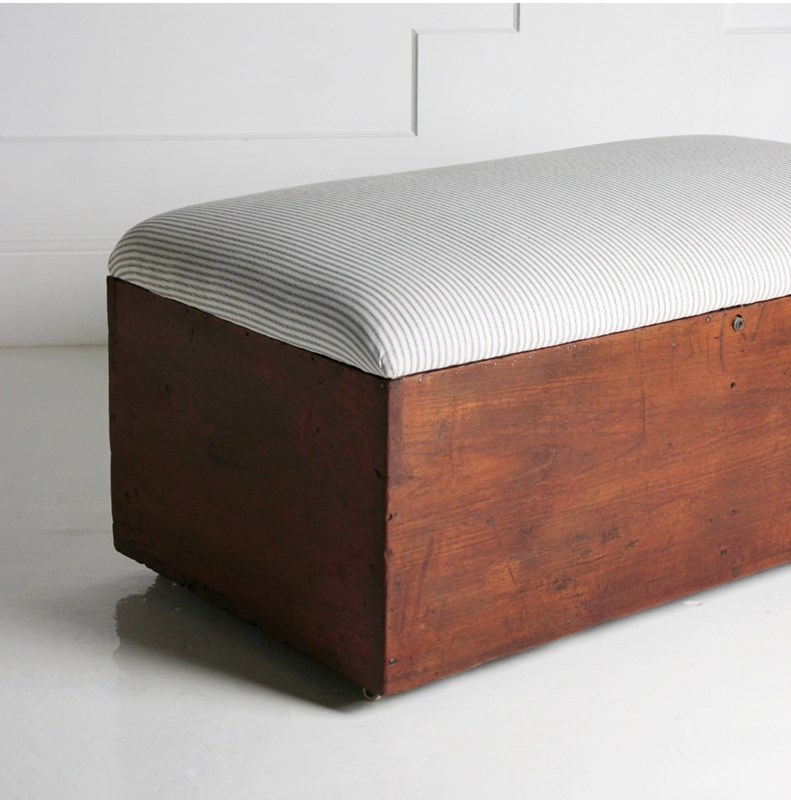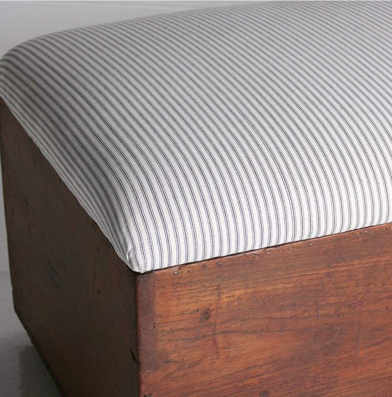 A large early 20th century box seat/coffee table, made from a Habana cigar crate, constructed cuban Mahogany, resting on ceramnic castors. Retaining its original stamps to each end. Its top upholstered in fresh natural cotton striped ticking.