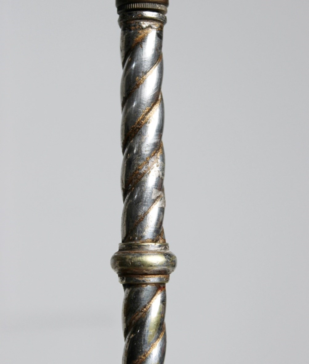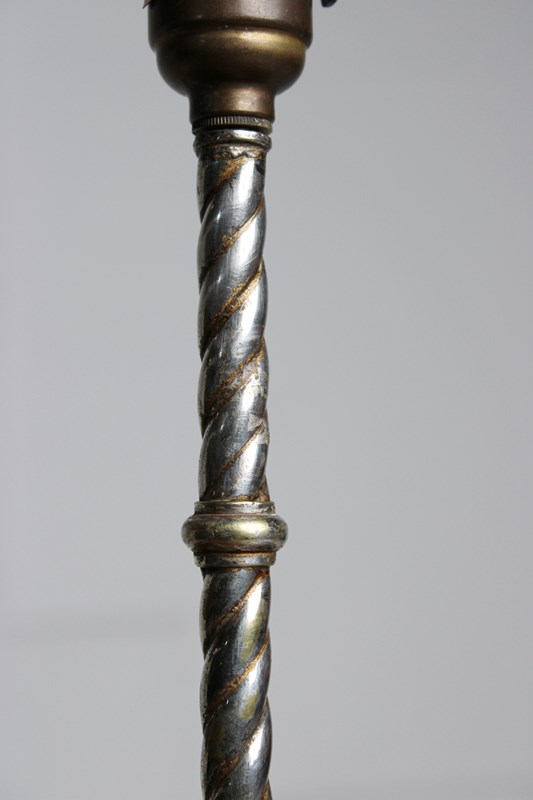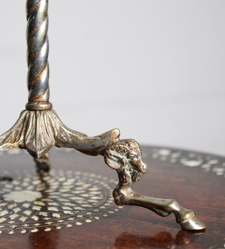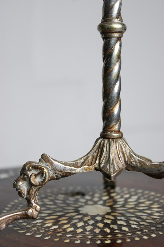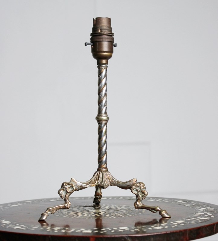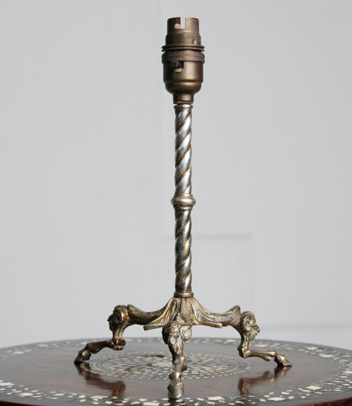 A decorative early 20th century tripod table lamp, its legs embellished with rams heads and hoof feet, with remnants of is orginal gilding.