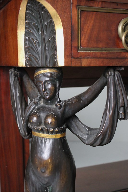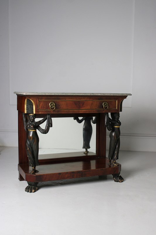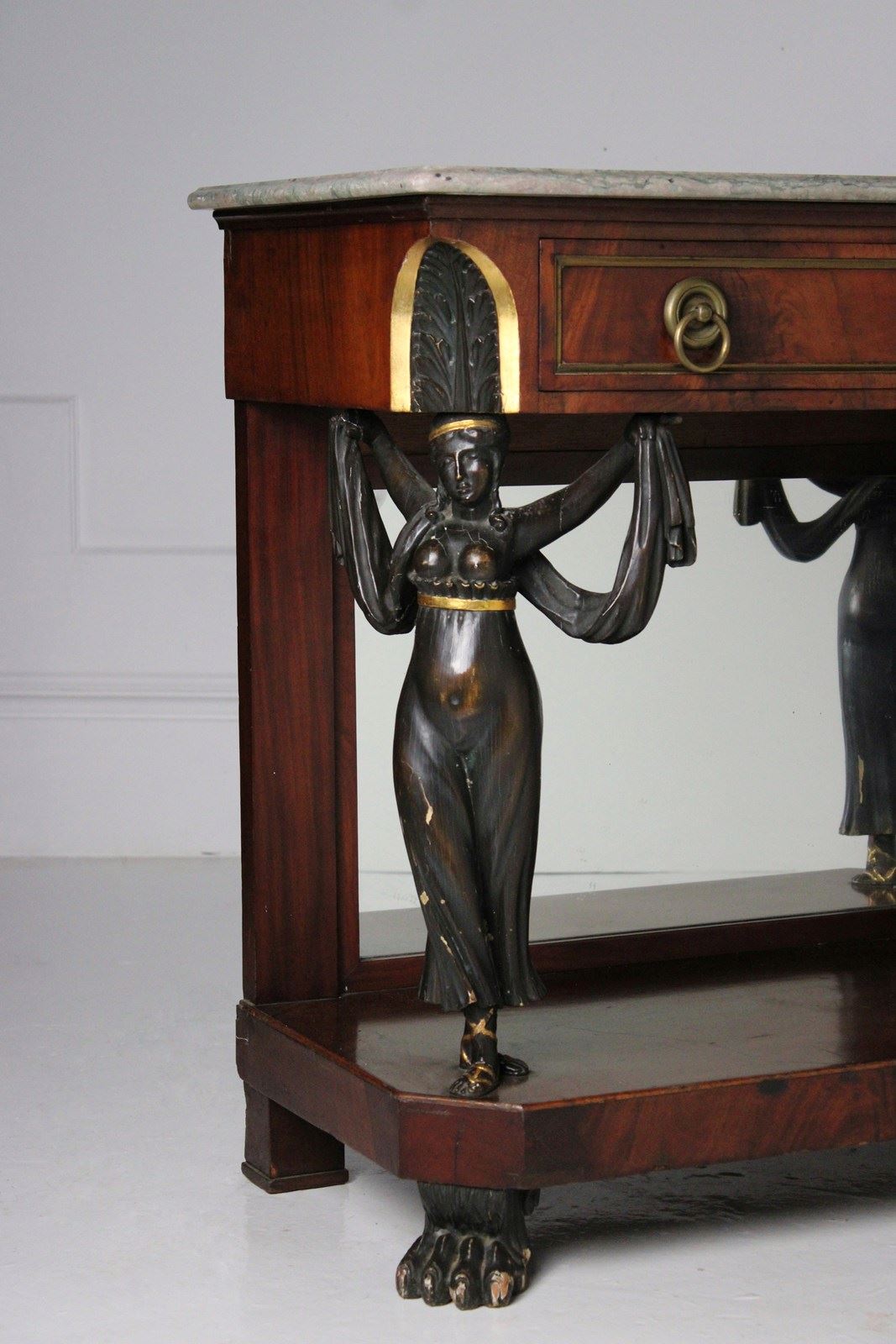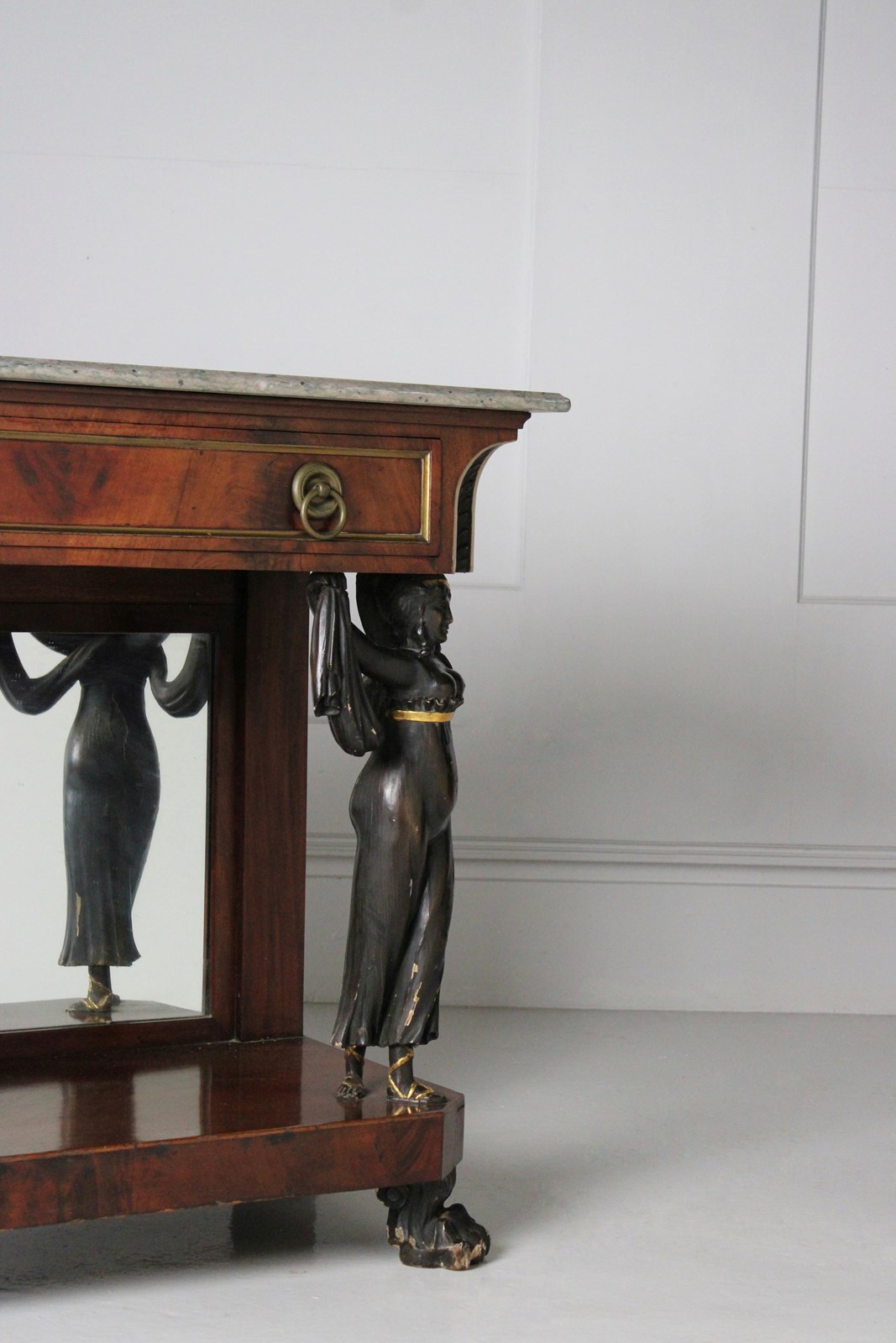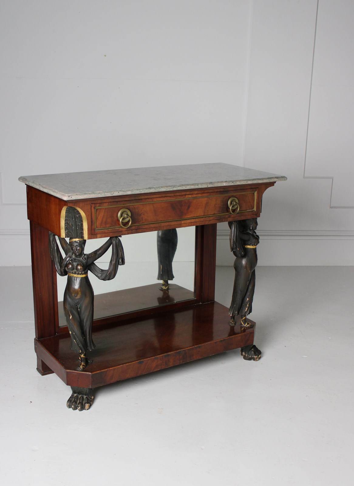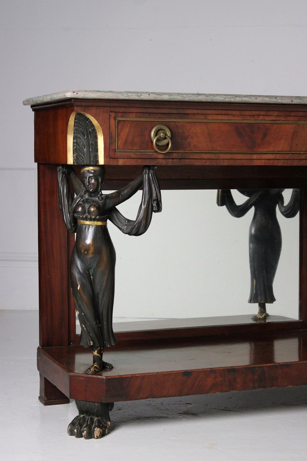 A mirror backed french empire mahogany console table, embellished with caryatid figured columns, resting on paw feet.