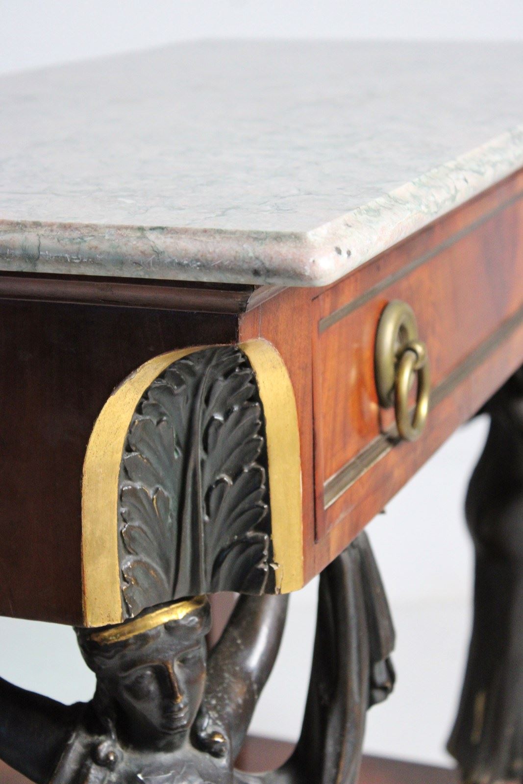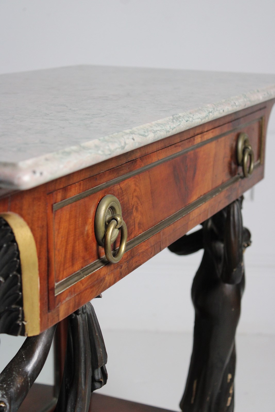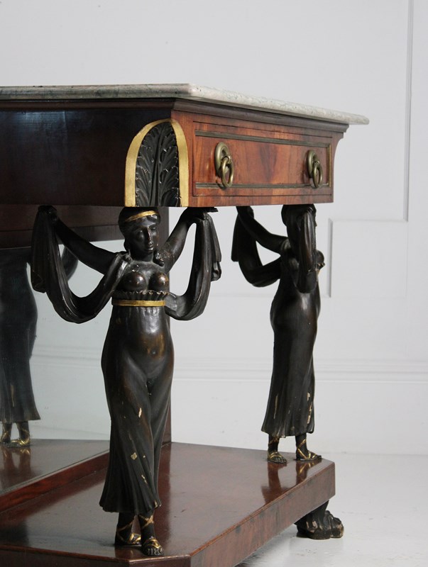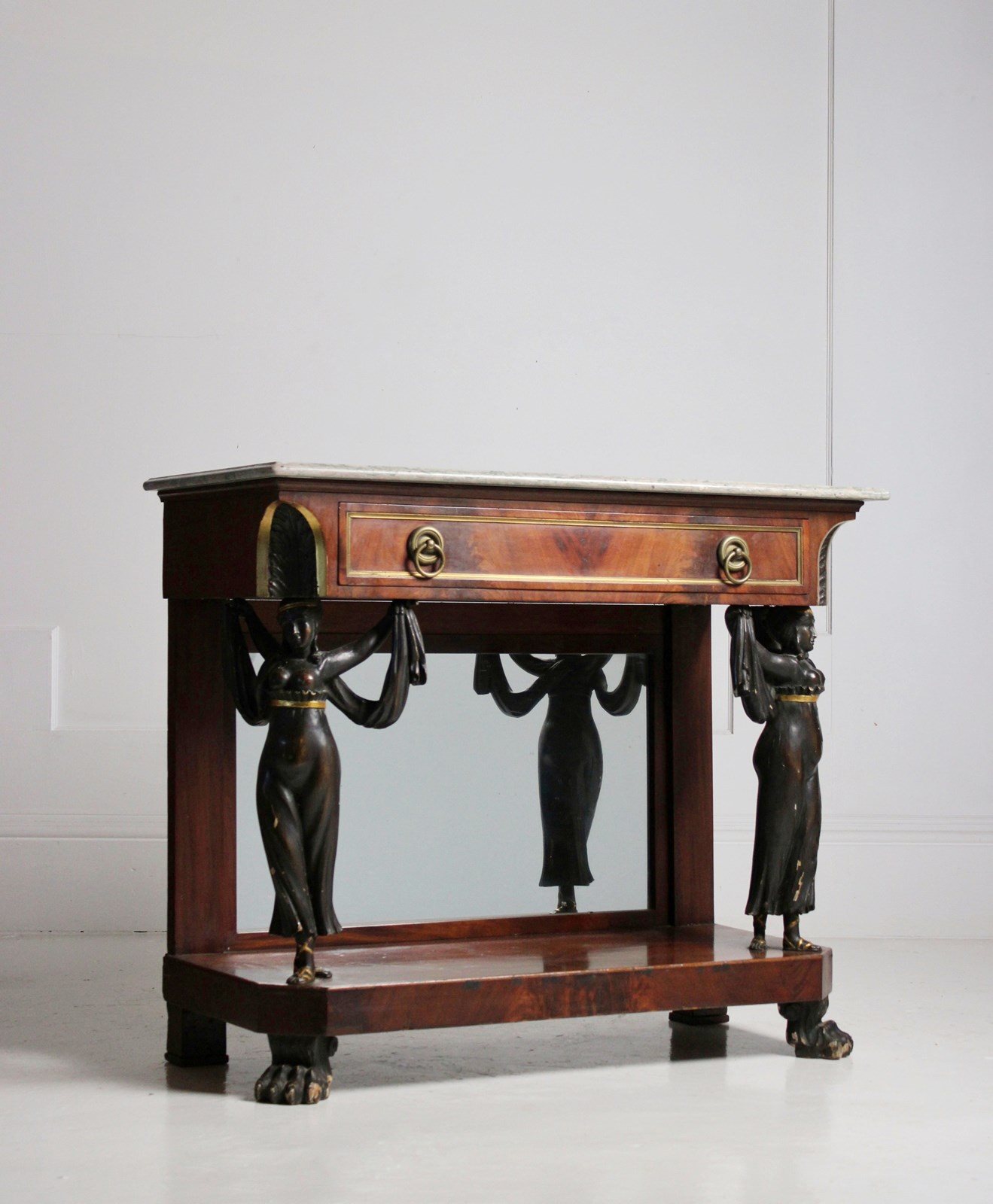 A mirror backed french empire console table in Walnut, embellished with Egyptian style figured columns, resting on paw feet.