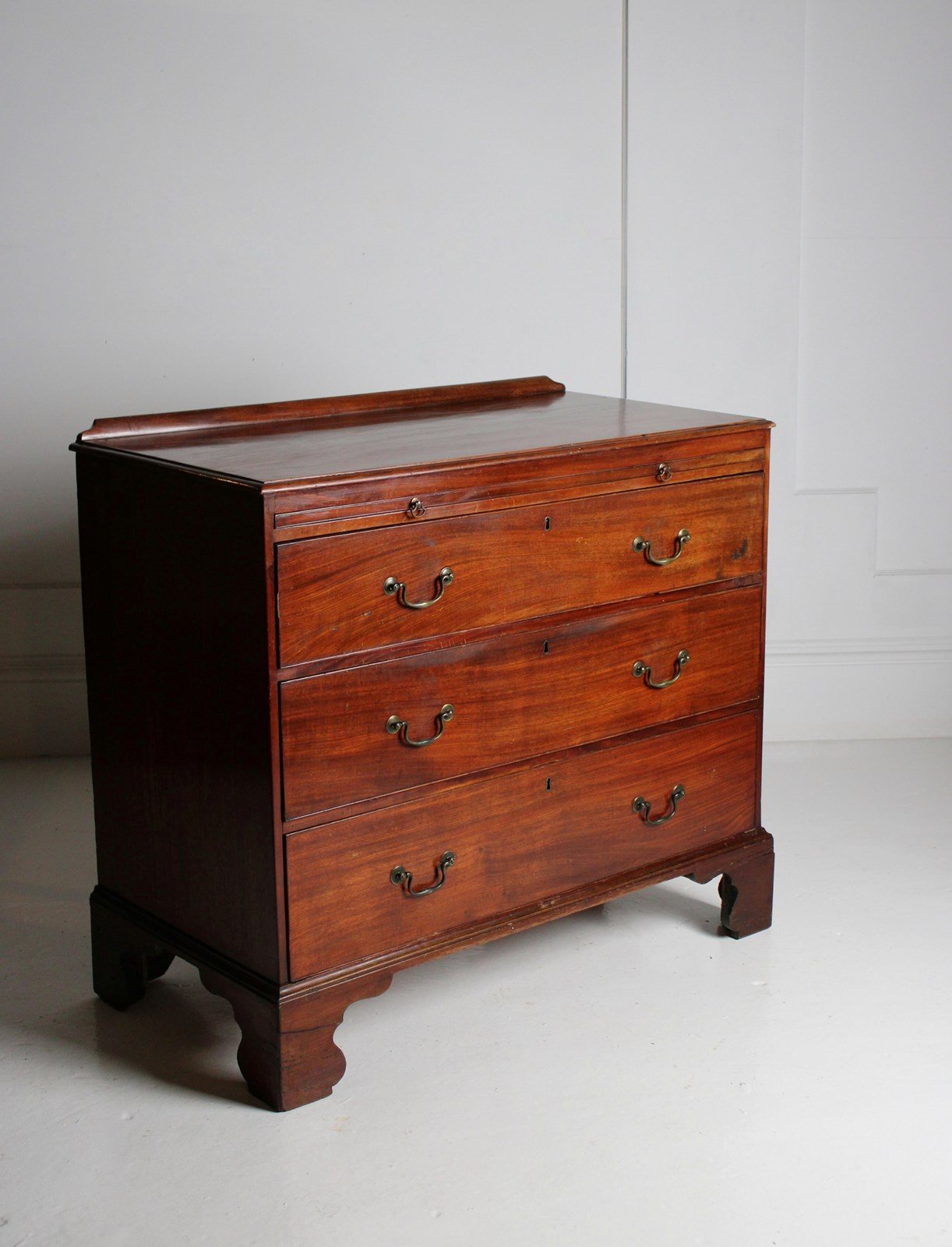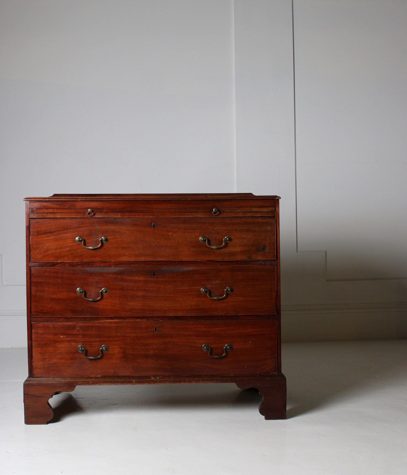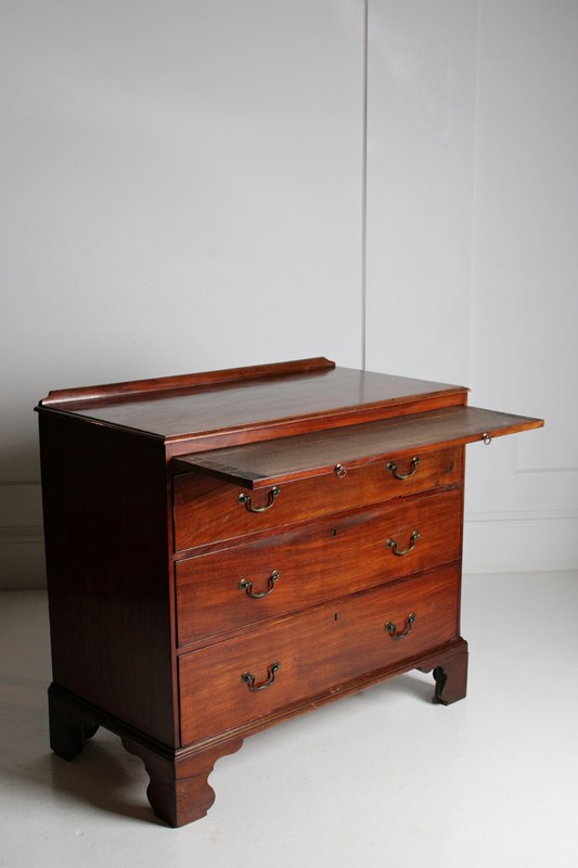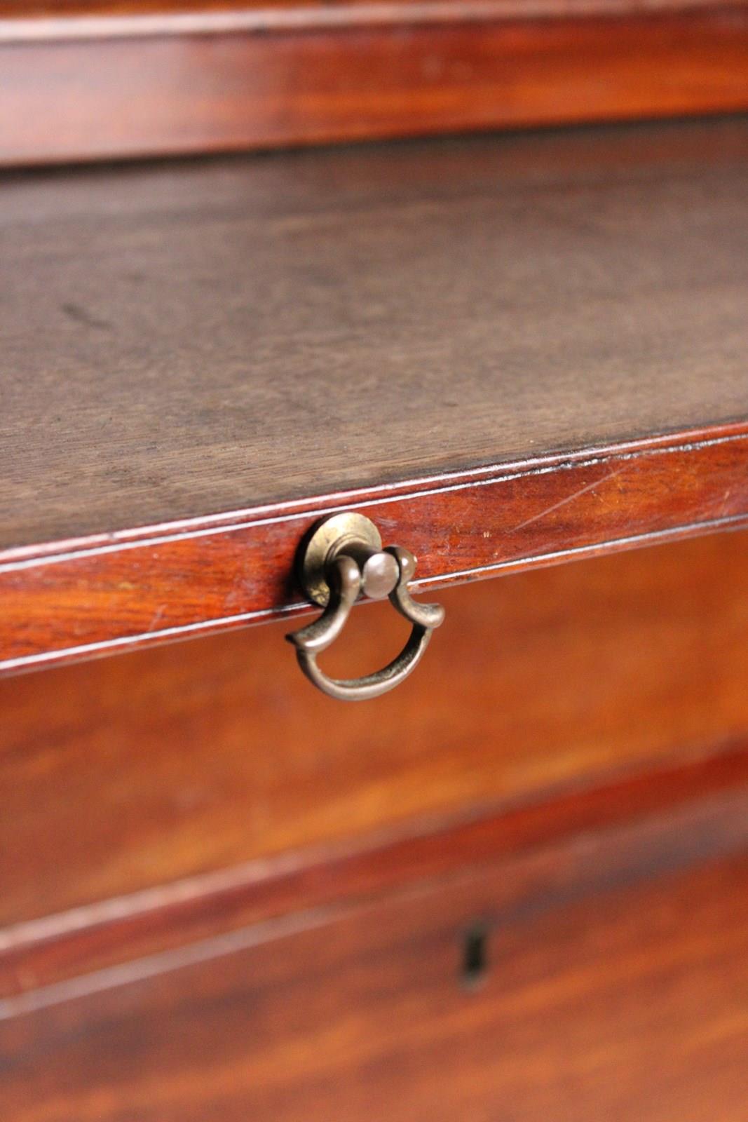 A well proportioned George III chest of drawers in mahogany, with brushing slide with axe head handles, retaining its original brass Swan neck handles to the drawers beneath.
