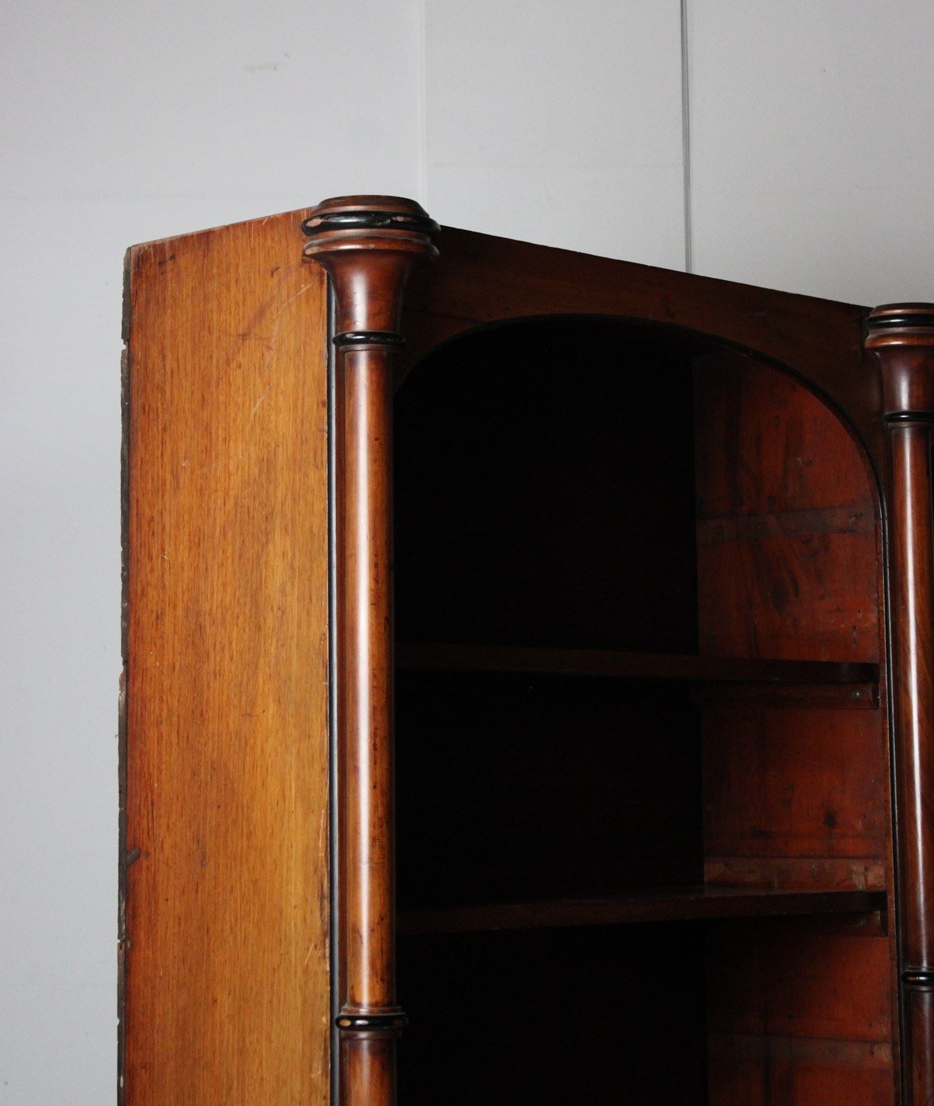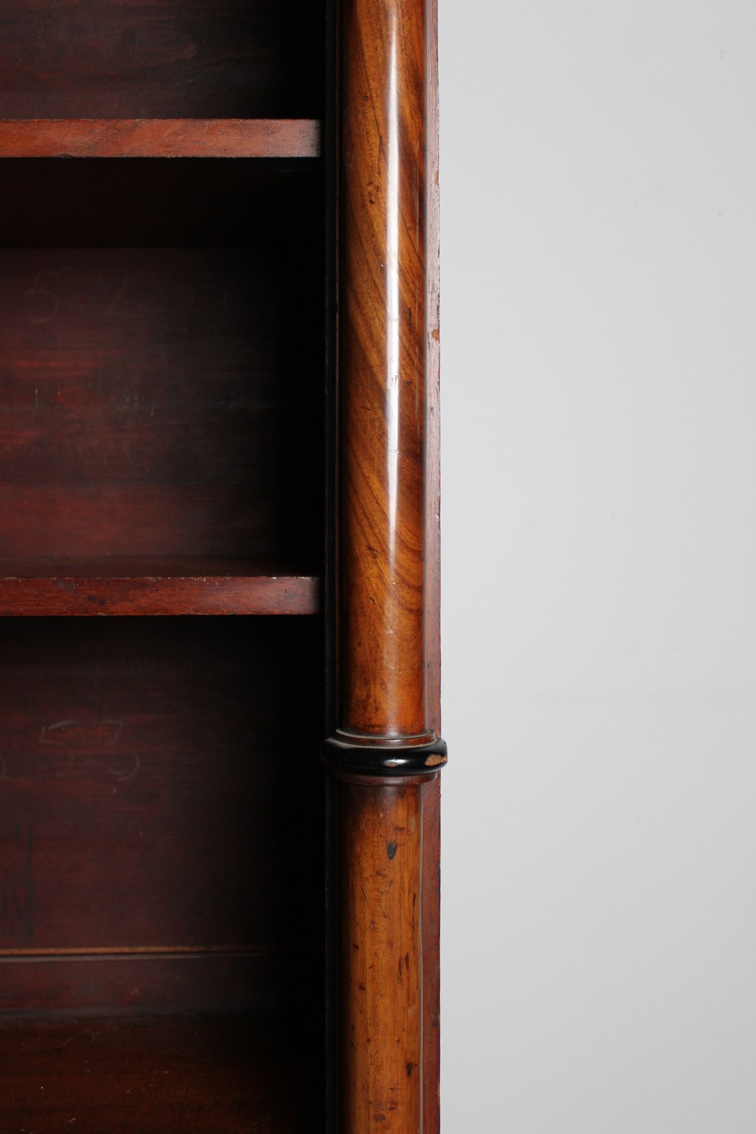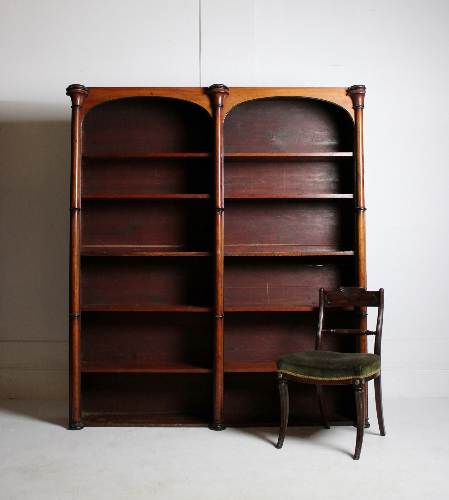 A large 19th century open bookcase in Mahogany, embellished with turned columns.