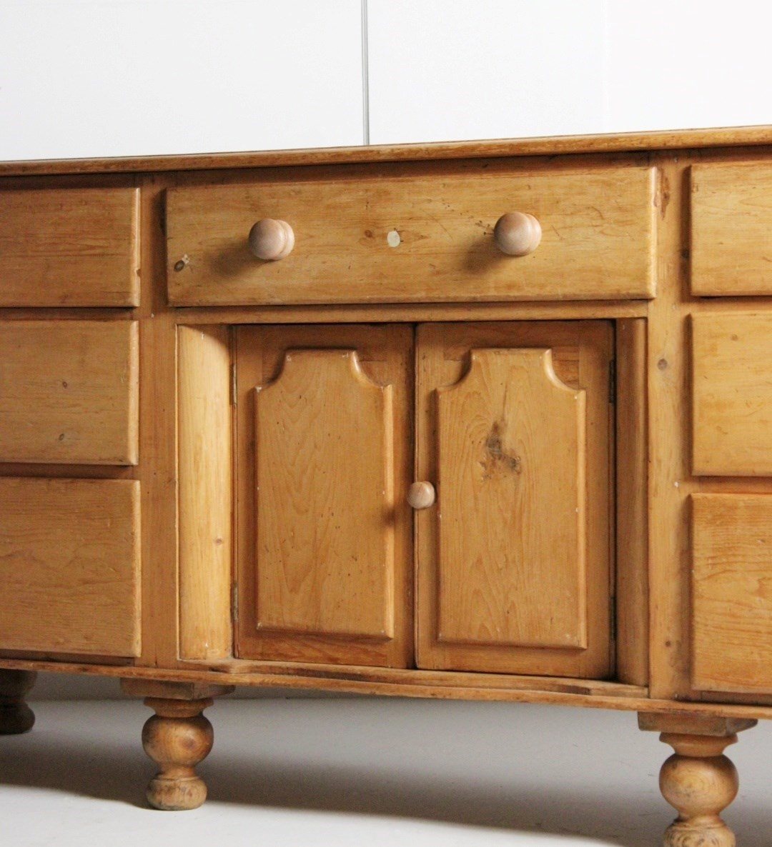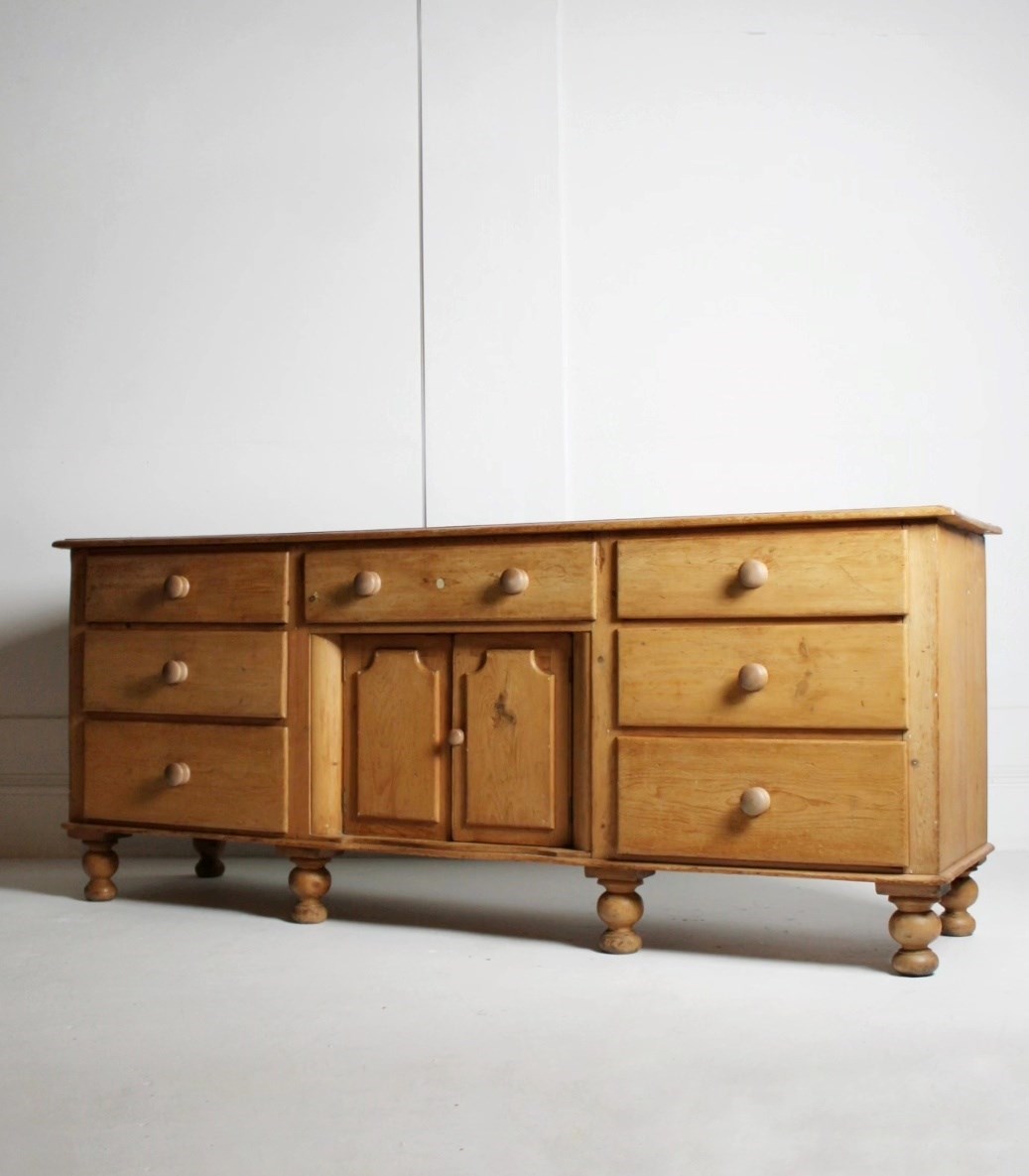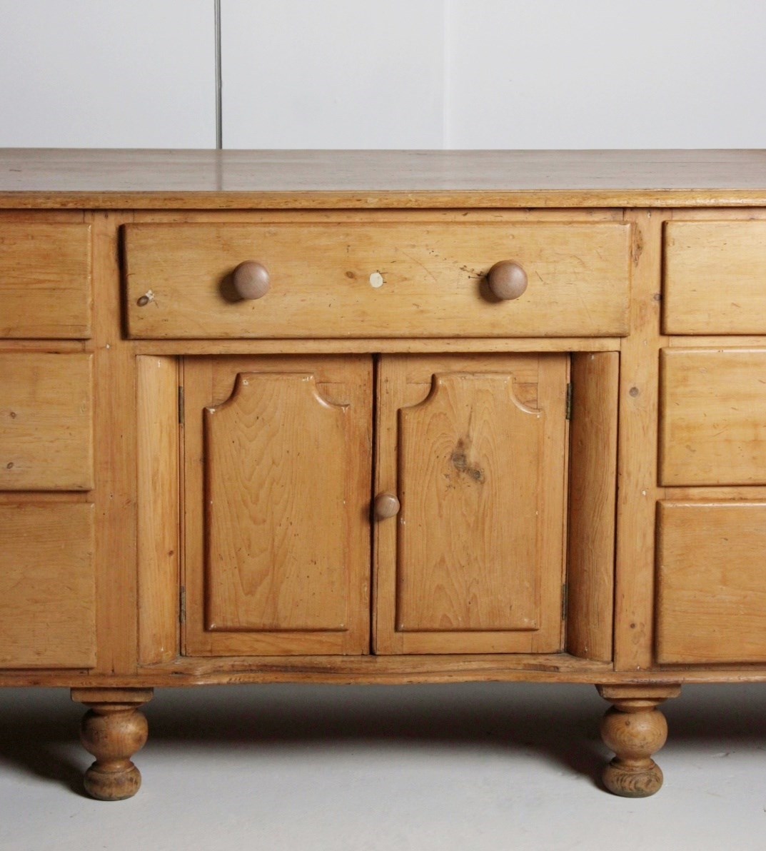 A large 19th century pine farmhouse dresser base, standing on tall turned feet.