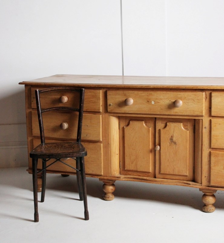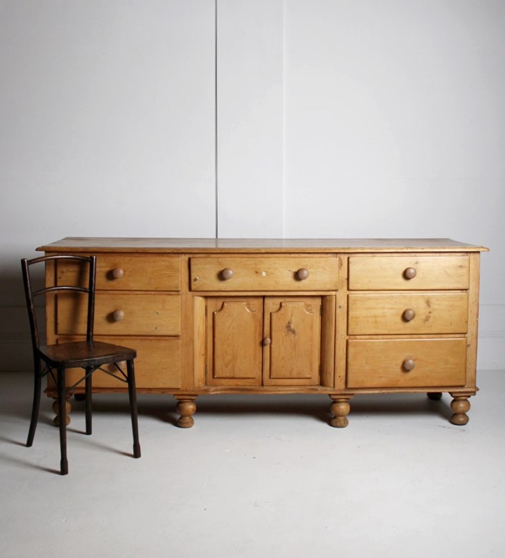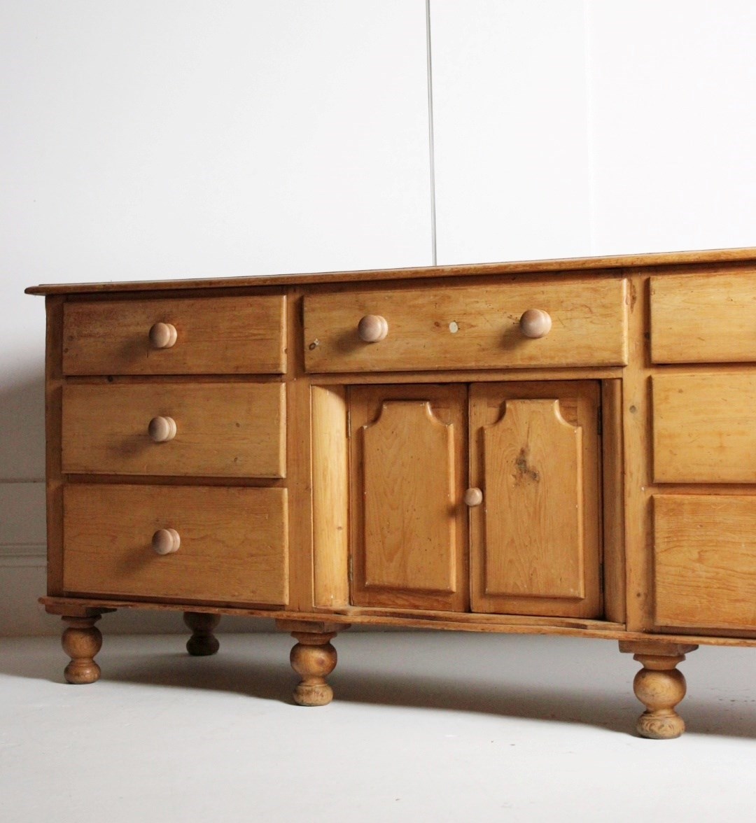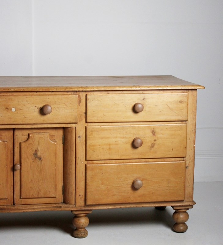 A large 19th century pine farmhouse dresser base, standing on tall turned feet.