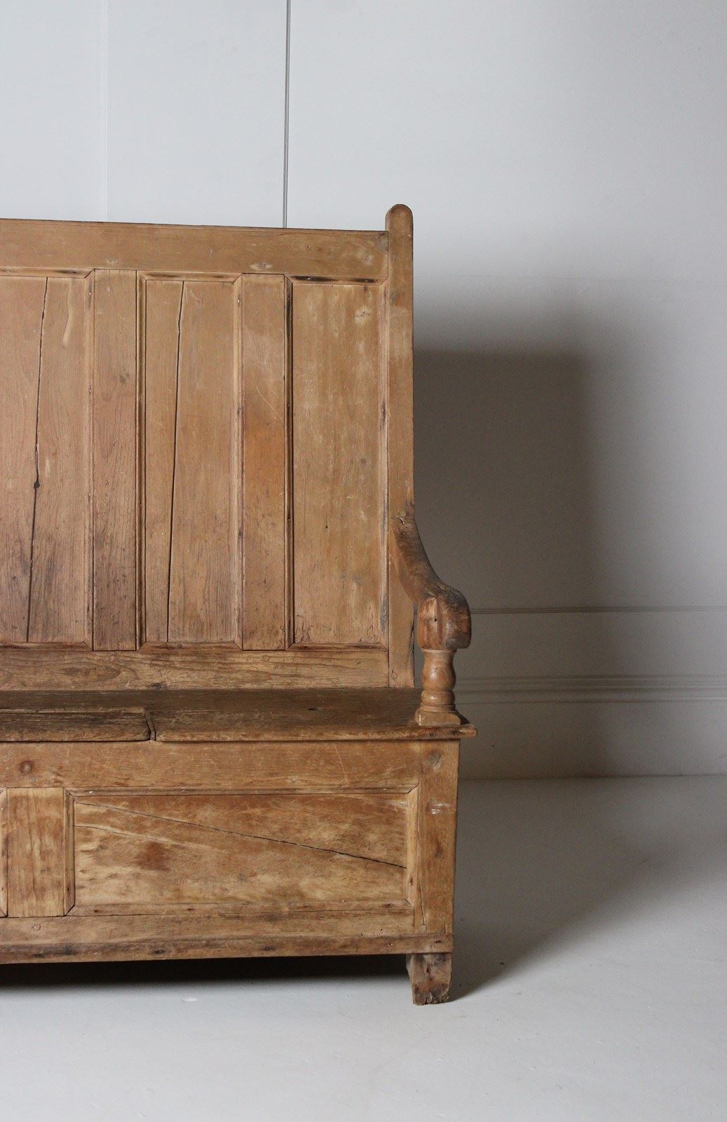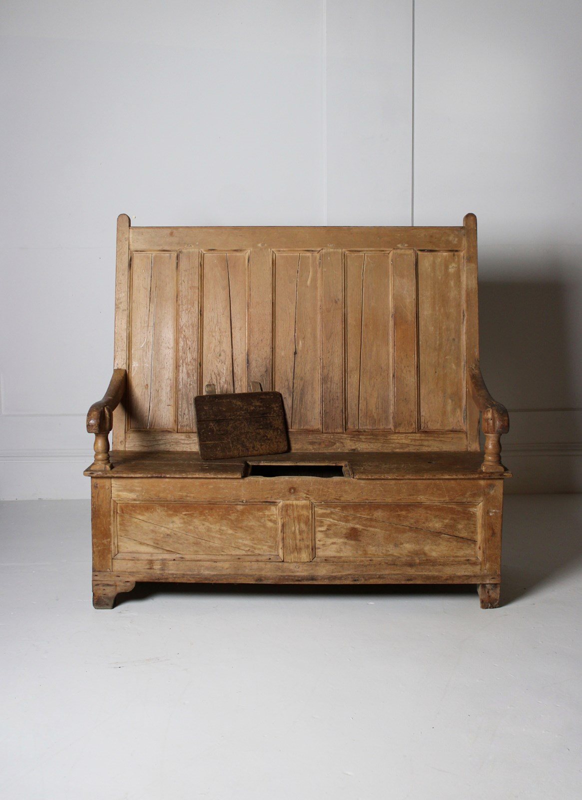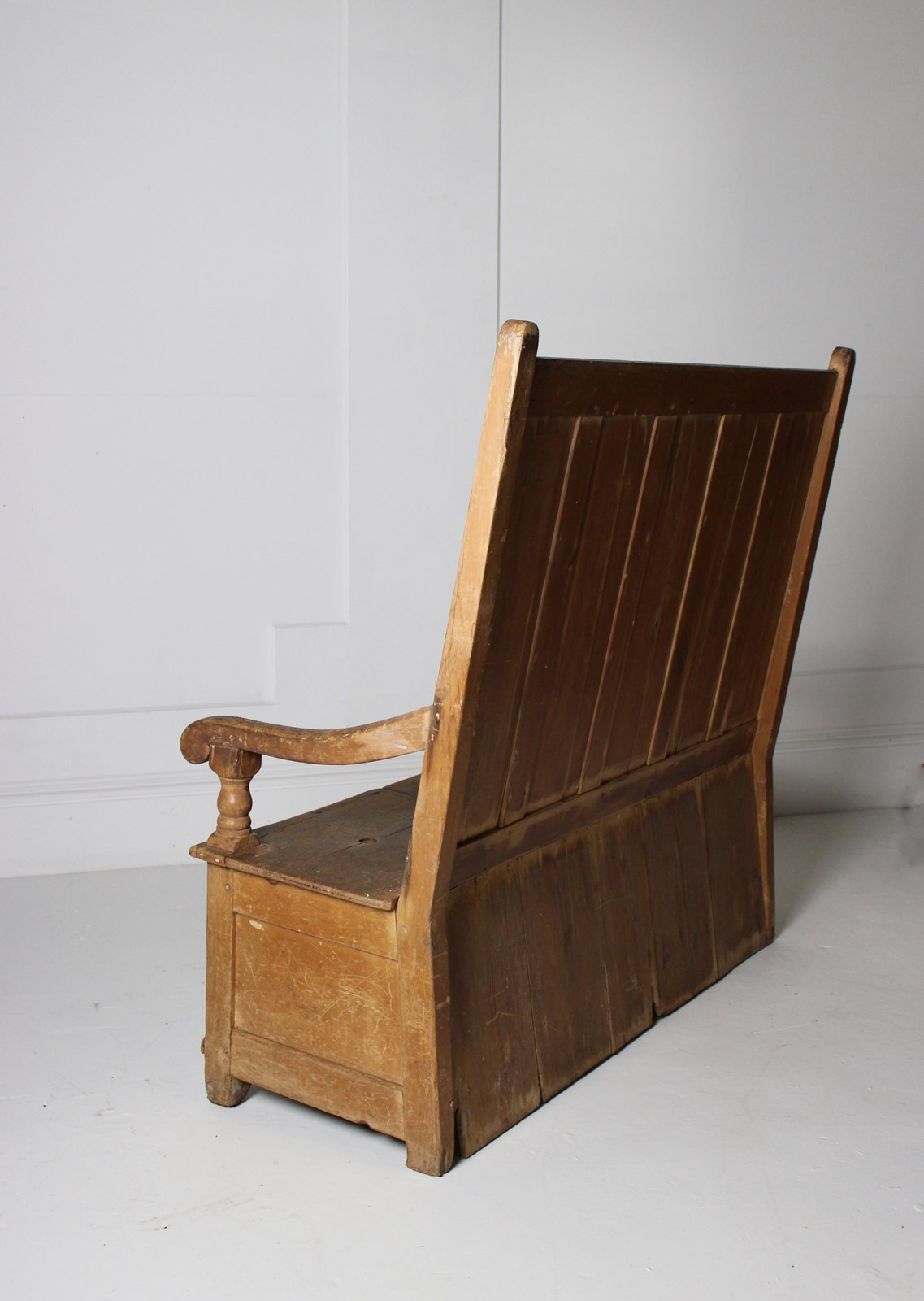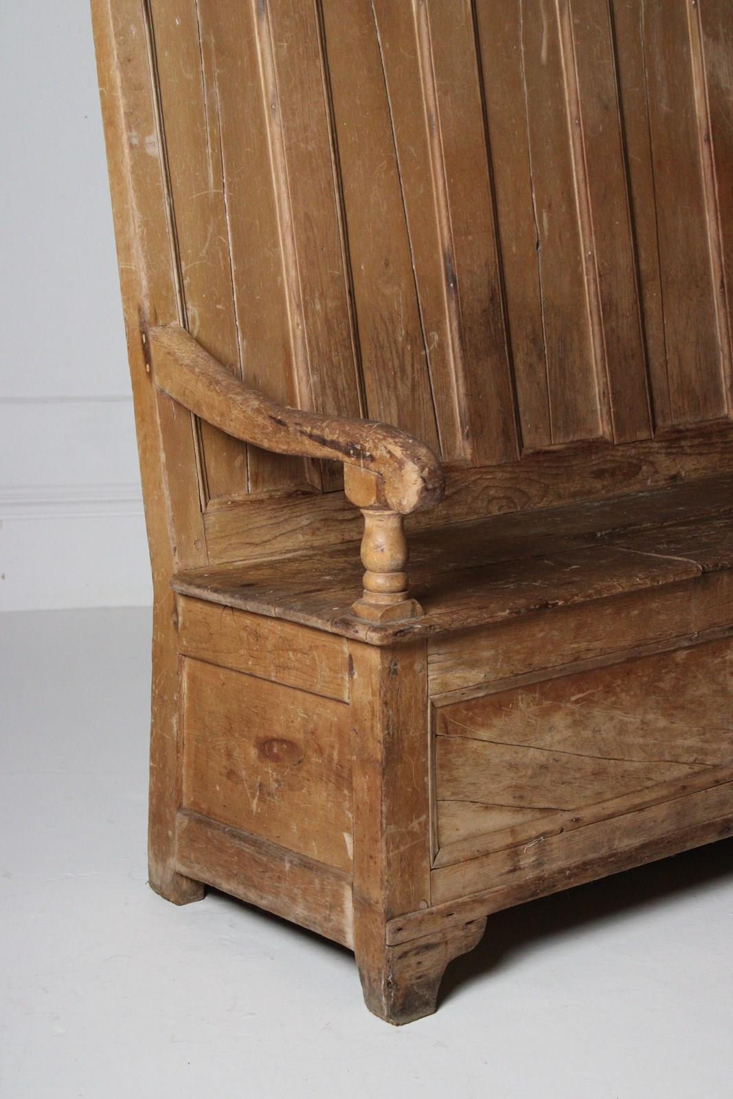 A worn 19th century pine box settle, with lift up storage compartment.