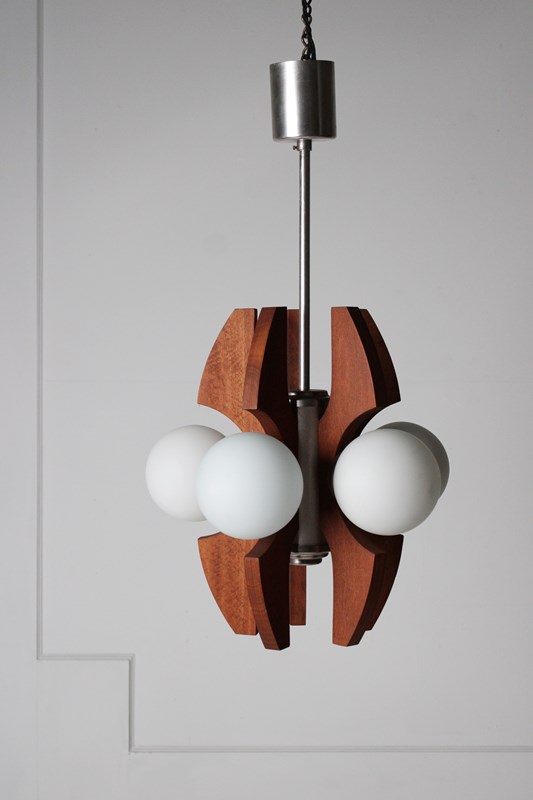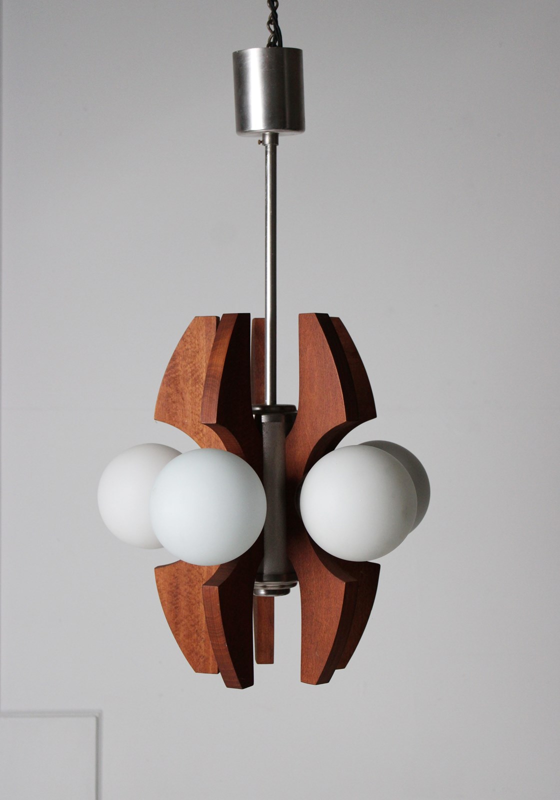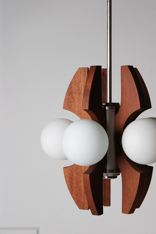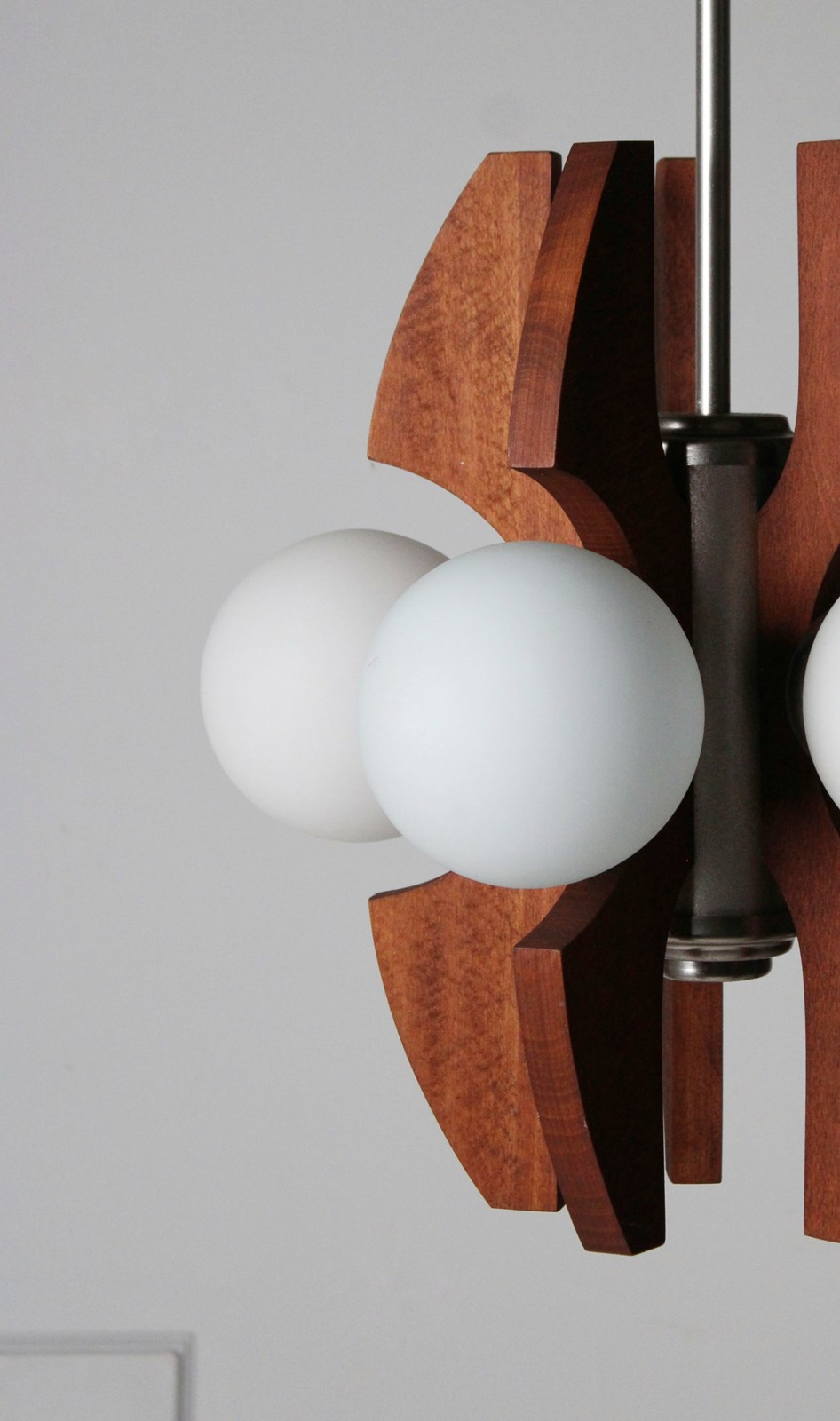 A 1970s teak ceiling light, with spherical opaline glass shades. H:65cm Dia:45cm Supplied re-wired and ready for installation