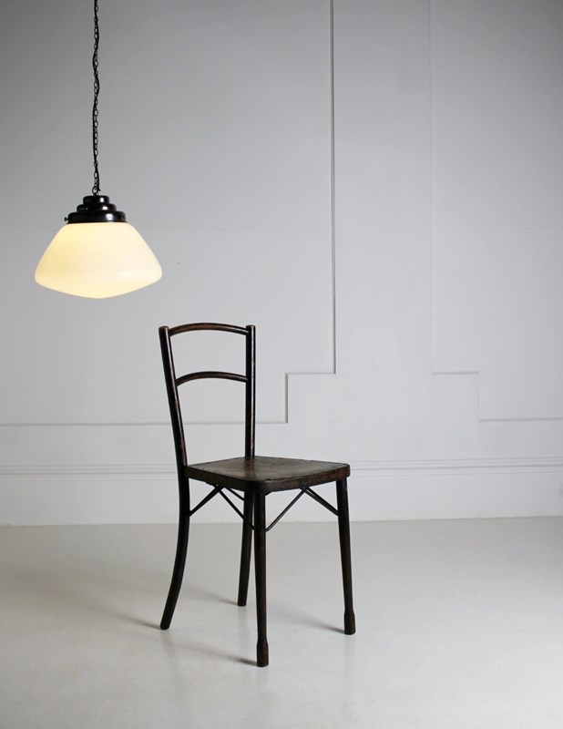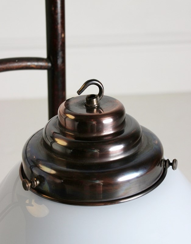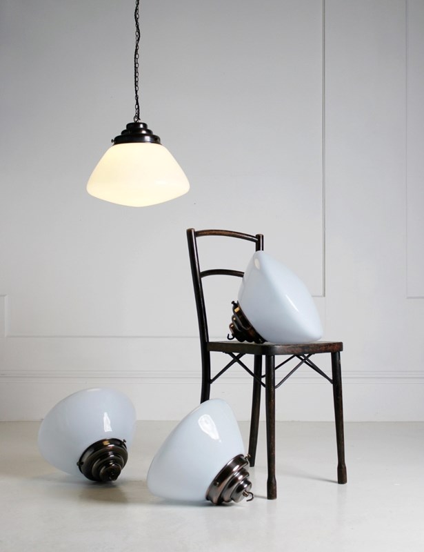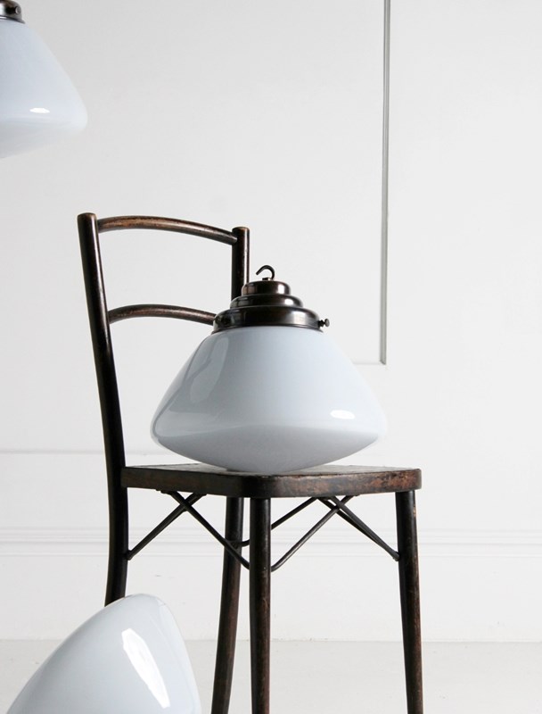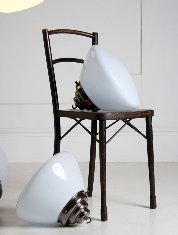 A good run of ealry 20th century opaline pendant lights with stepped copper galleries.