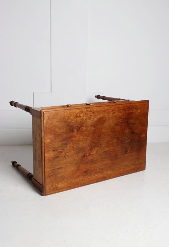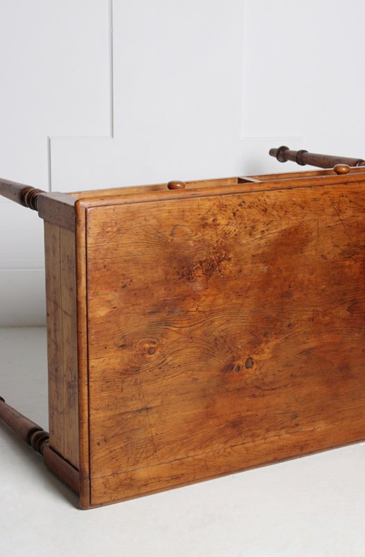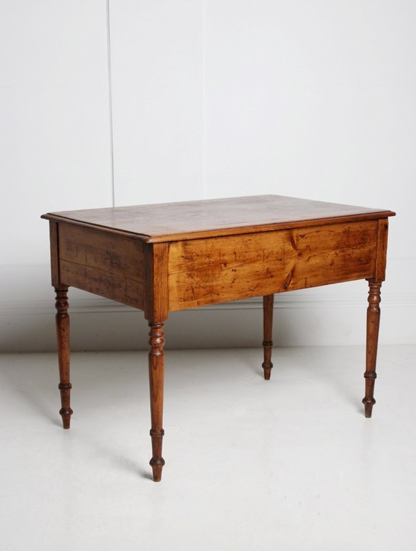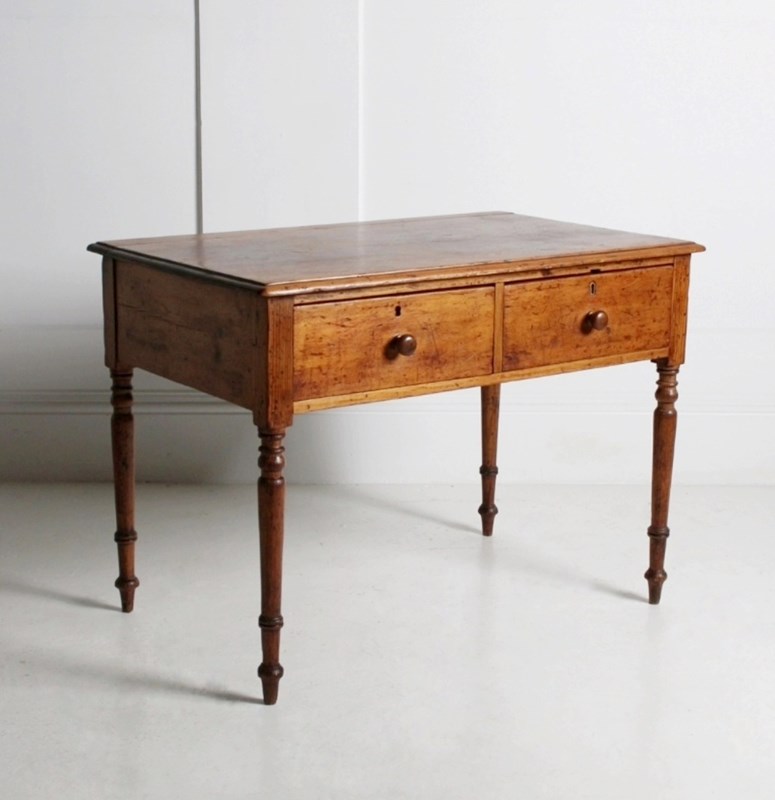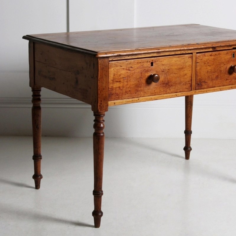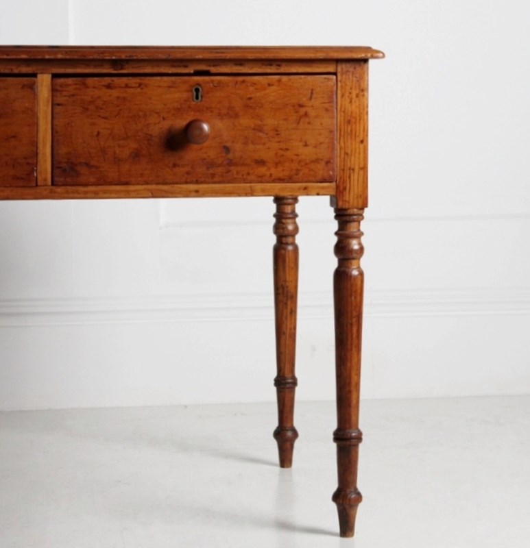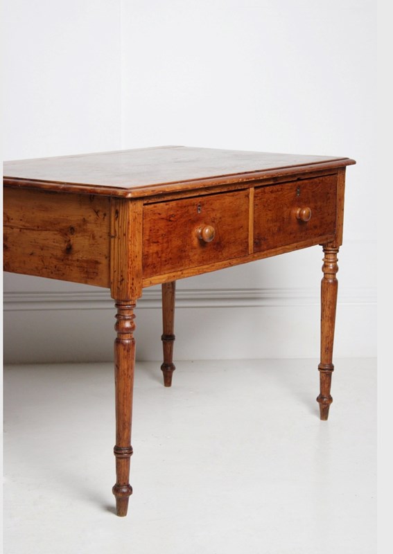A 19th century farmhouse table in pine, two deep drawers with soft honey colour, resting on slender turned legs.